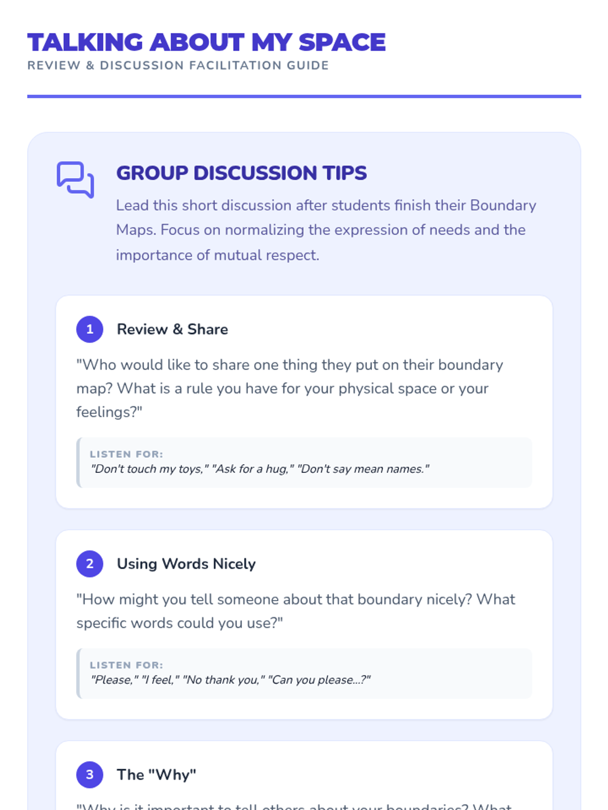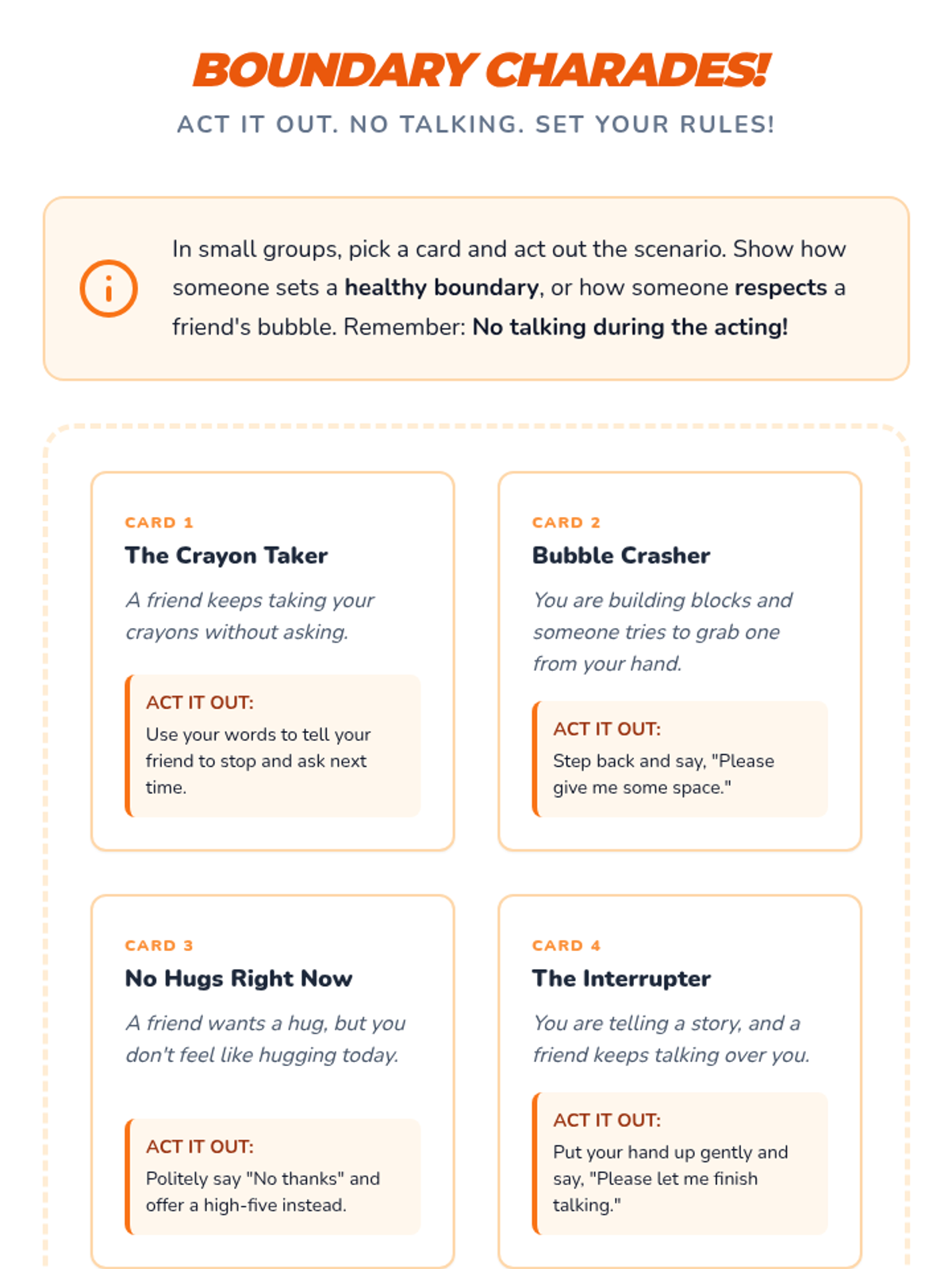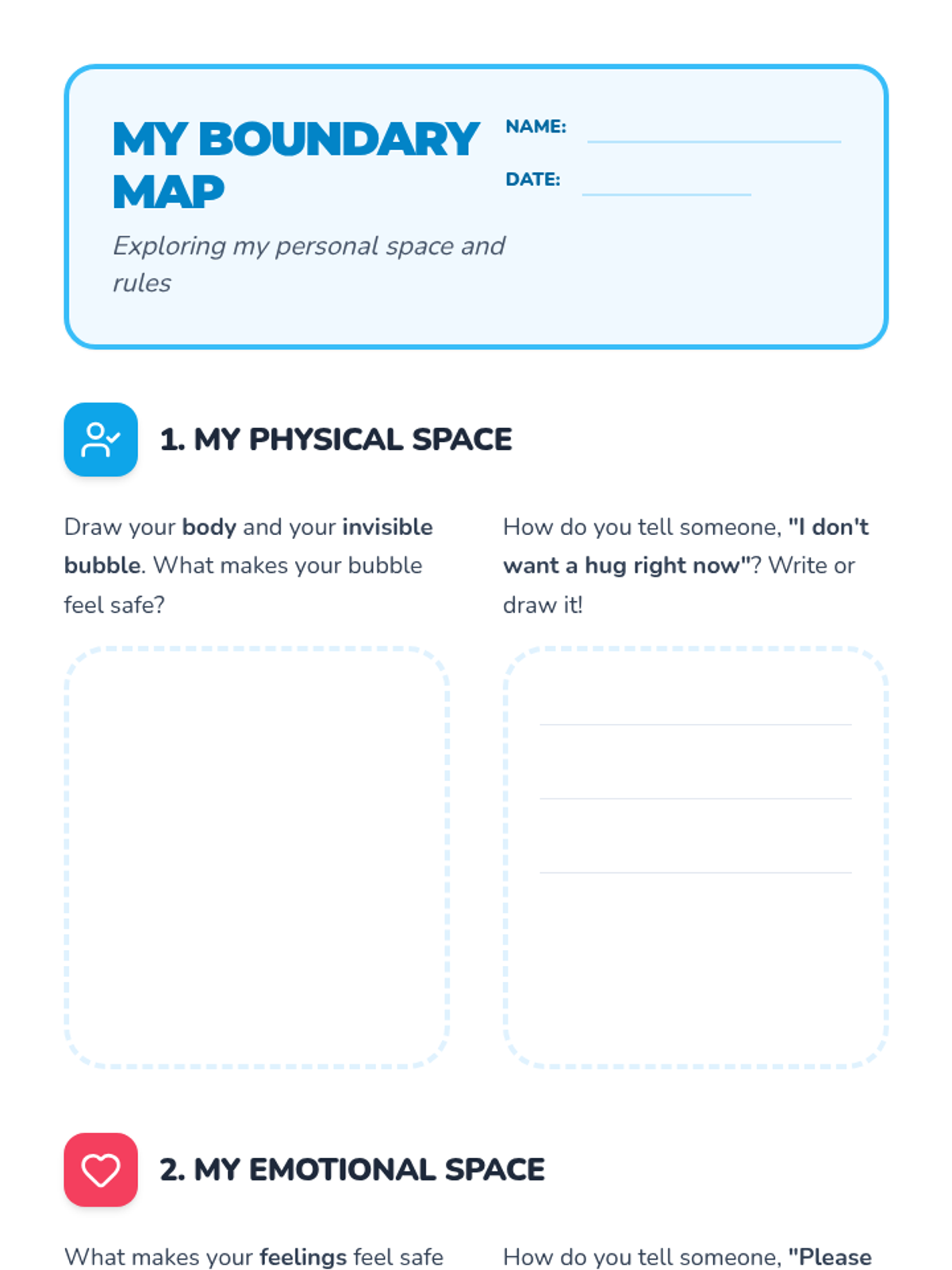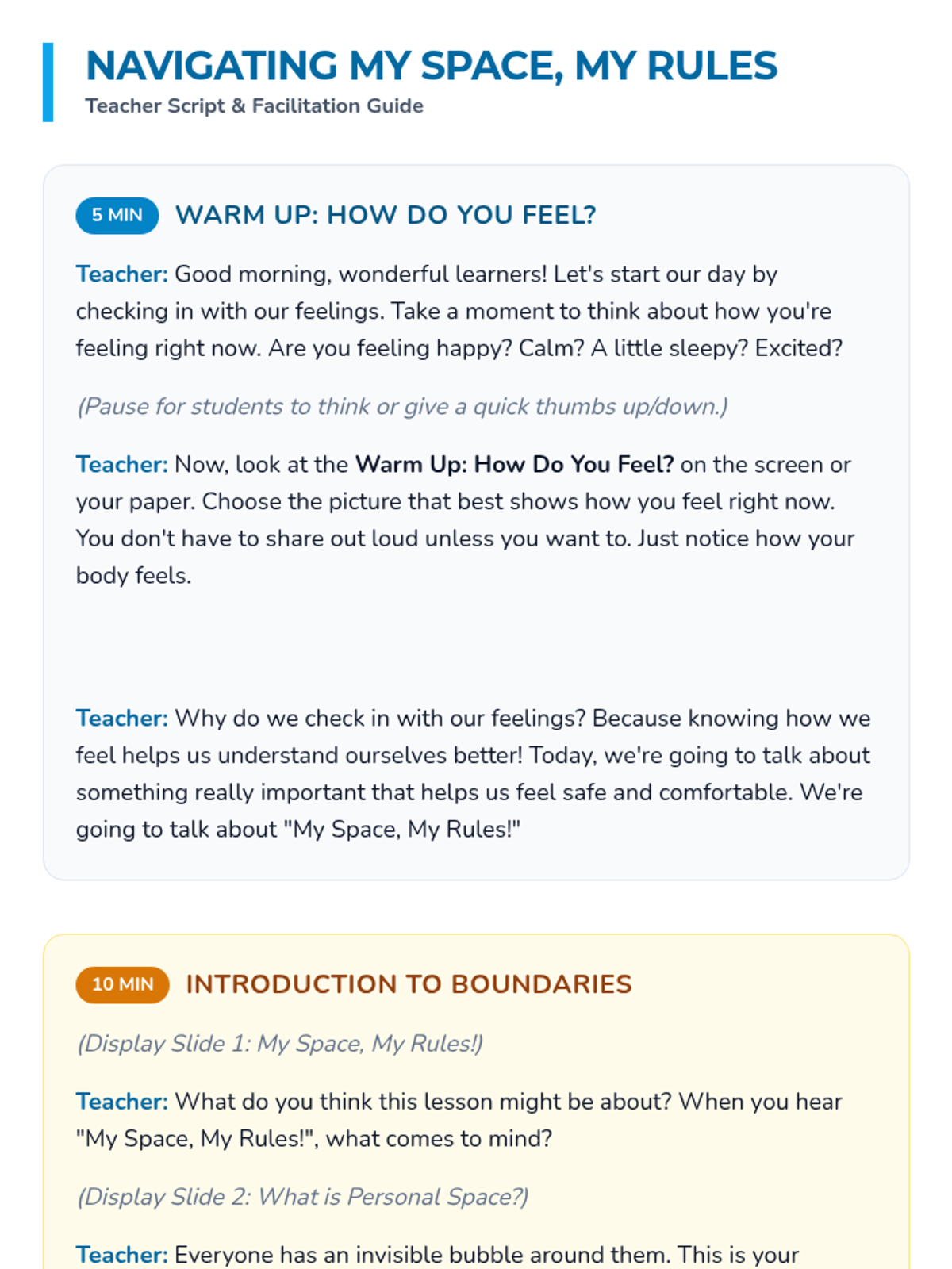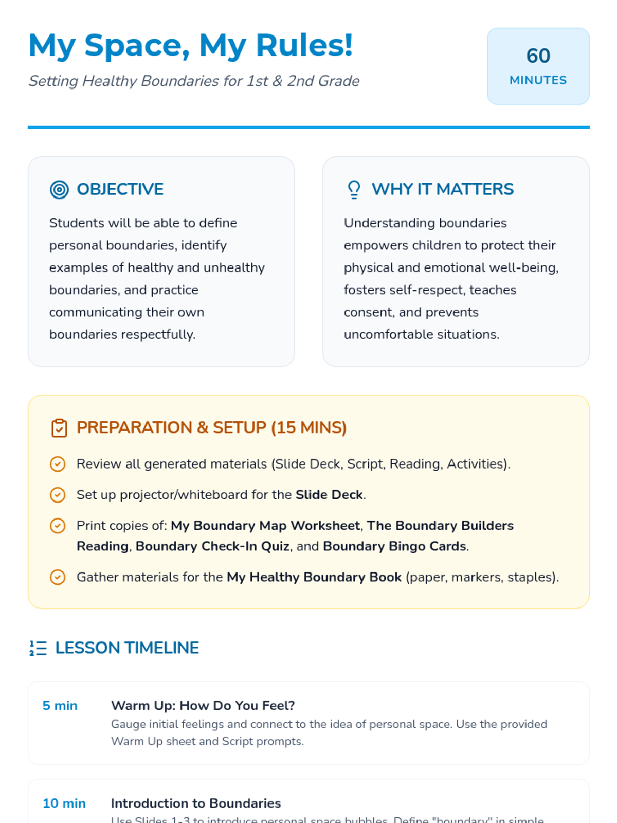 A 60-minute social-emotional learning lesson for 1st and 2nd graders on understanding personal space, setting healthy boundaries, and respecting others' limits. Students explore these concepts through a slide presentation, interactive story, role-playing charades, and creative mapping.