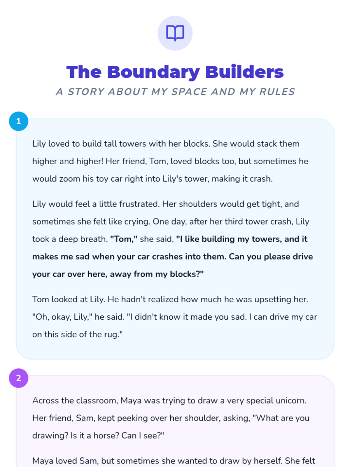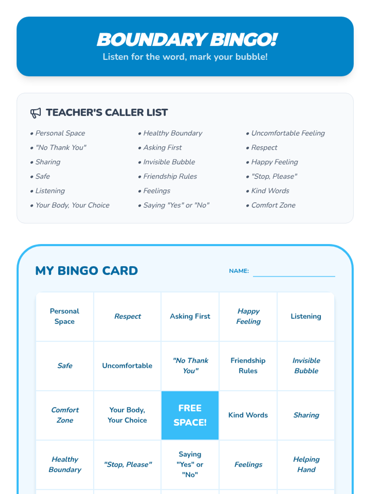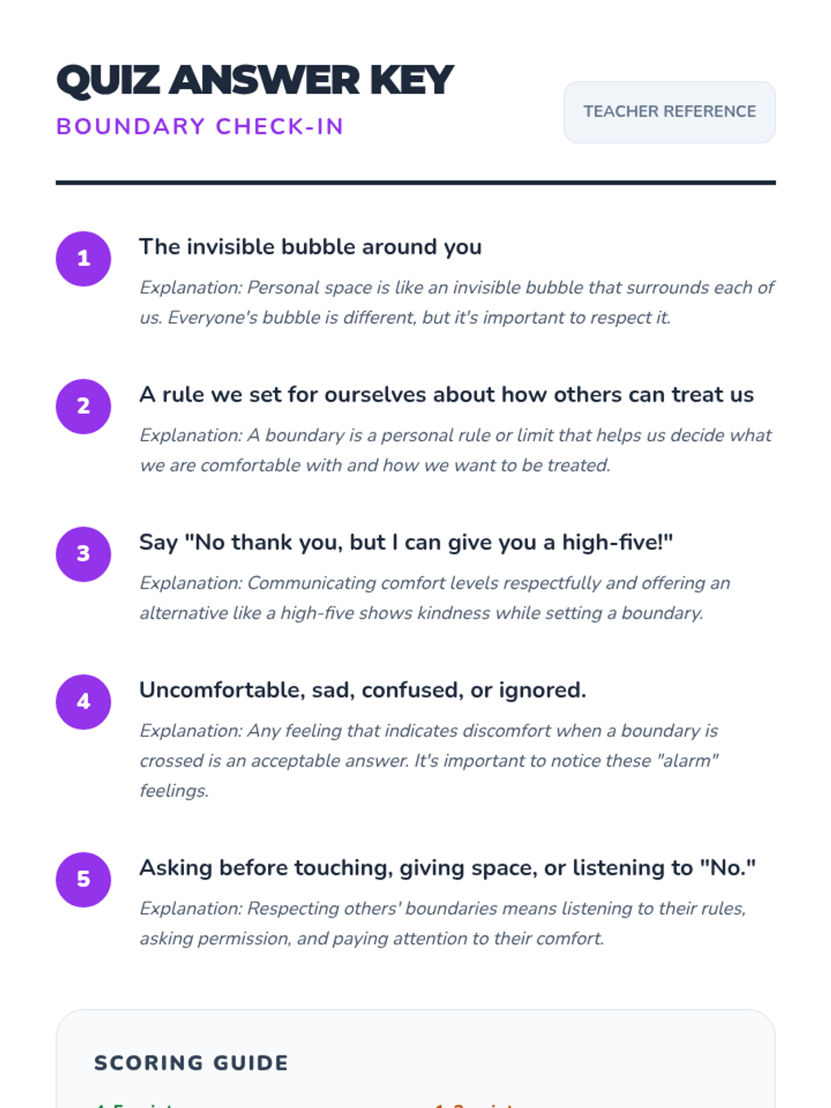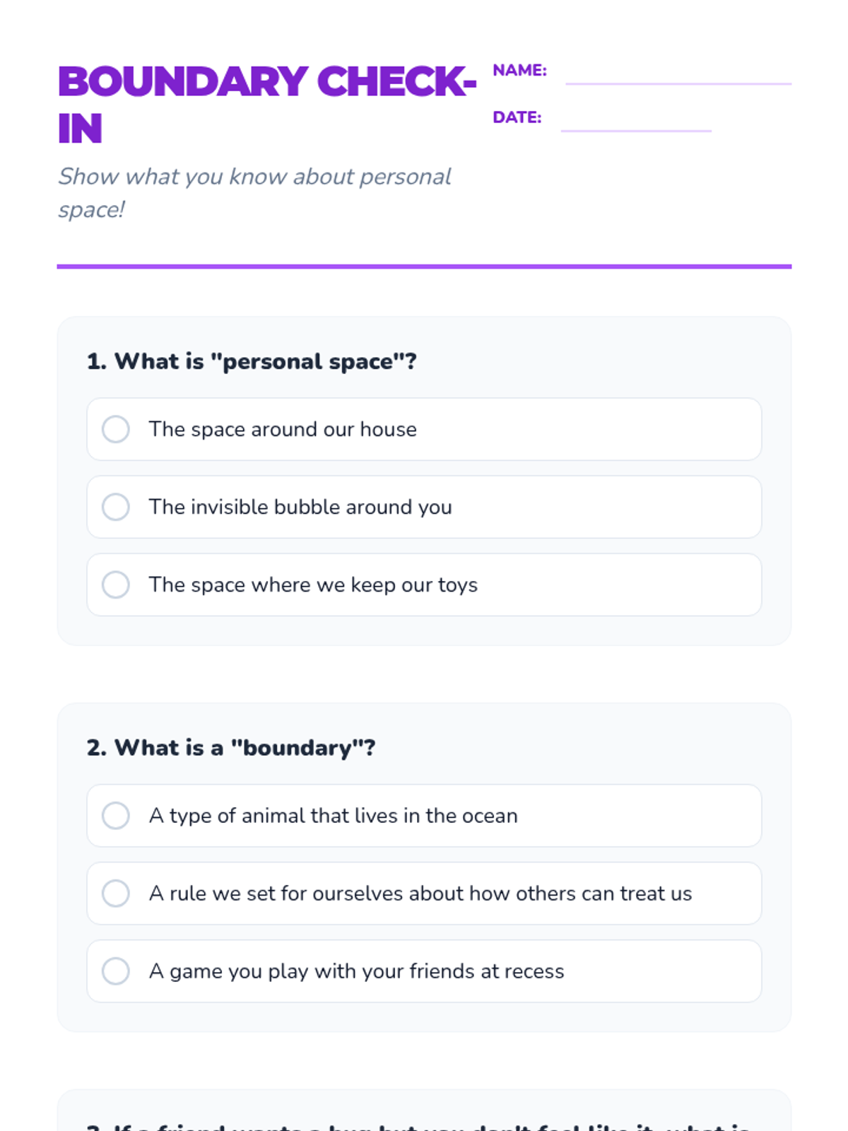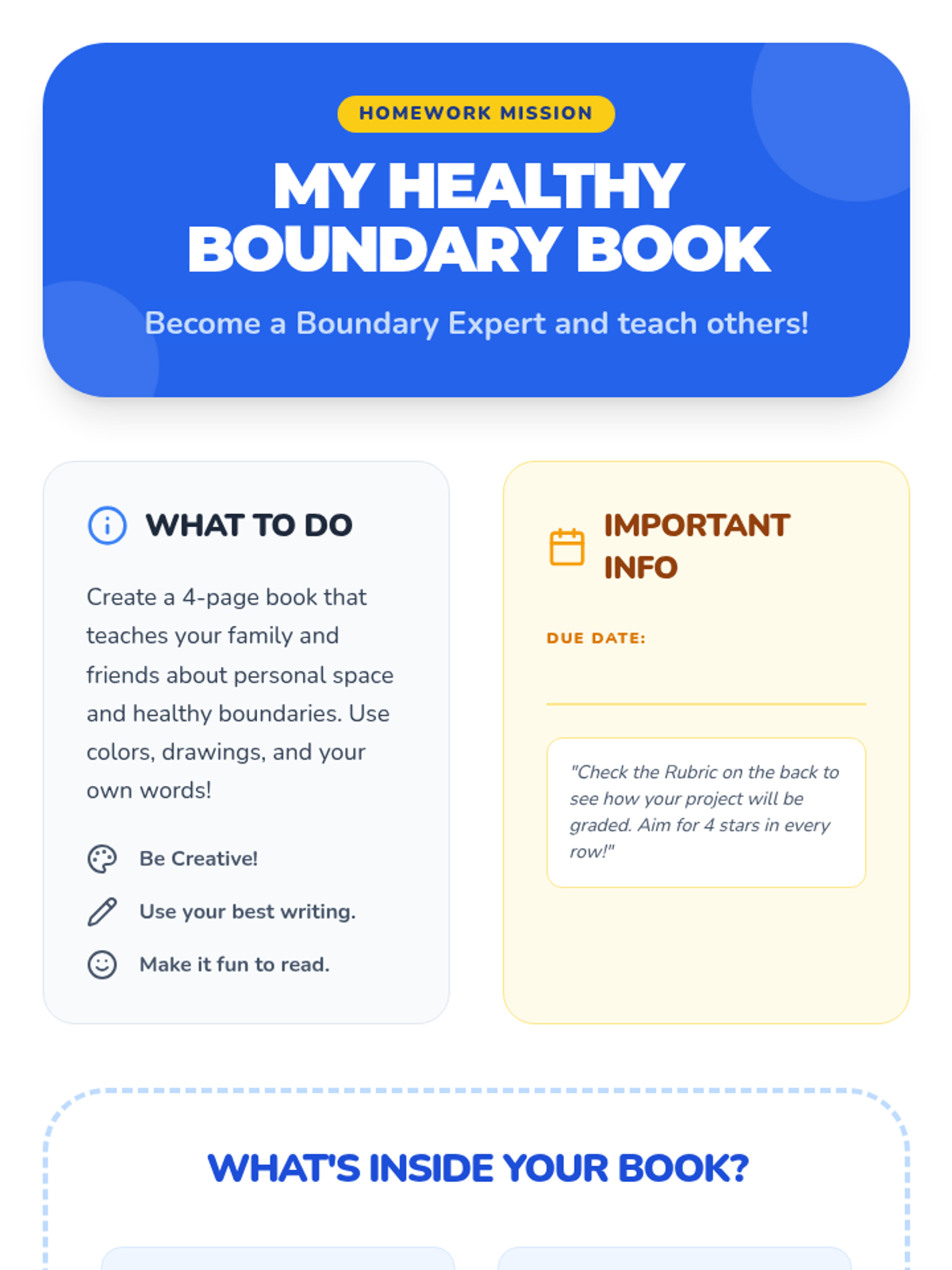 A 60-minute social-emotional learning lesson for 1st and 2nd graders on understanding personal space, setting healthy boundaries, and respecting others' limits. Students explore these concepts through a slide presentation, interactive story, role-playing charades, and creative mapping.