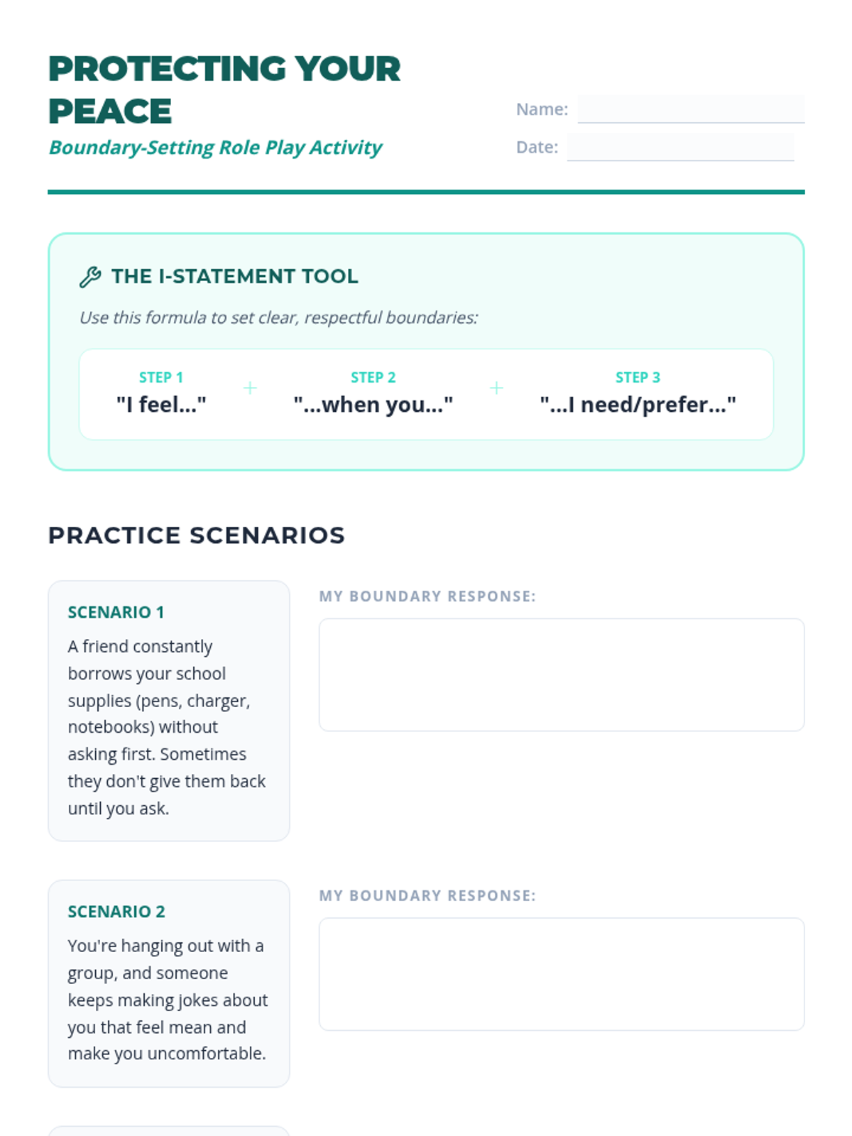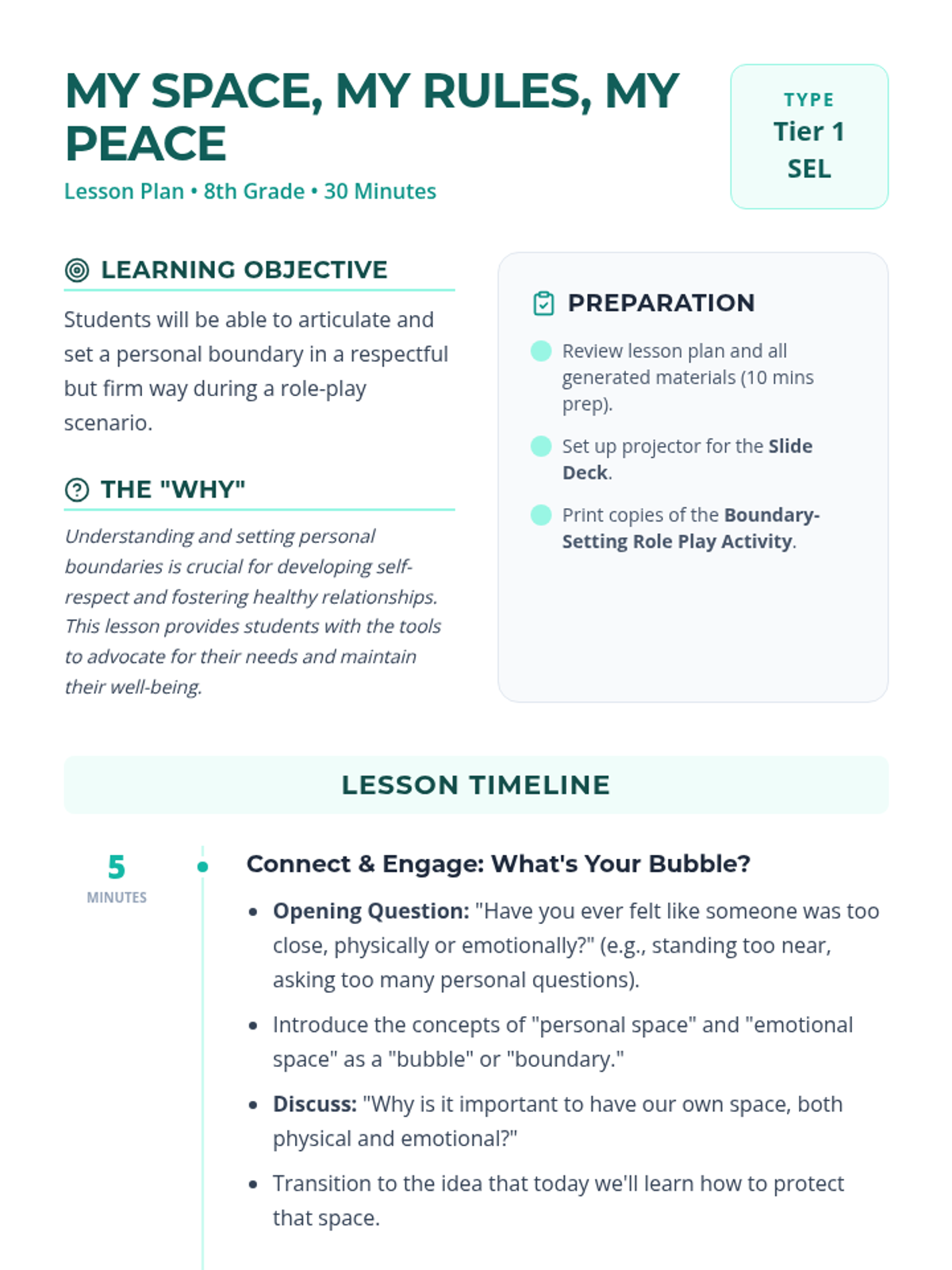 This lesson empowers 8th-grade students to understand, articulate, and set personal boundaries. By exploring the importance of self-respect and healthy relationships, students will gain practical skills in assertiveness.