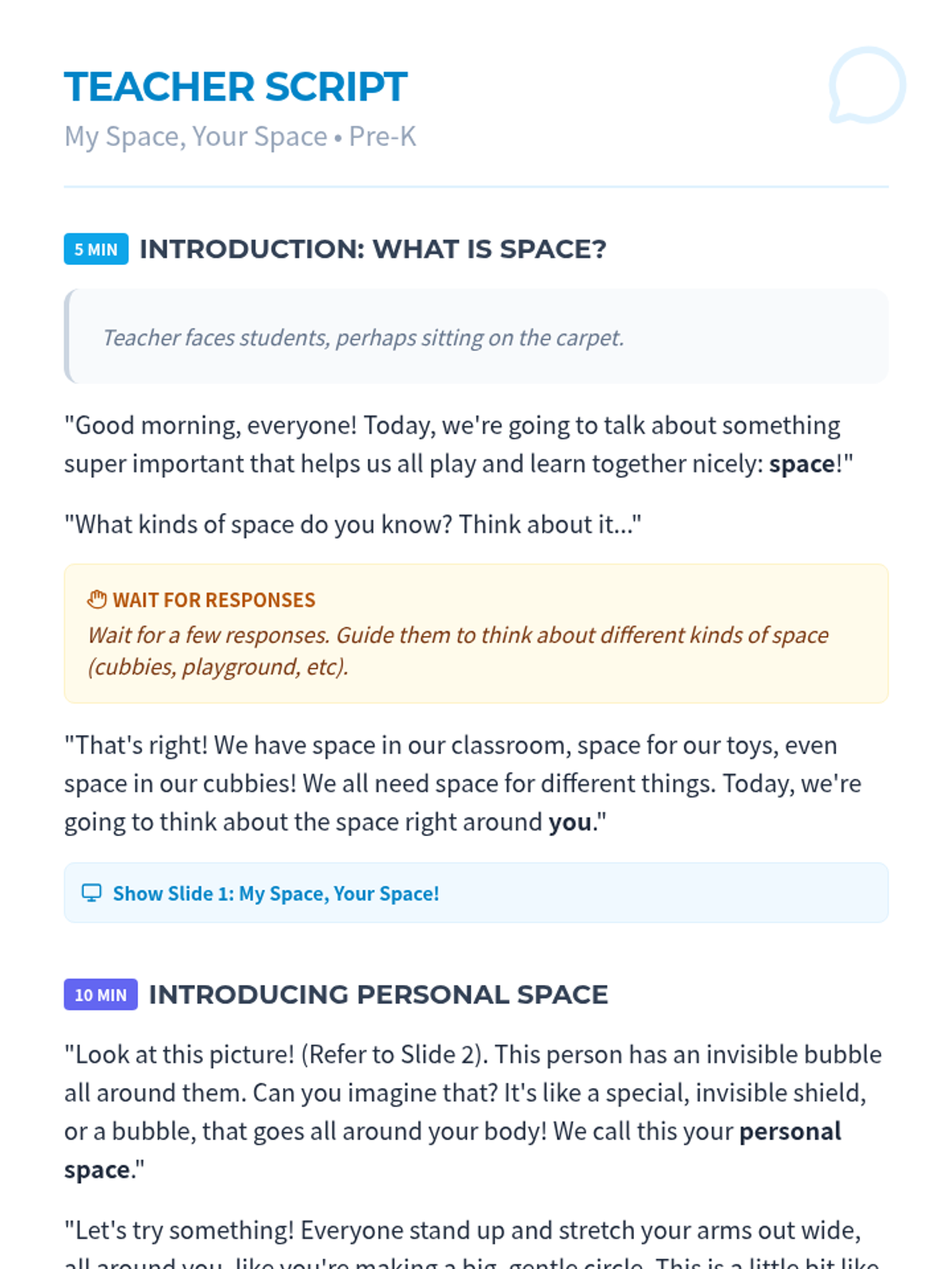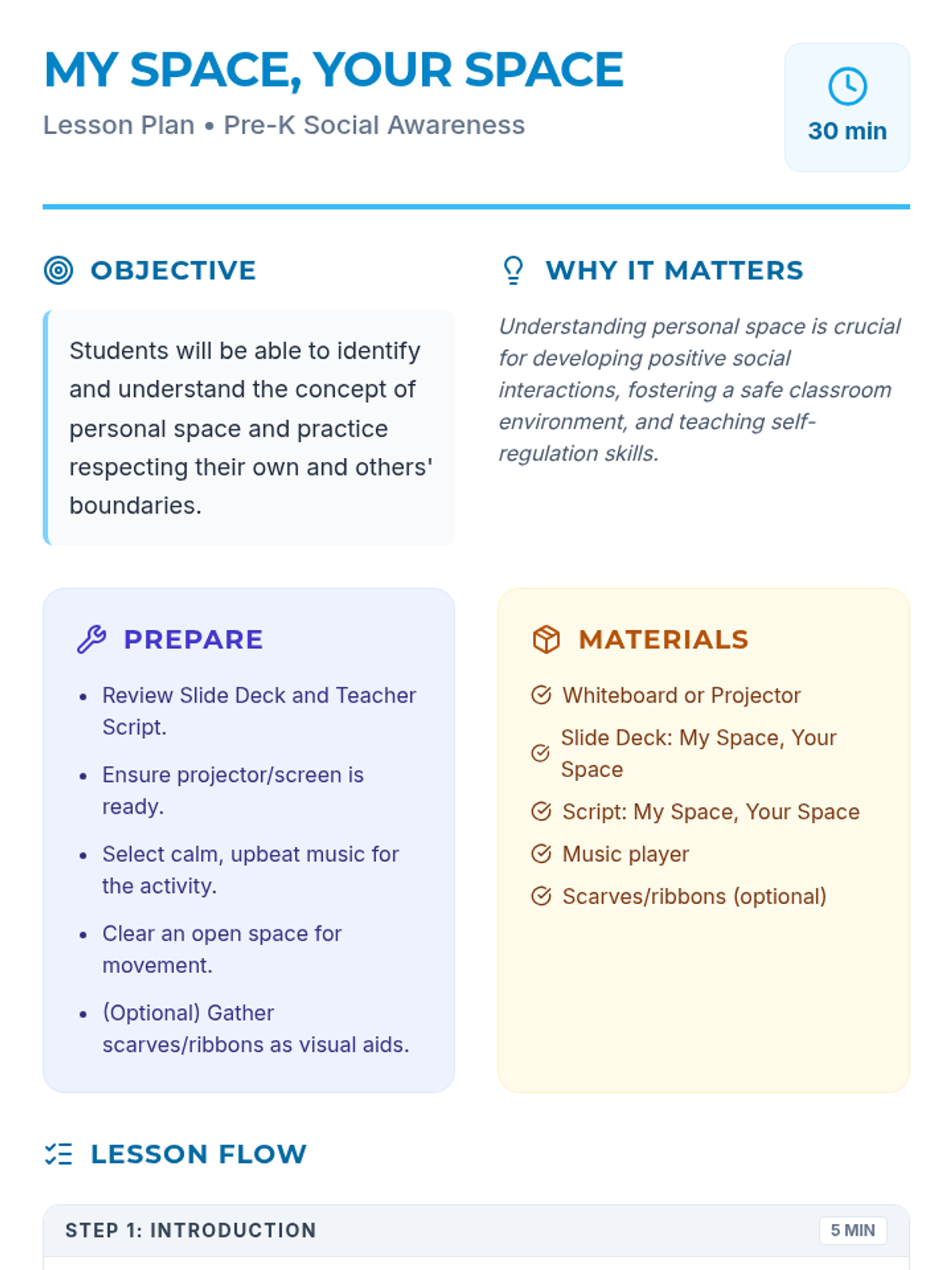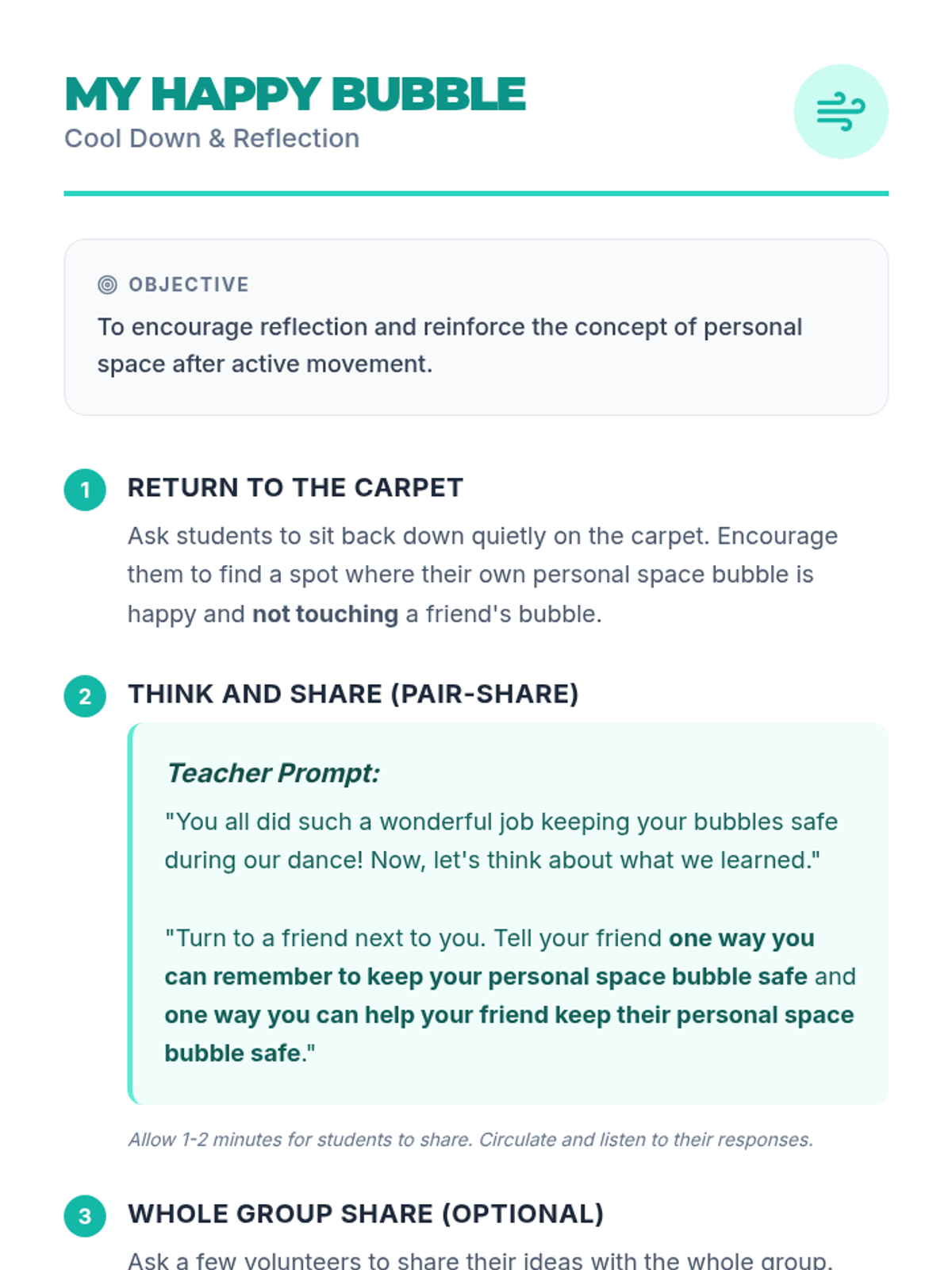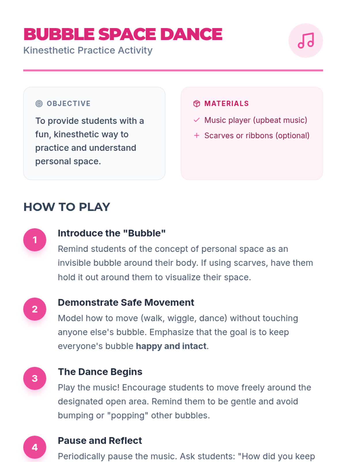A Pre-K lesson introducing the concept of personal space through the metaphor of an invisible bubble, featuring interactive discussion and a movement-based activity.