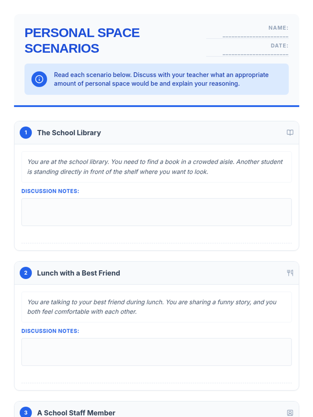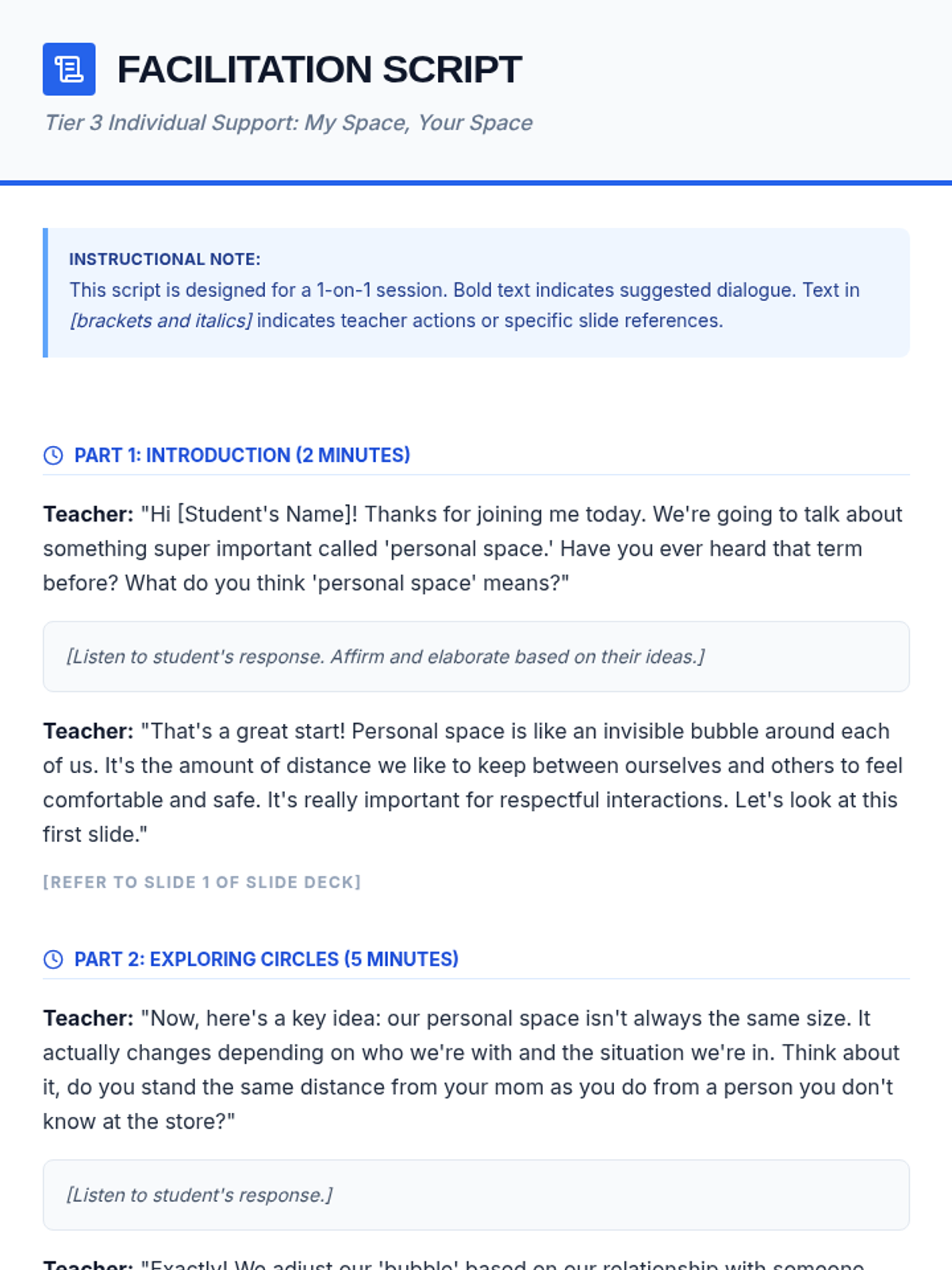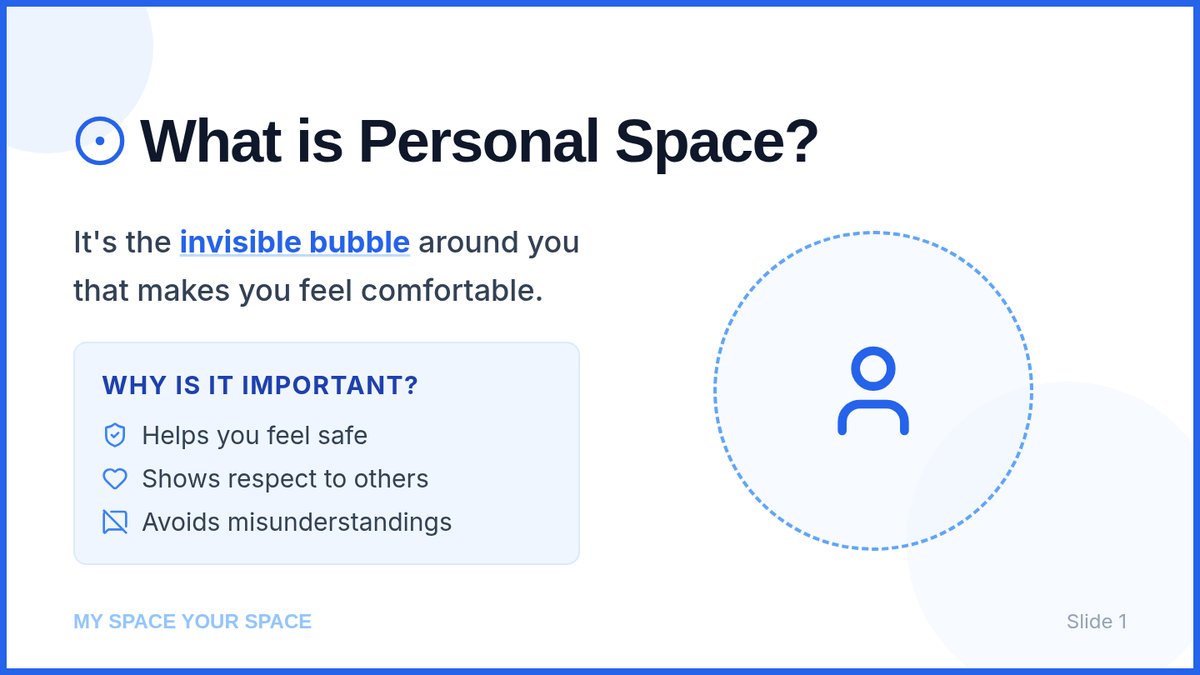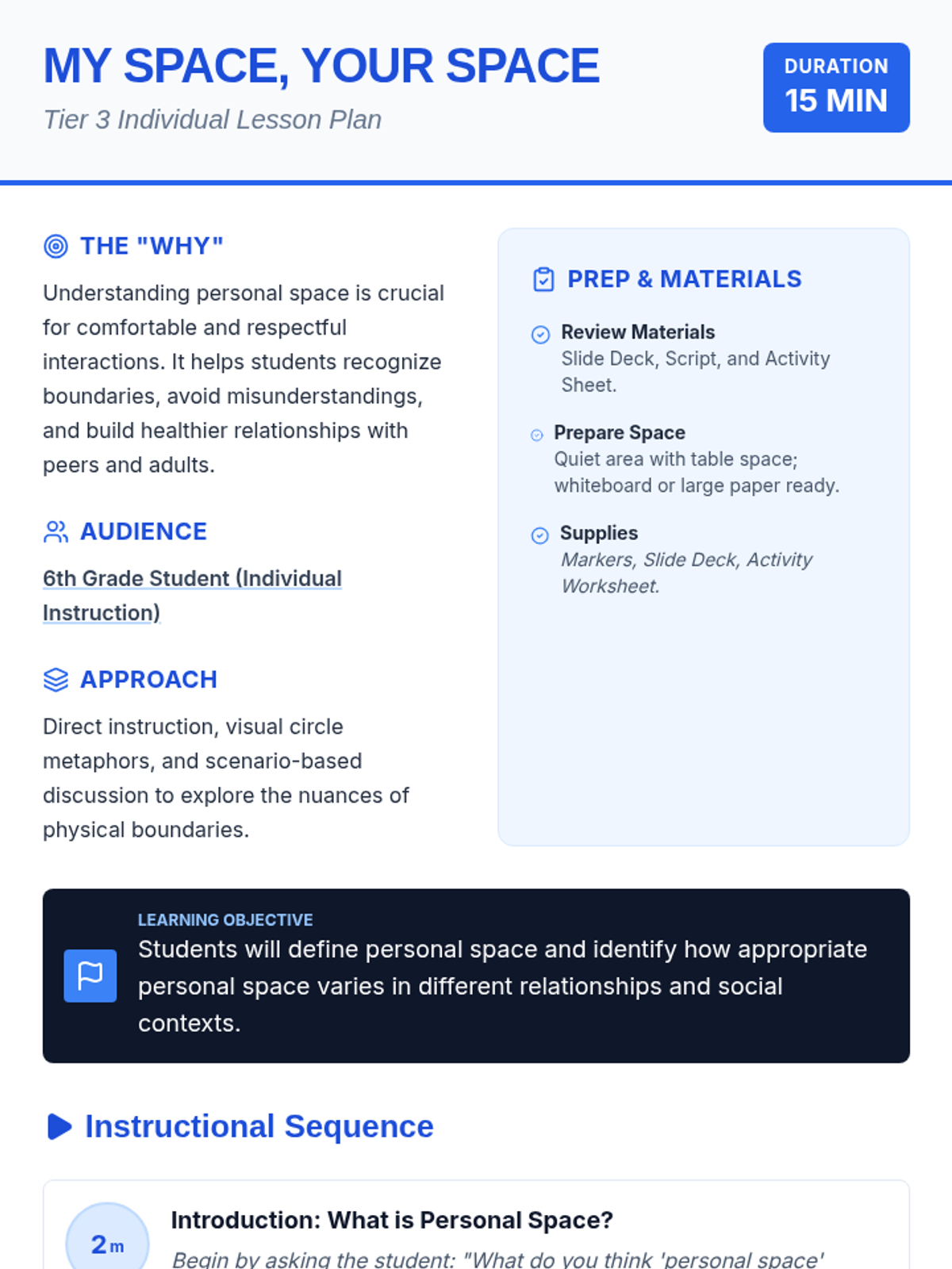 A 15-minute Tier 3 individual lesson for 6th-grade students to understand personal space boundaries, how they change based on relationships, and how to navigate social interactions respectfully.