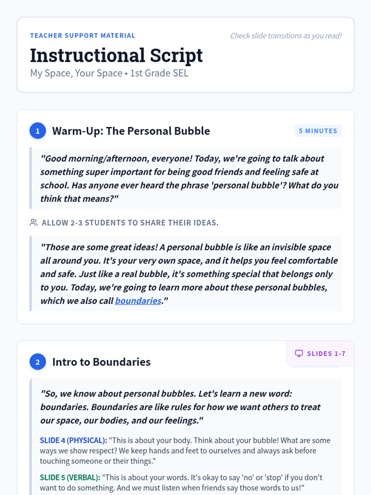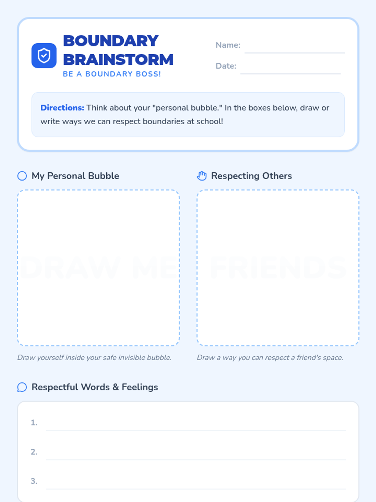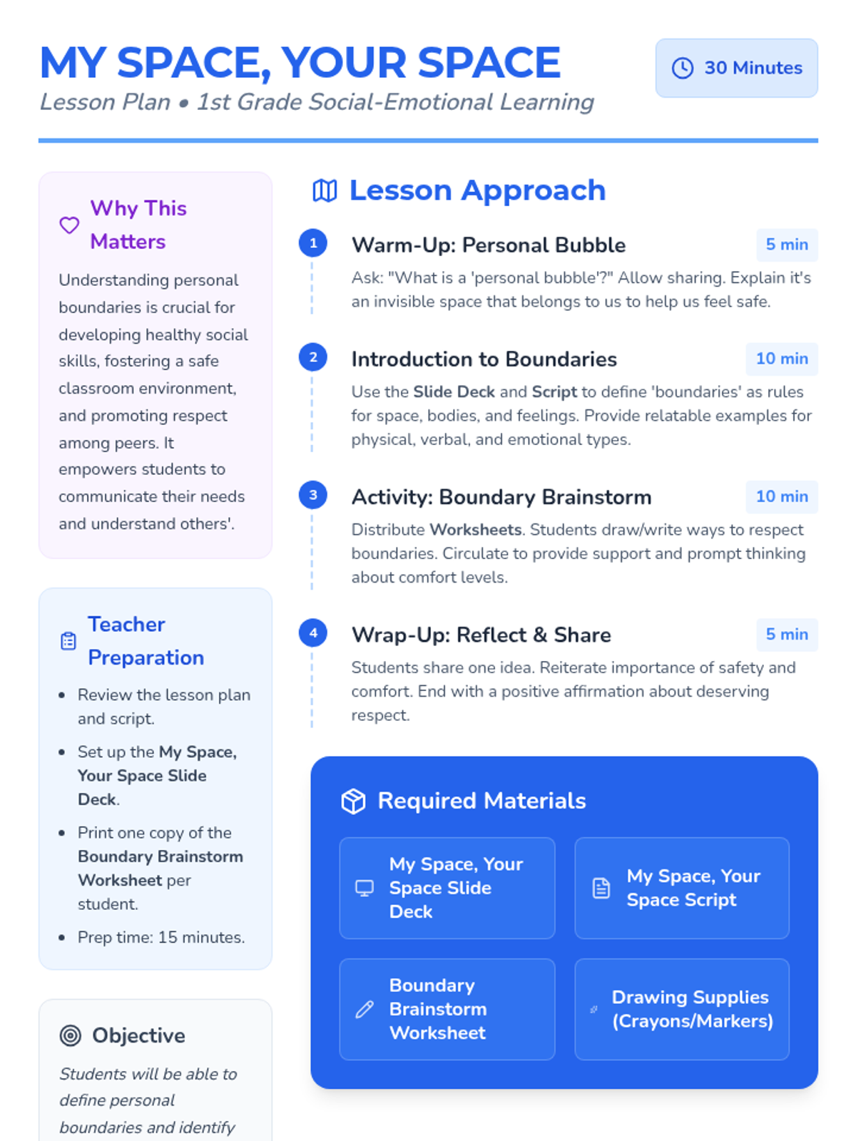 A 30-minute lesson for 1st-grade students introducing personal boundaries through the 'personal bubble' metaphor, focusing on physical, verbal, and emotional respect.