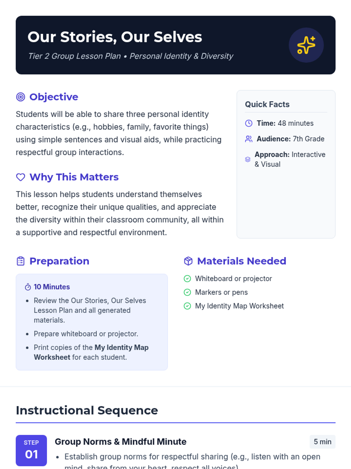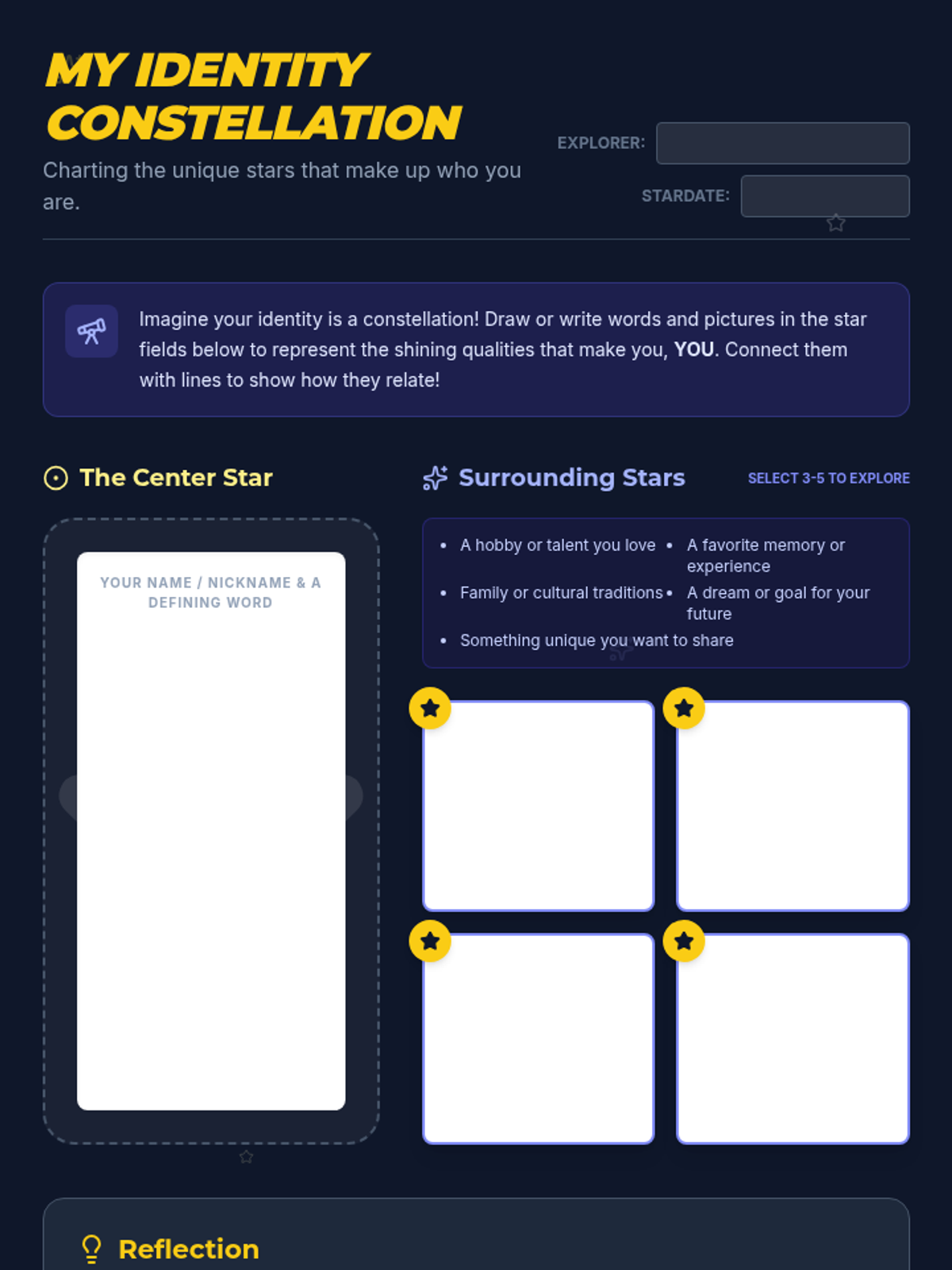 A 48-minute Tier 2 group lesson for 7th graders to explore personal identity through a constellation-themed mapping activity, fostering self-expression and classroom community.