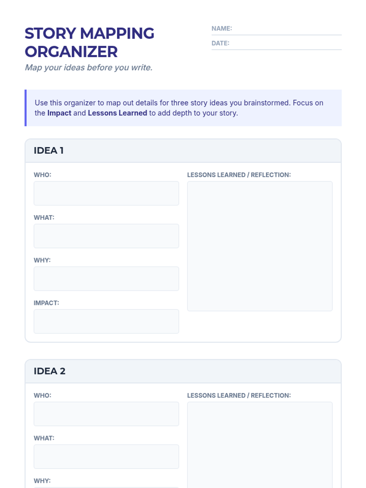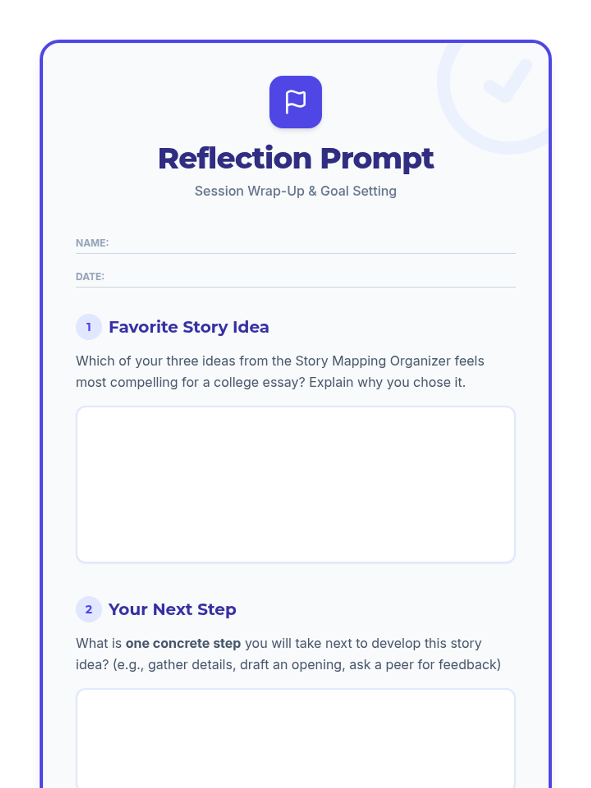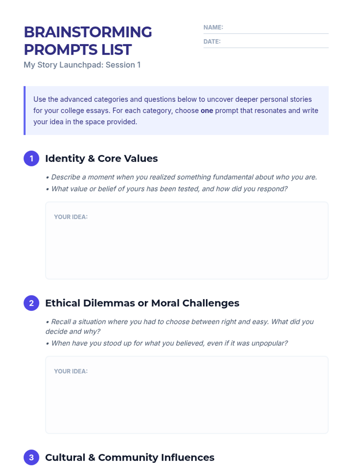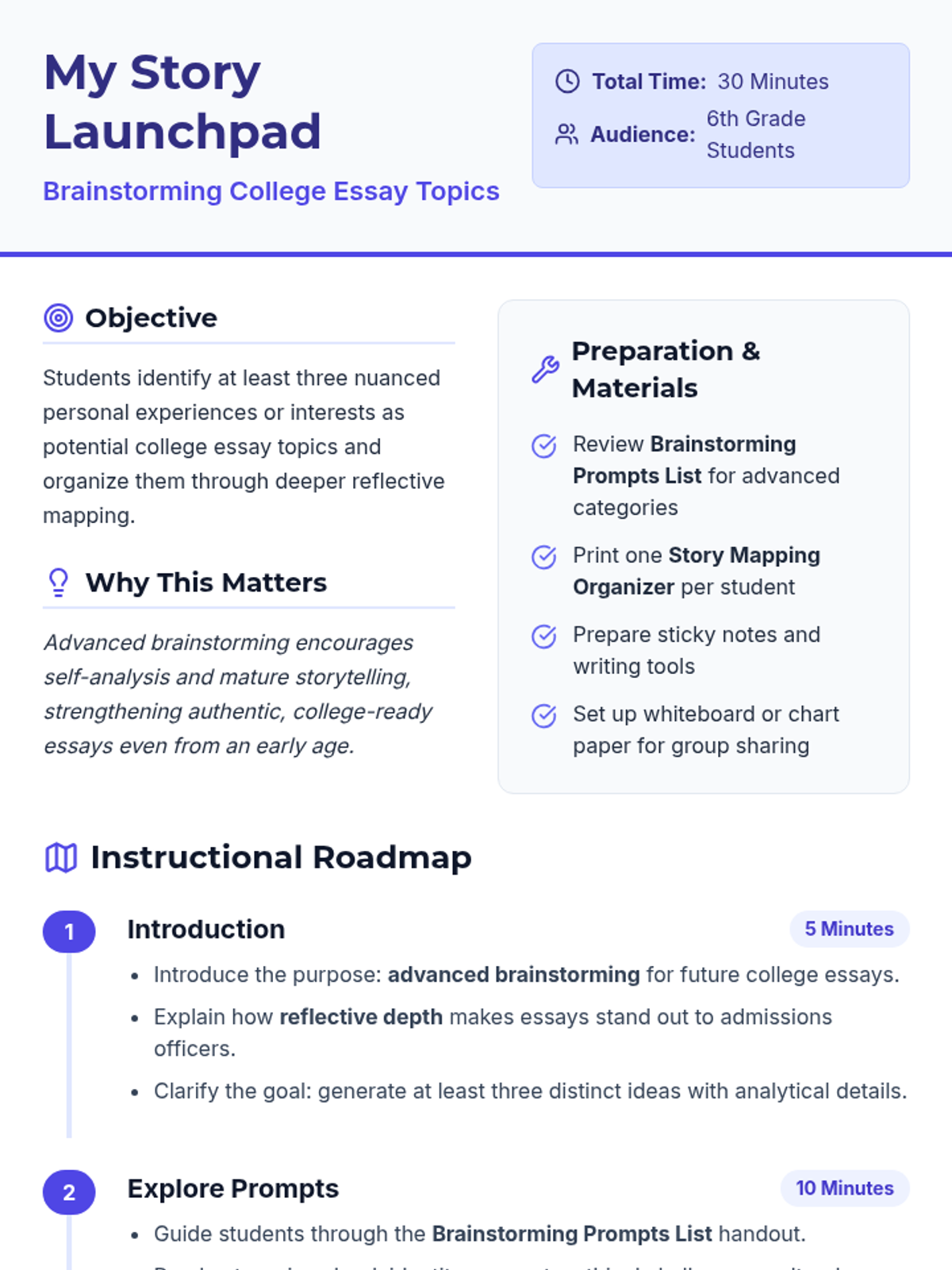 A foundational brainstorming session for 6th-grade students to identify and organize personal stories for future college essays, focusing on self-awareness and reflective storytelling.