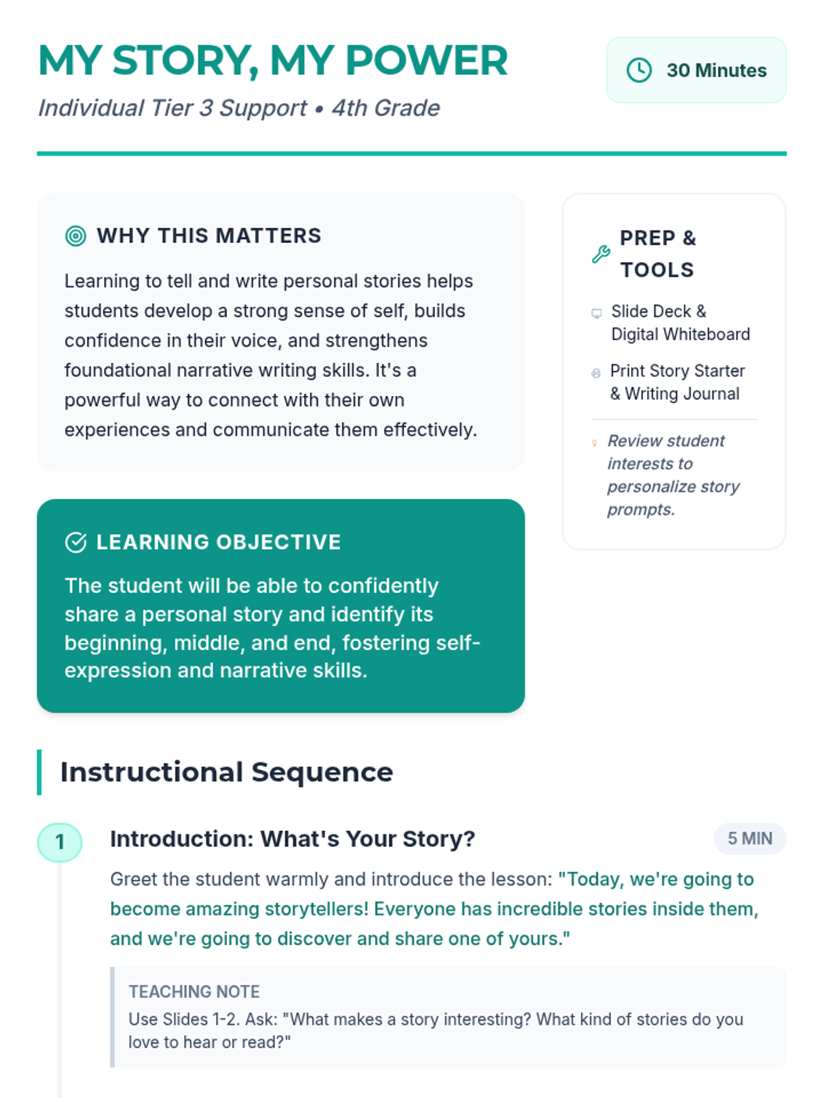 A 30-minute, individualized 4th-grade lesson that empowers students to share their personal narratives, fostering self-expression and building narrative writing confidence.