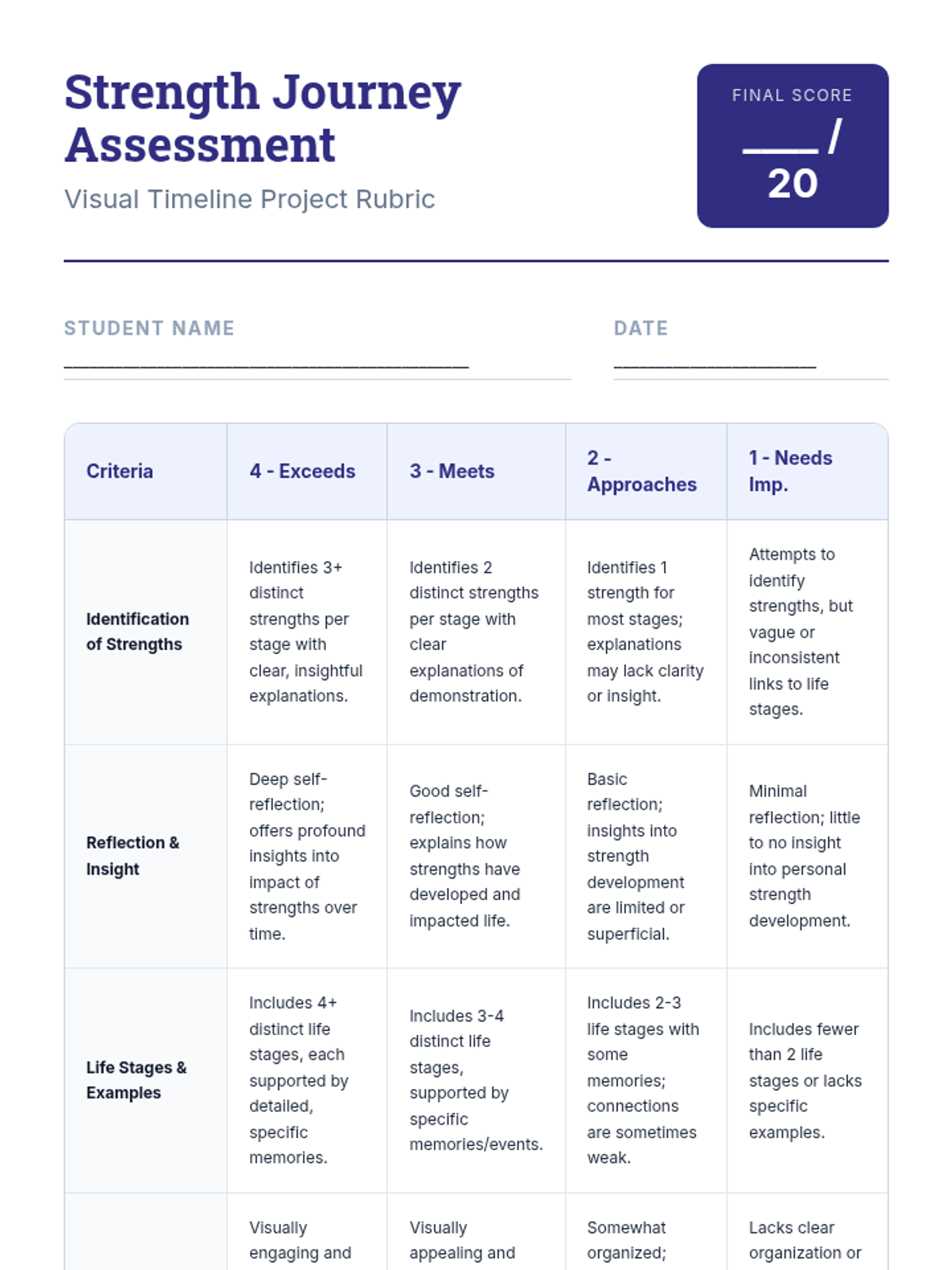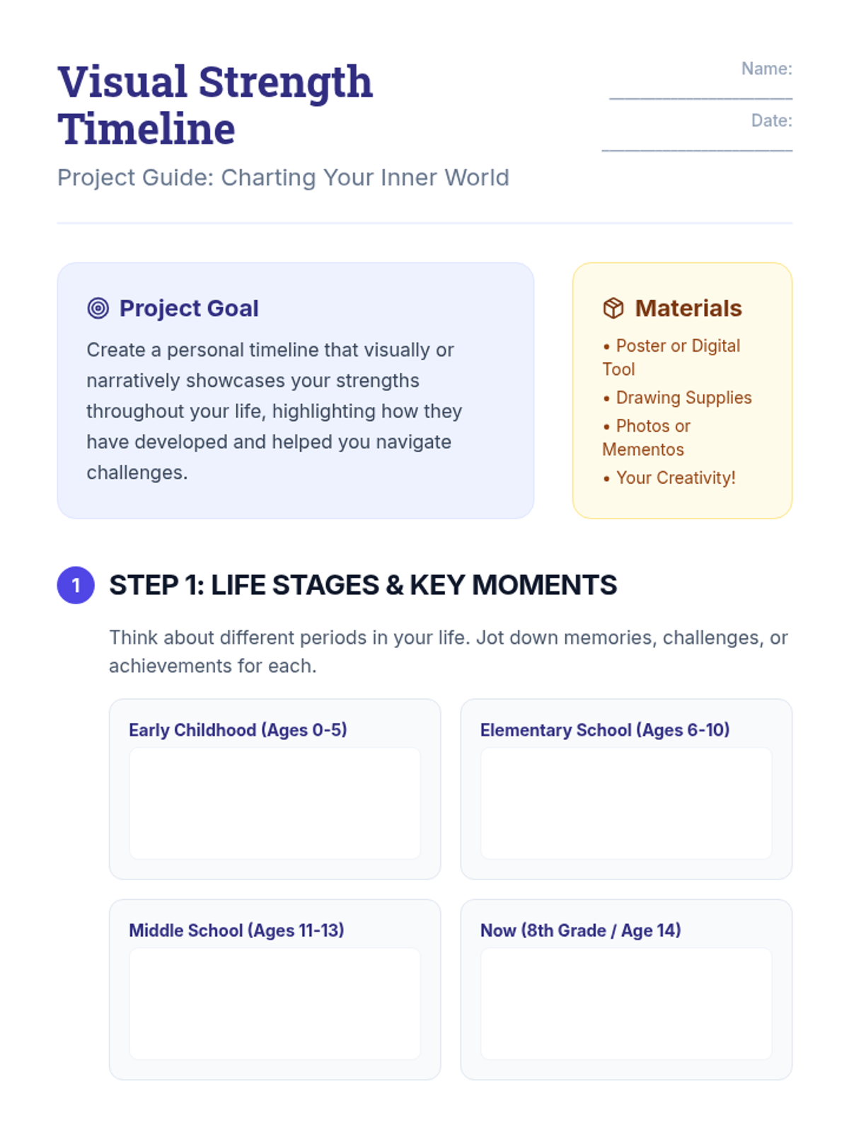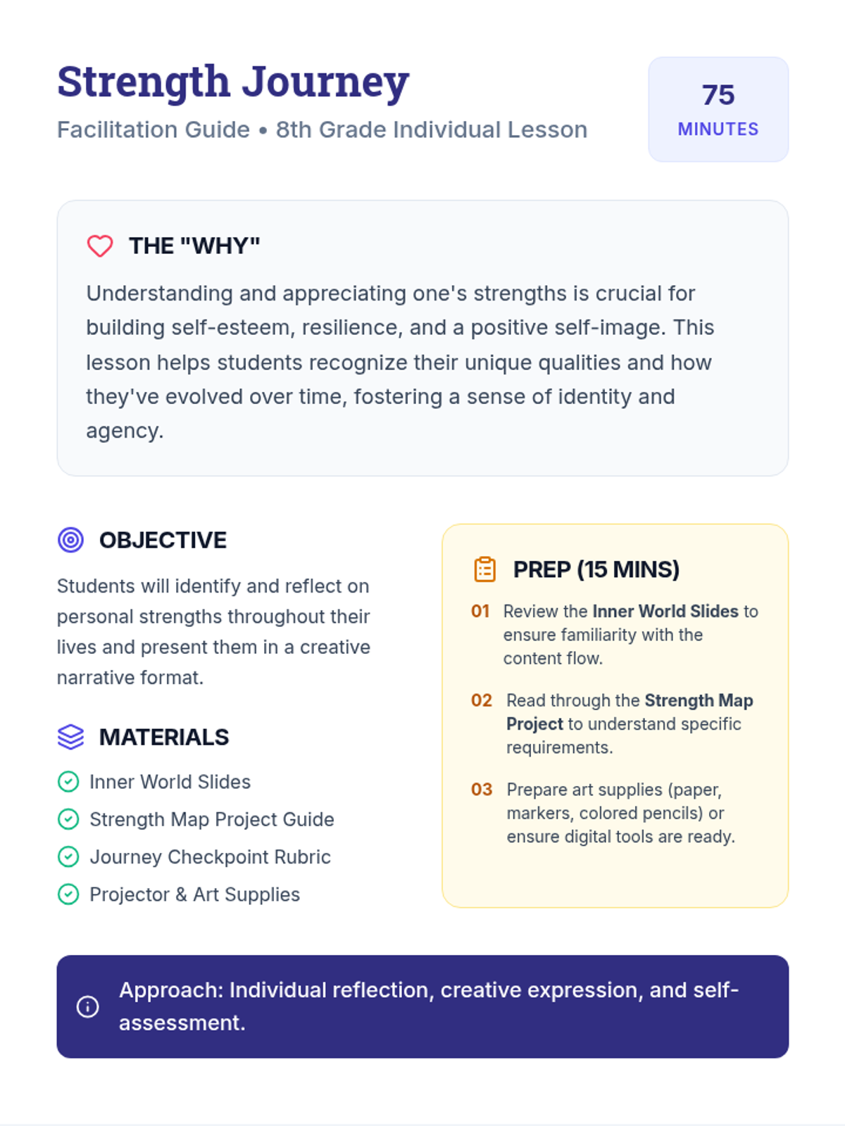 A powerful self-reflection lesson for 8th-grade students to identify, track, and celebrate their personal strengths through a visual or written narrative. This Tier 3 individual session fosters resilience, self-esteem, and a positive identity by charting personal growth over time.