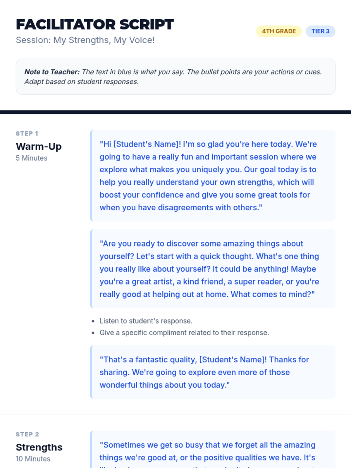 A 30-minute Tier 3 social-emotional learning lesson for 4th-grade students focused on building self-awareness, identifying personal strengths, and developing calm communication strategies for conflict resolution.