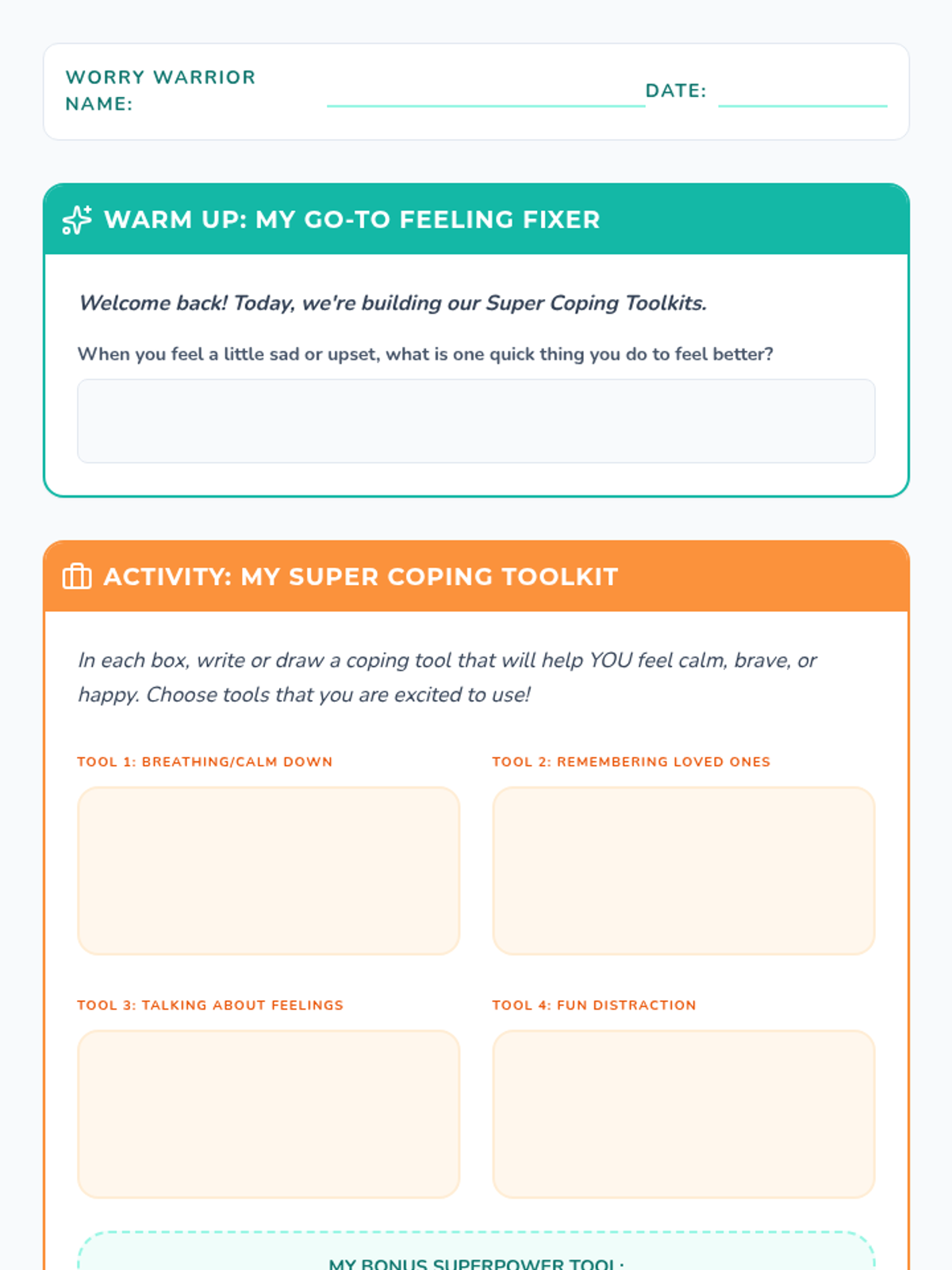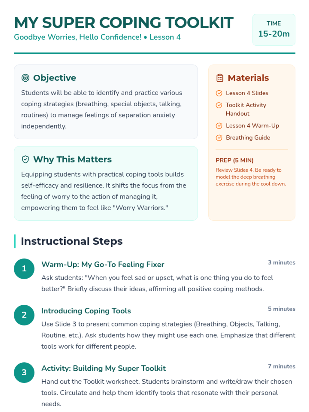 Empowers students to build a personalized toolkit of coping strategies like deep breathing, routines, and talking to others.
