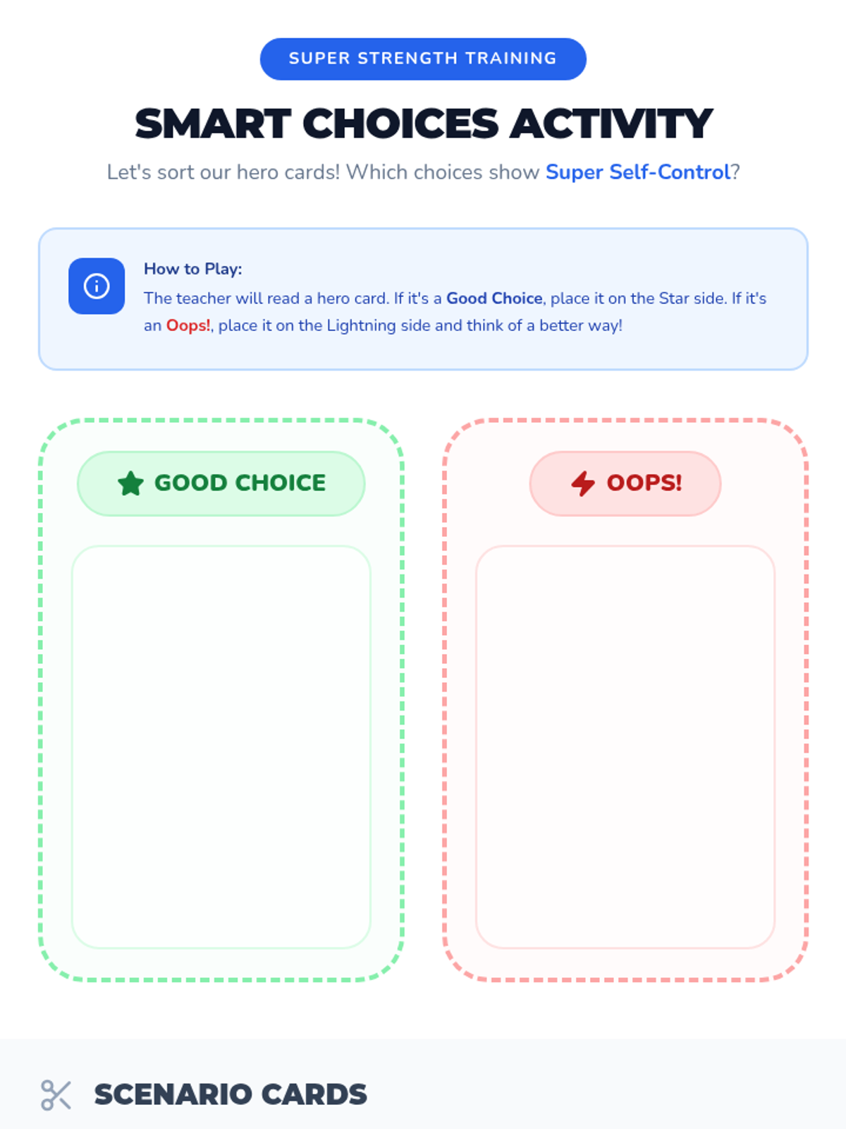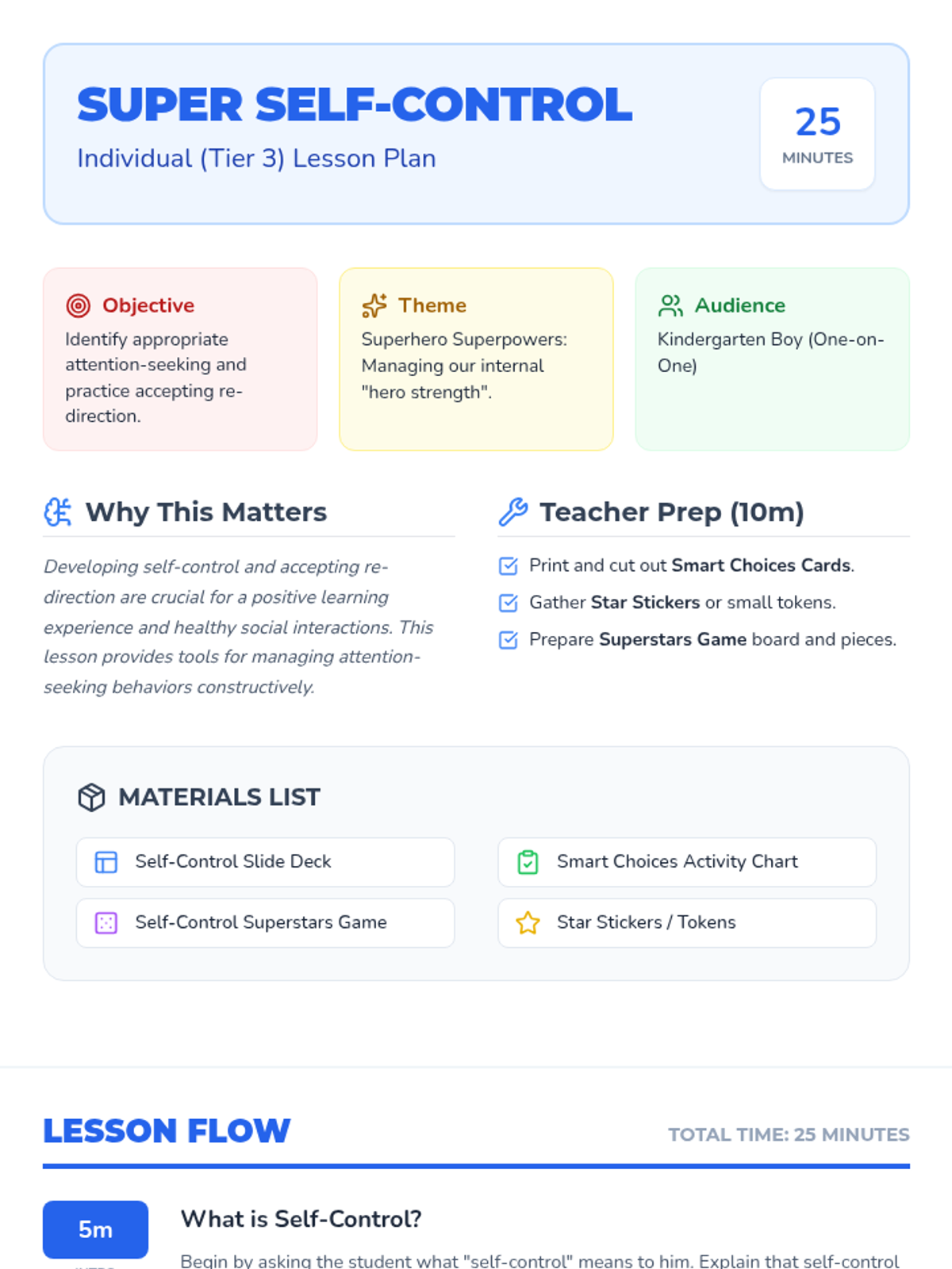 A 25-minute individualized lesson for Kindergarten students to develop self-control, practice appropriate attention-seeking behaviors, and accept adult redirection through a superhero-themed approach.