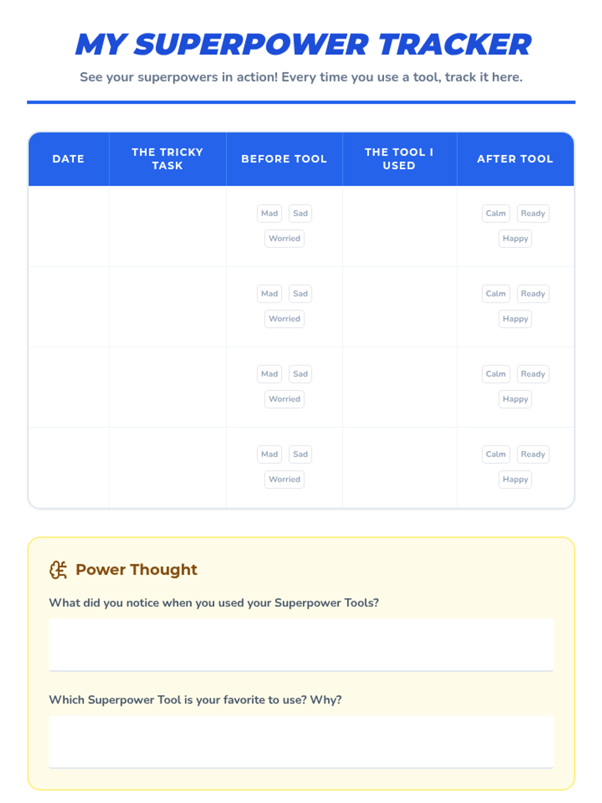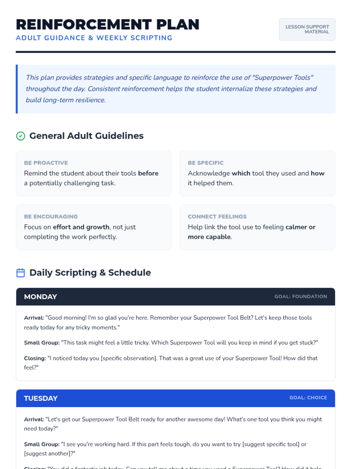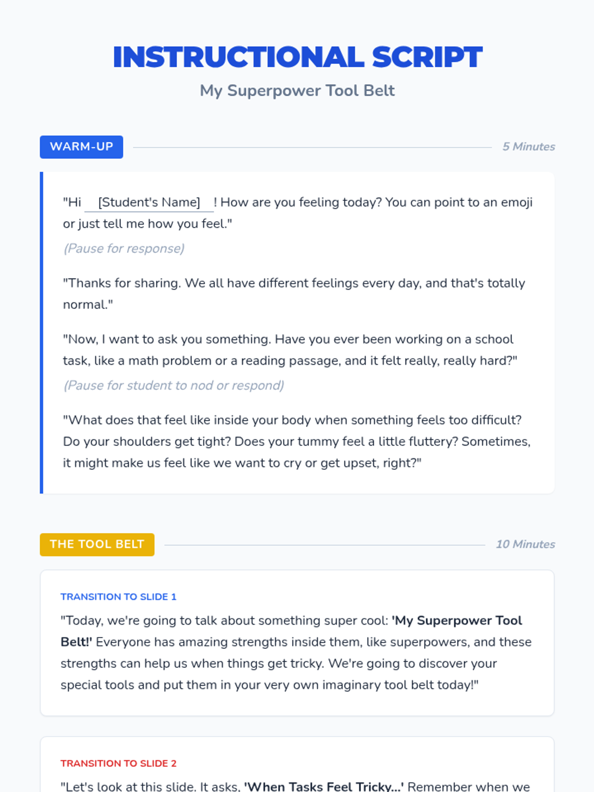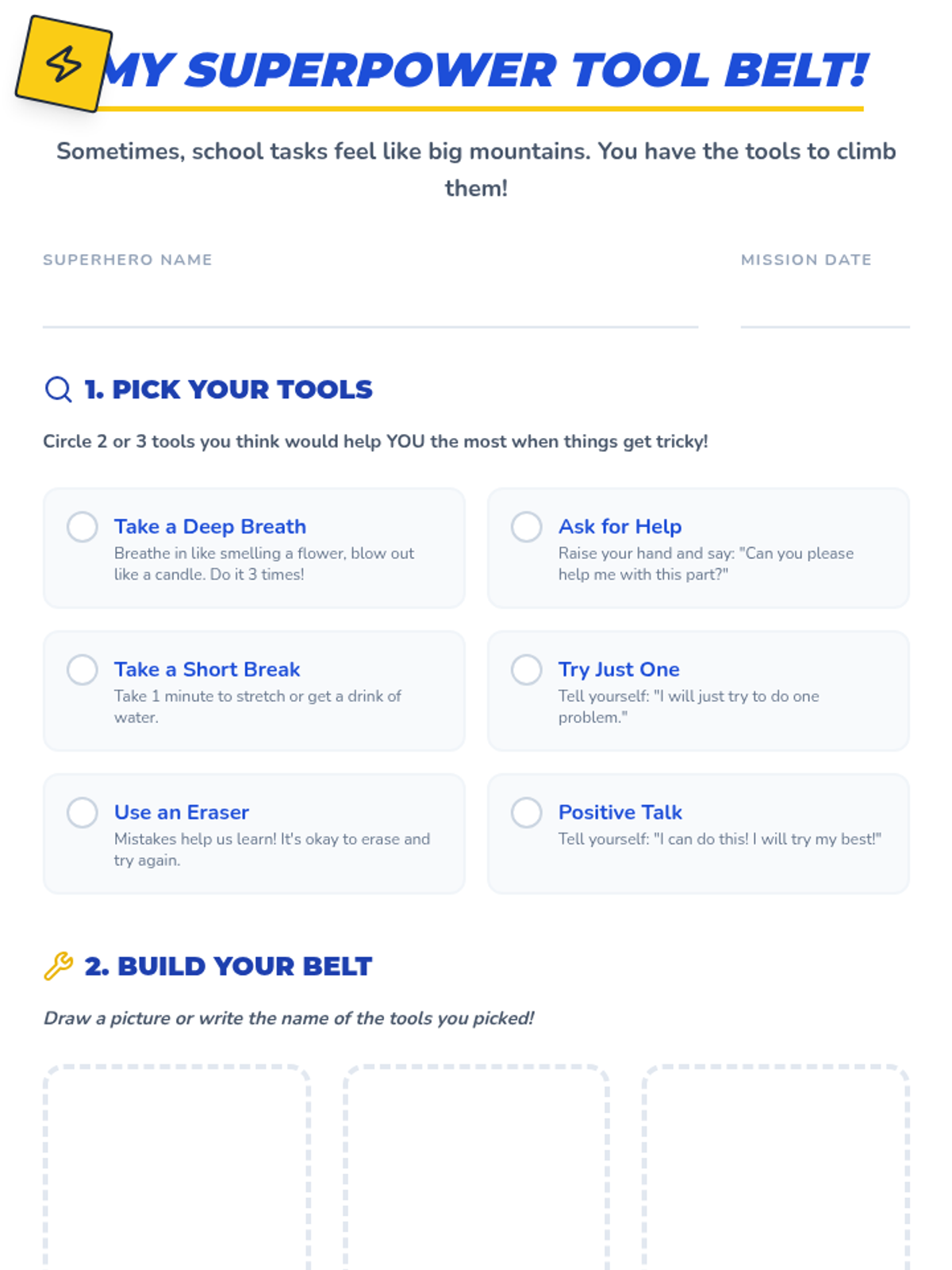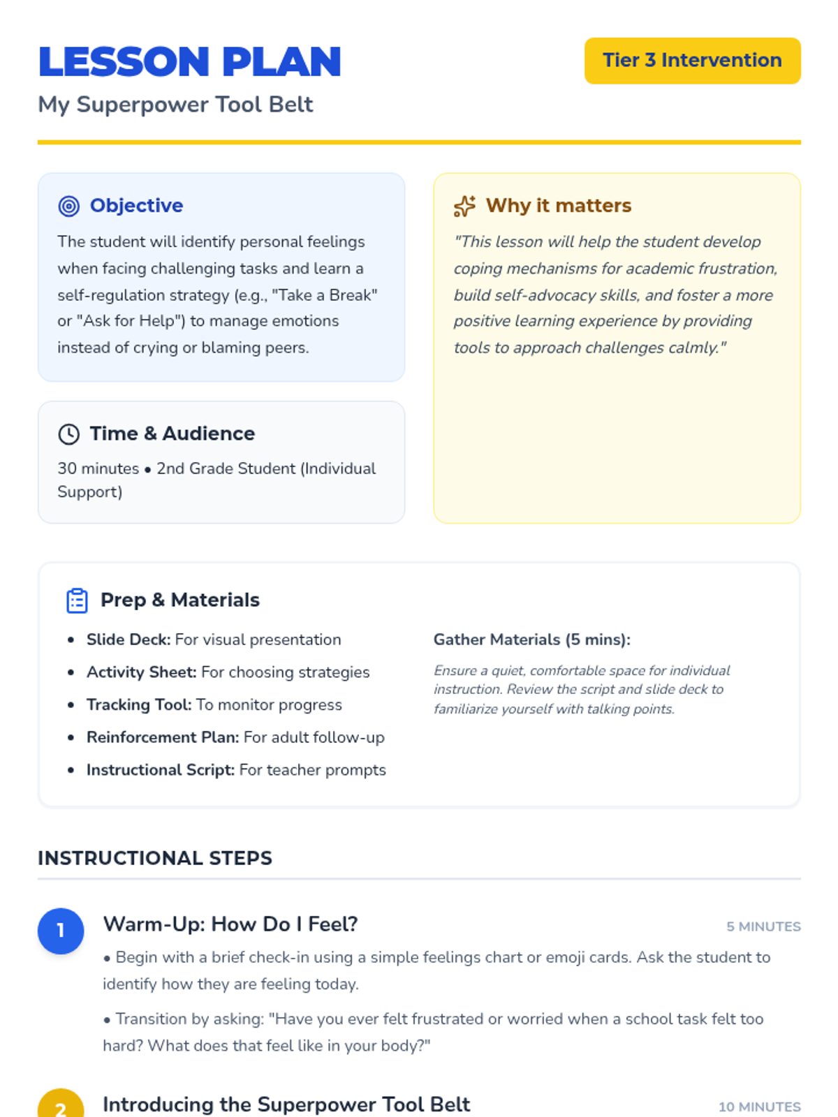 A 30-minute Tier 3 intervention lesson for a 2nd-grade student to develop emotional regulation and coping strategies for academic frustration. This lesson uses a 'Superpower Tool Belt' metaphor to teach self-advocacy and resilience.