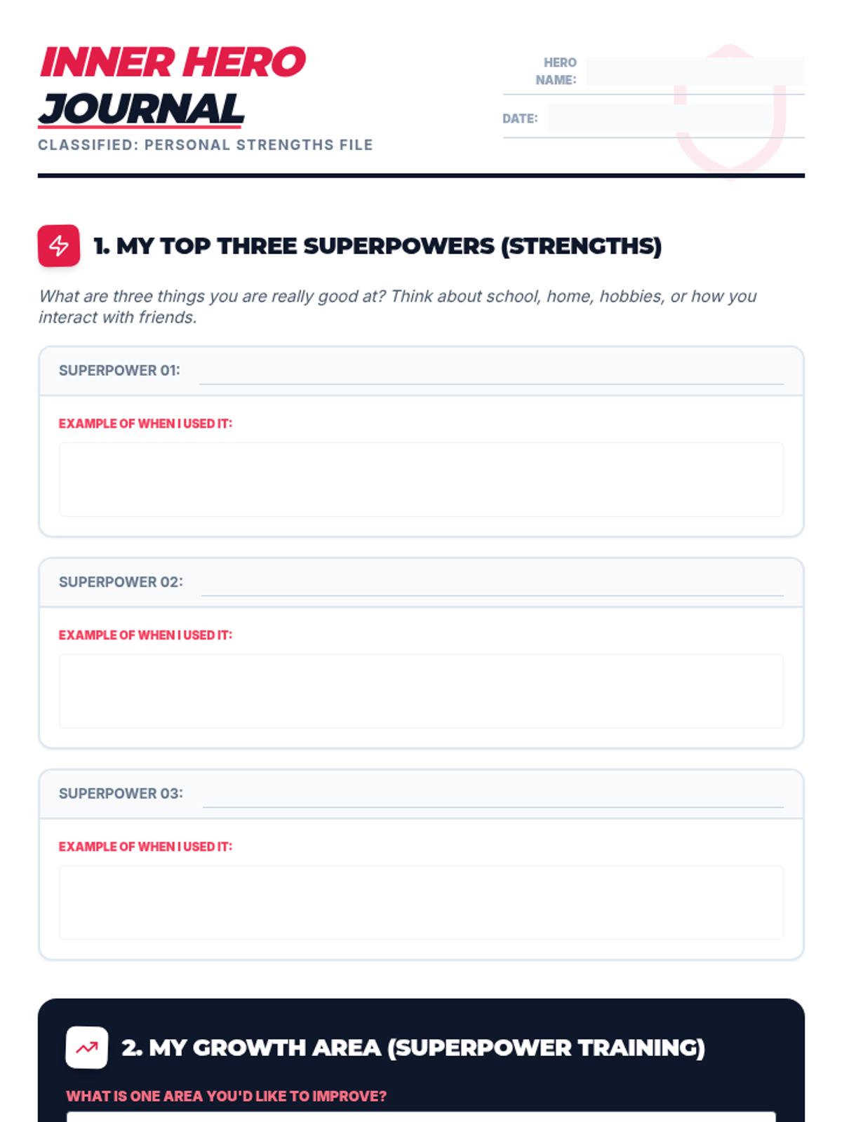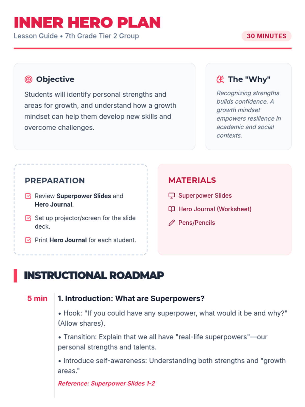A 30-minute Tier 2 group lesson for 7th graders focused on identifying personal strengths and fostering a growth mindset through a 'superhero' lens. Students explore their unique talents, differentiate between fixed and growth mindsets, and reflect on their personal development.