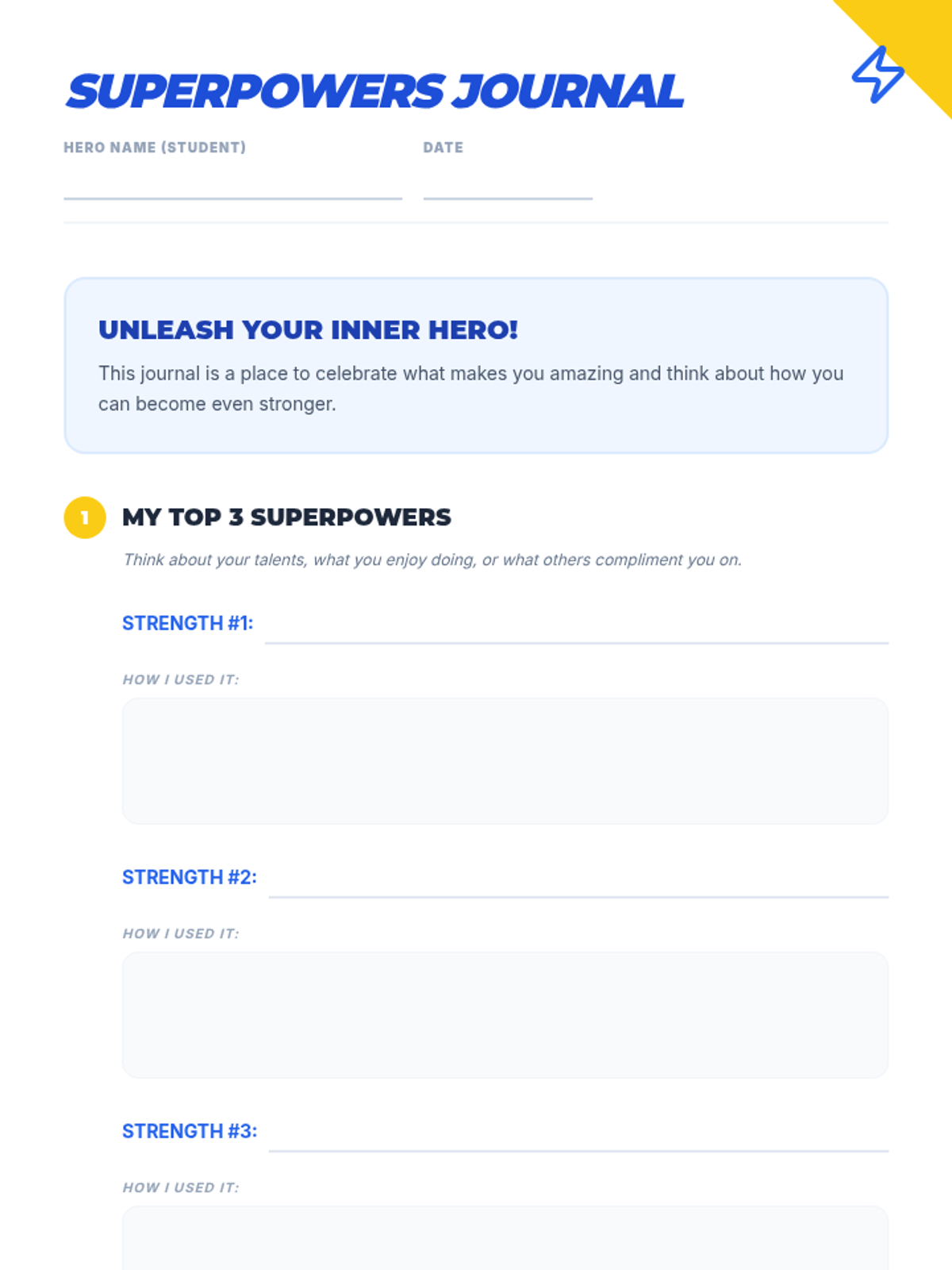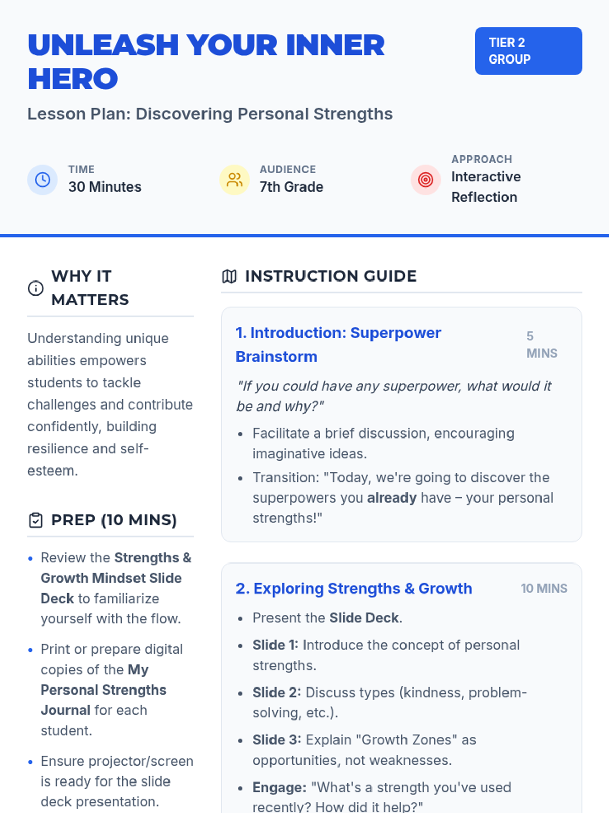 A Tier 2 small group lesson for 7th-grade students to identify personal strengths and develop a growth mindset through a 'superpower' lens.