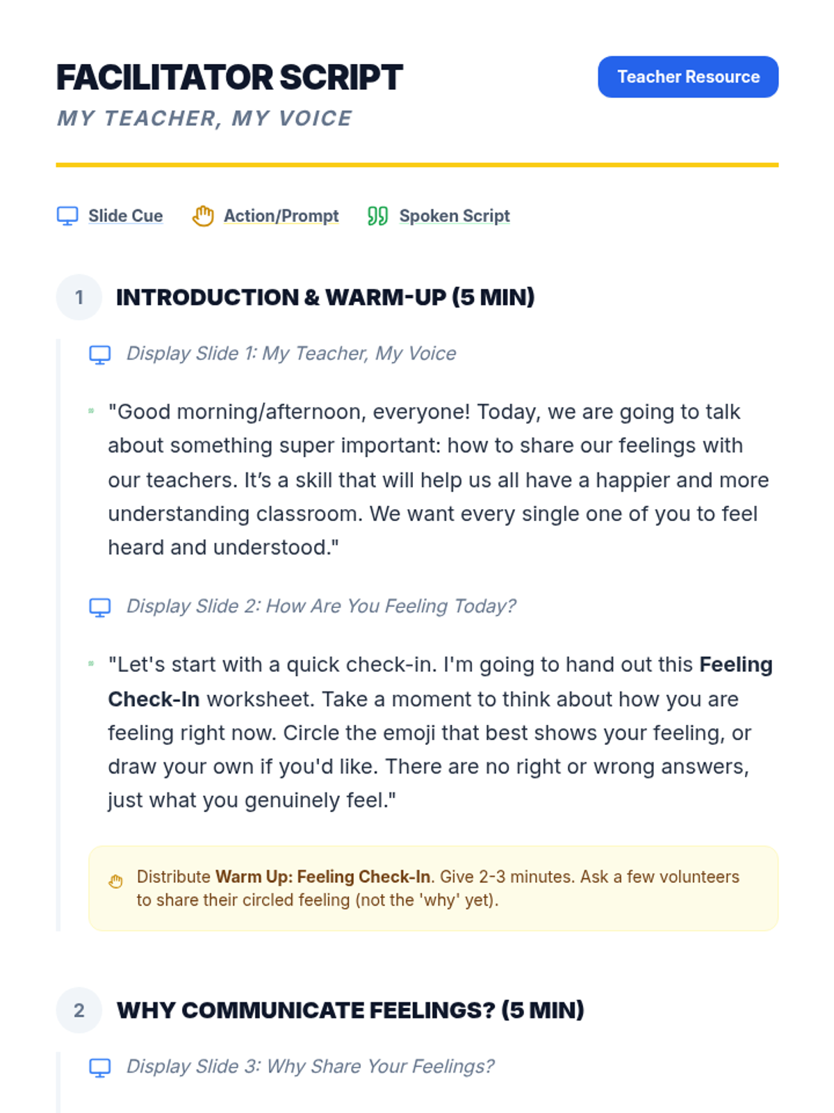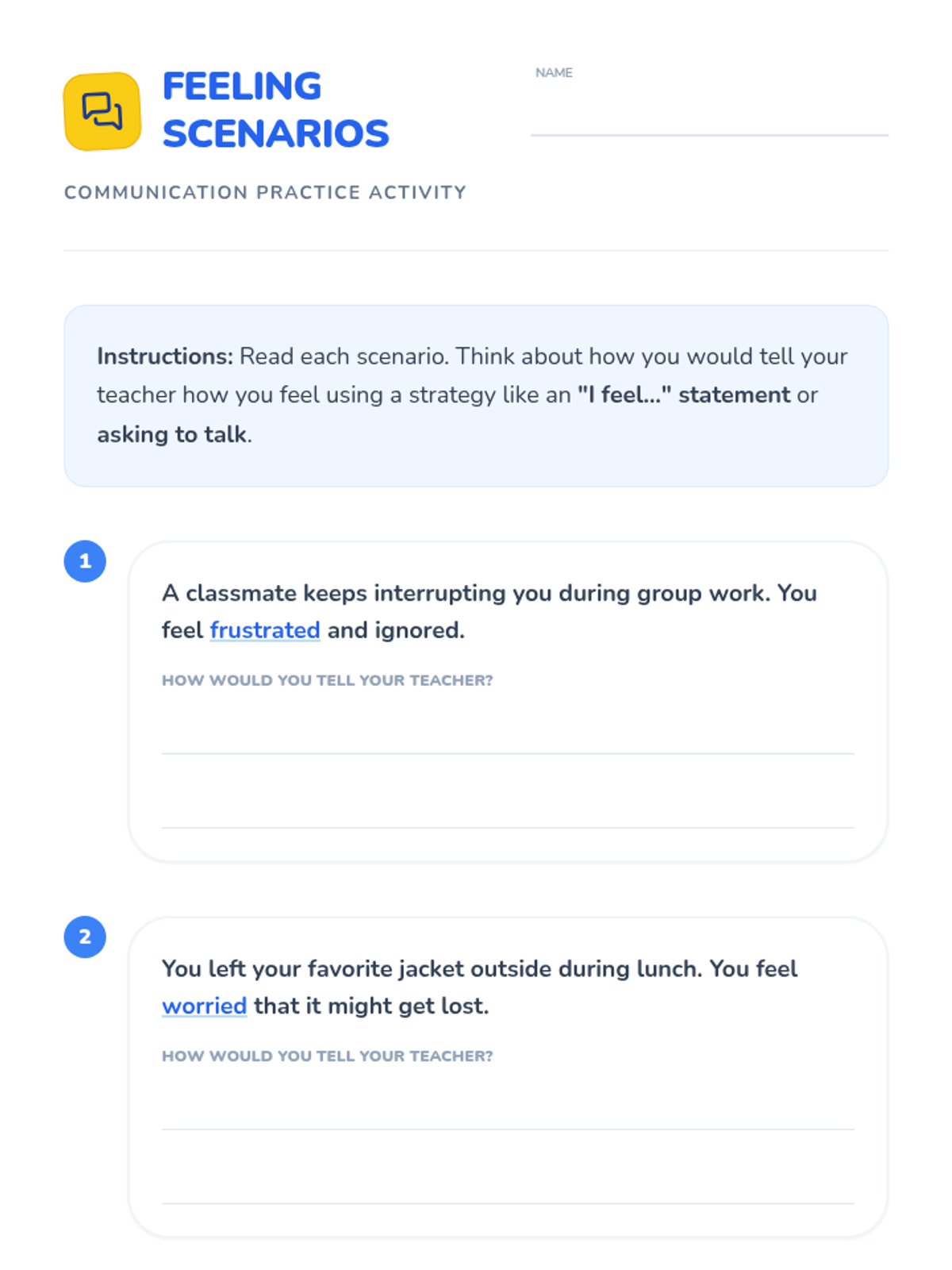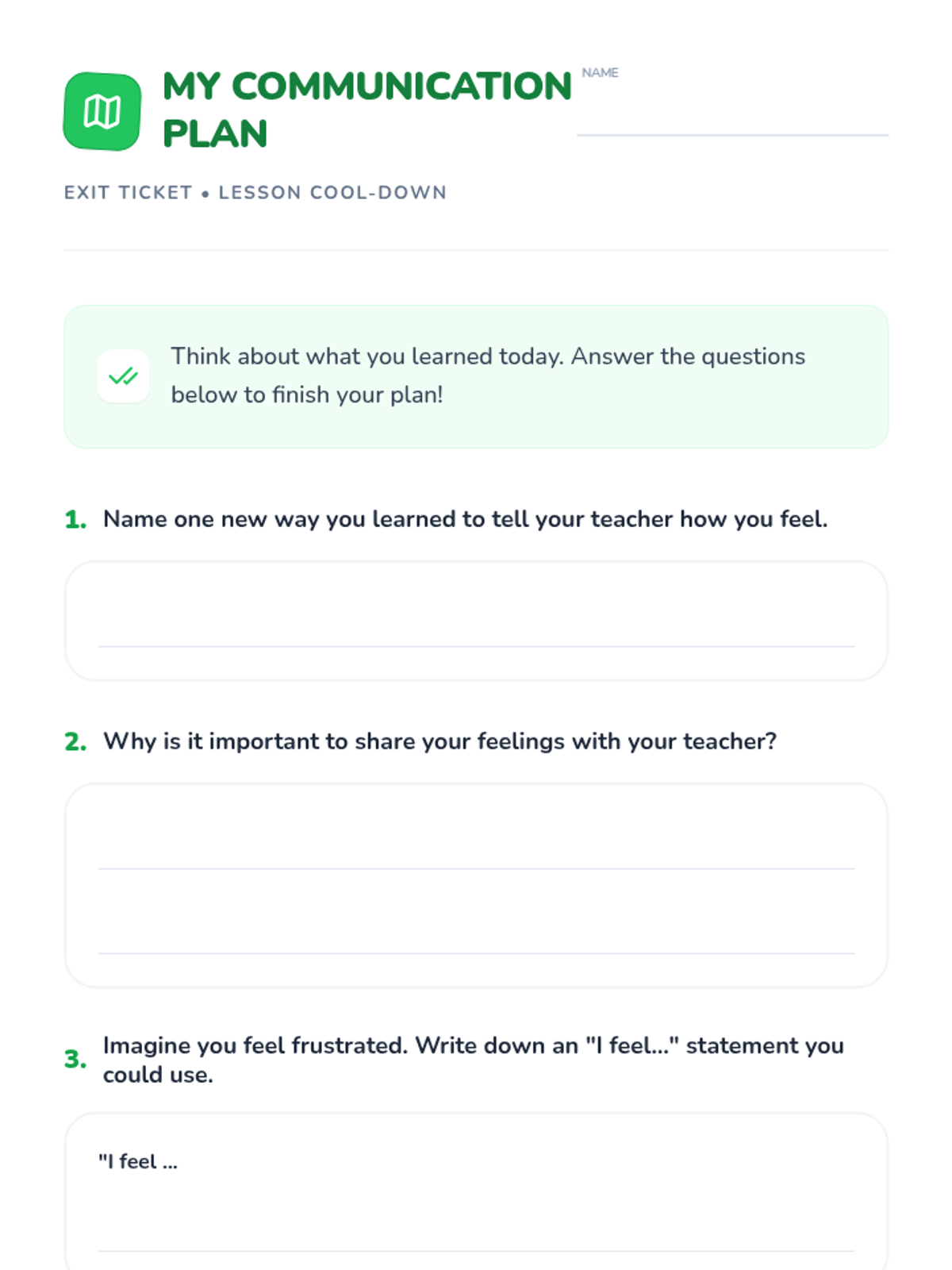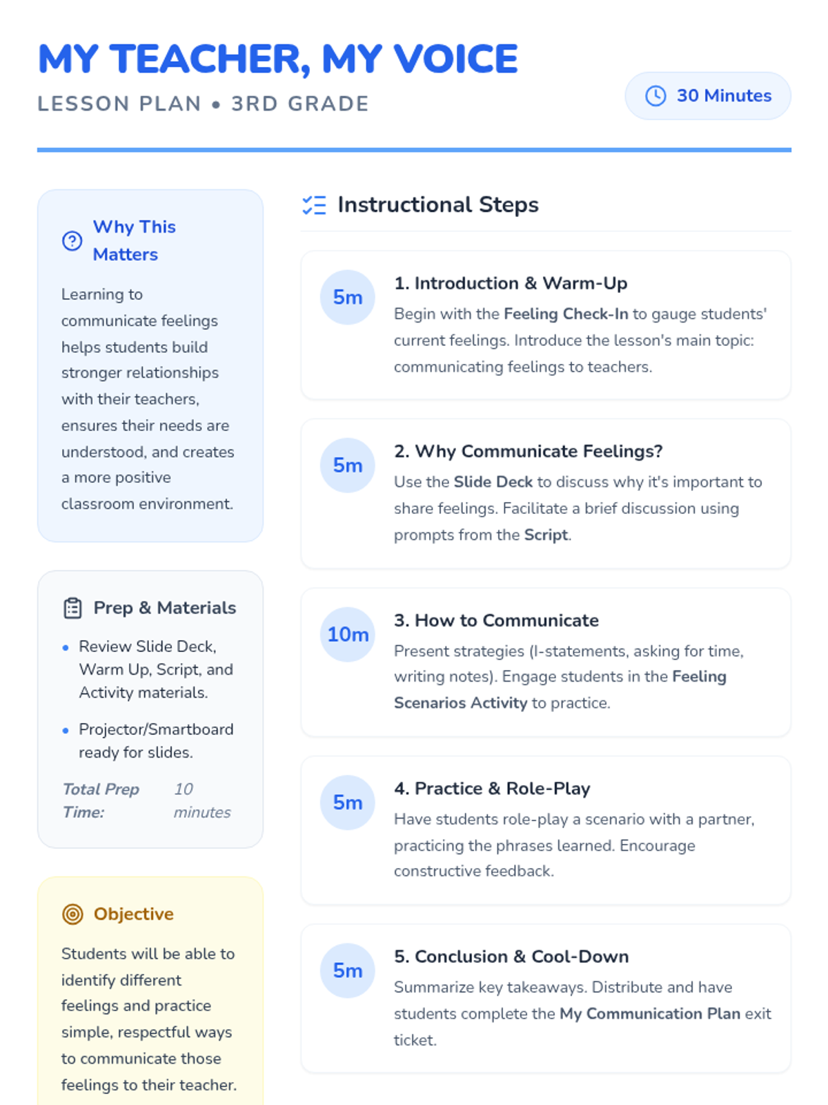 This lesson empowers 3rd-grade students to effectively communicate their feelings to their teachers, fostering a supportive classroom environment. Students will learn simple, actionable strategies to express themselves, leading to better understanding and stronger student-teacher relationships.