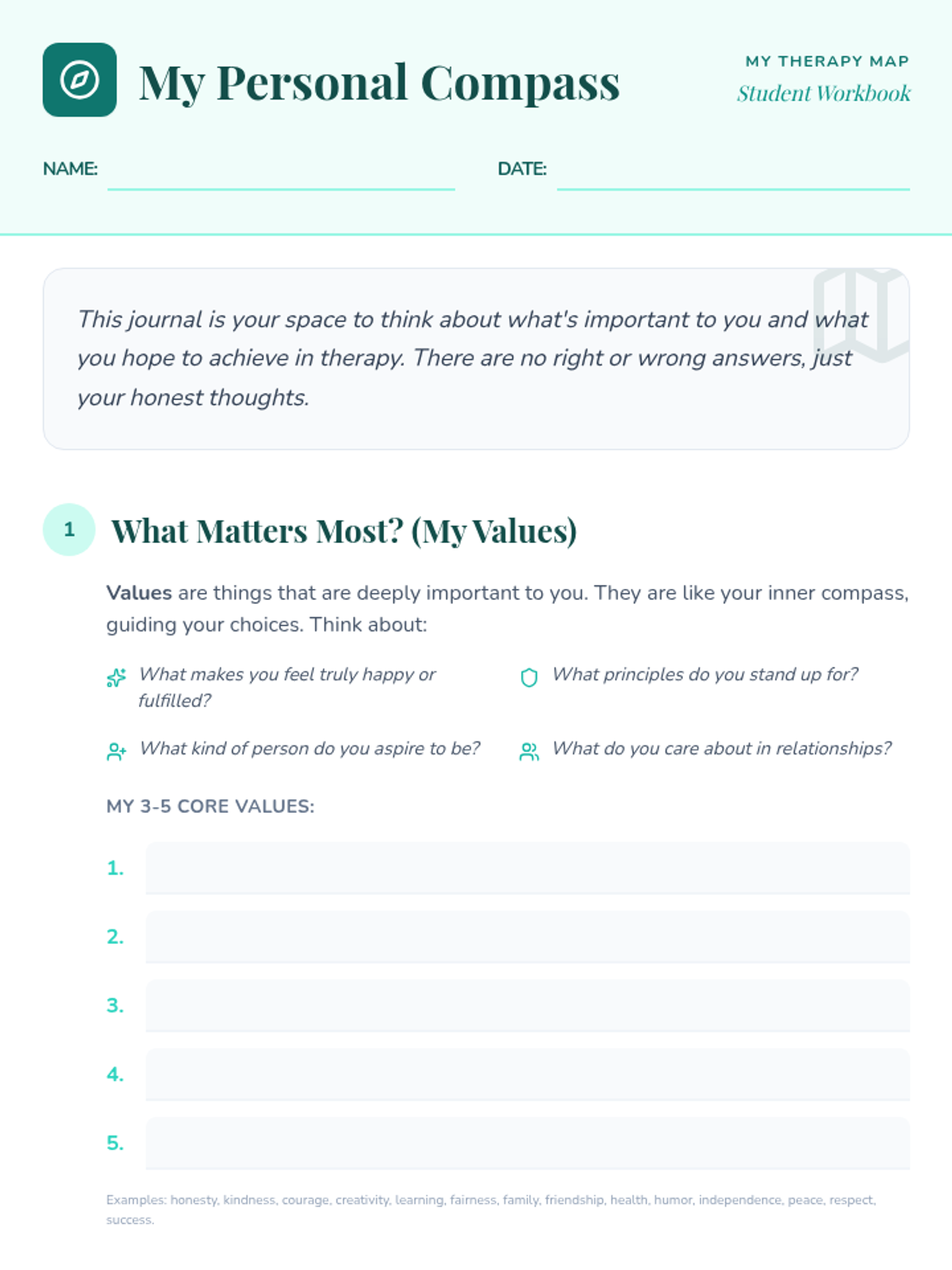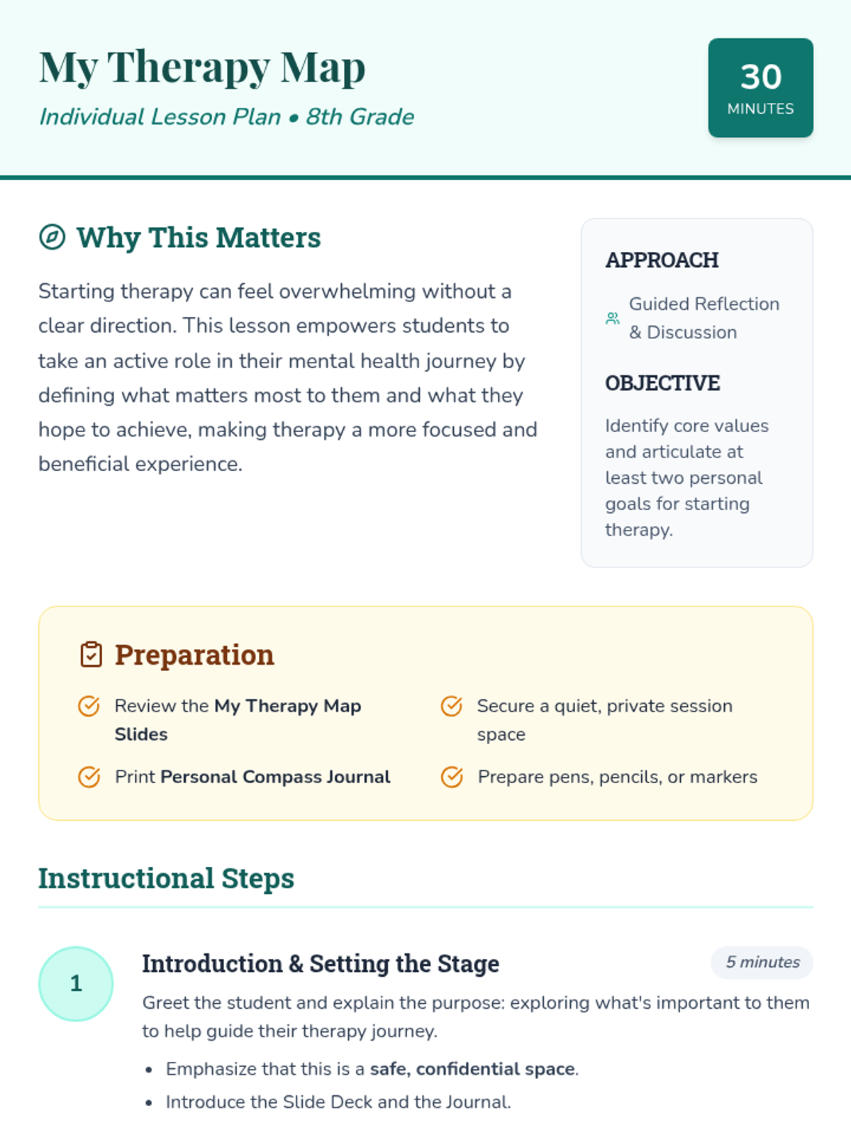 A 30-minute individual Tier 3 lesson for 8th graders to explore personal values and define therapy goals, laying a strong foundation for their therapeutic journey.
