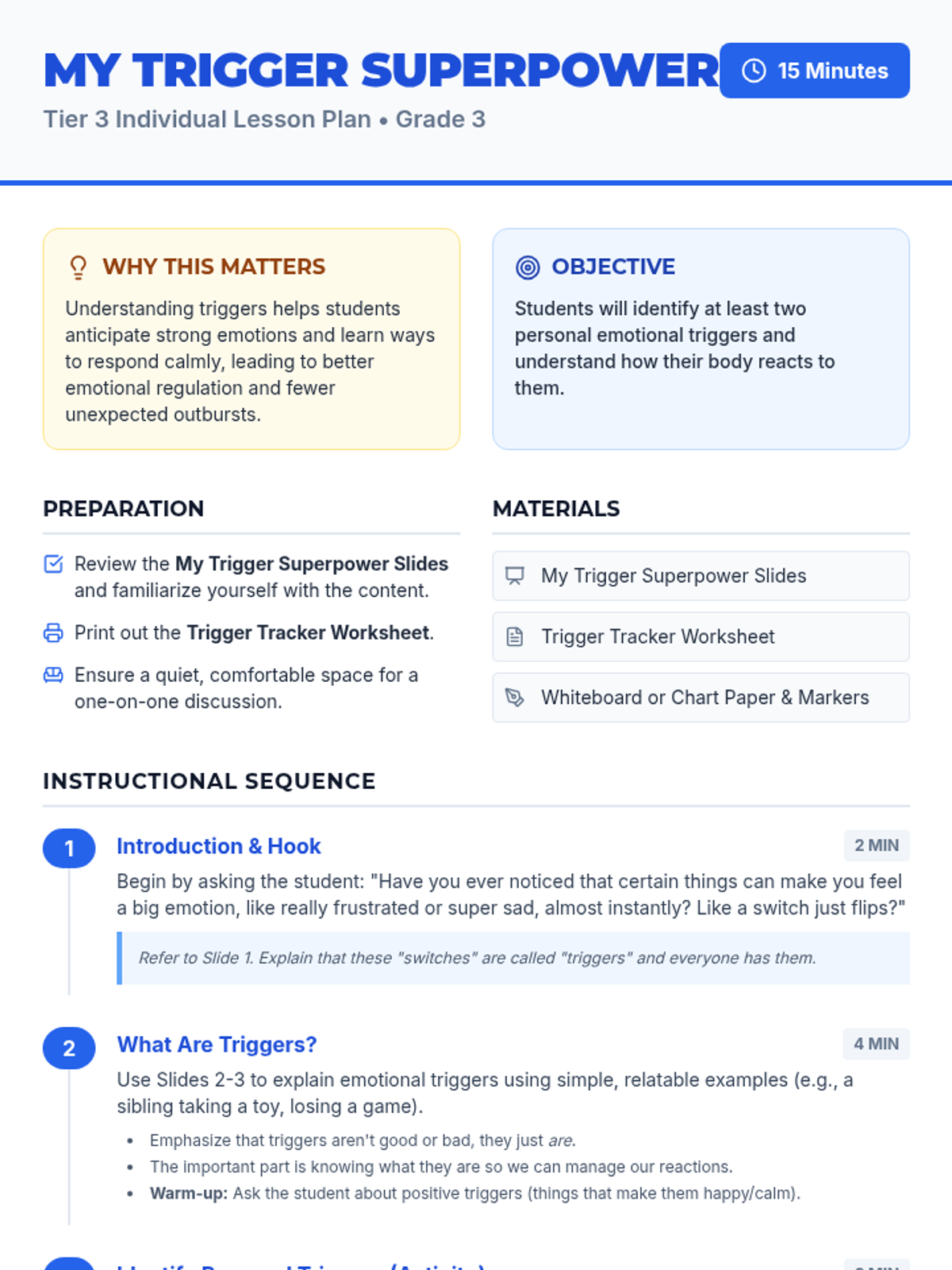 This 15-minute, one-on-one lesson helps 3rd-grade students identify and understand their personal emotional triggers, empowering them to develop strategies for managing strong feelings. It's crucial for building self-awareness and emotional regulation skills.