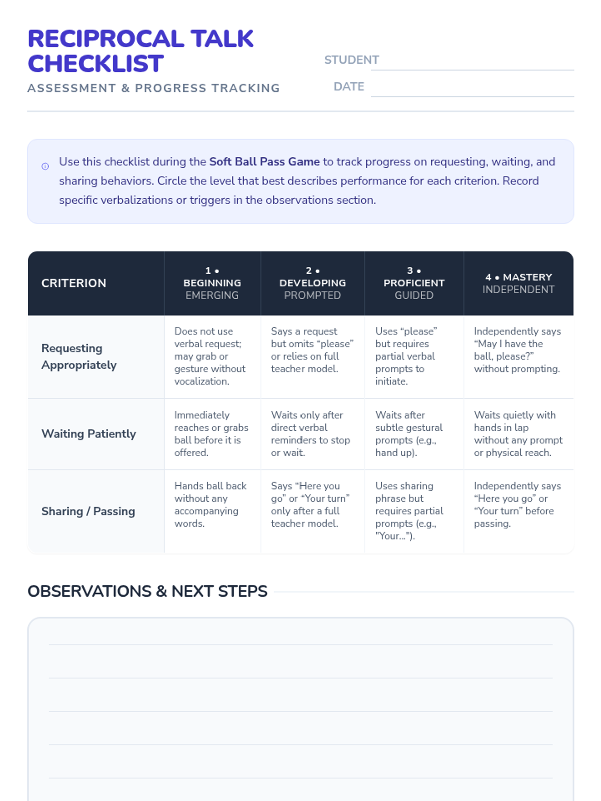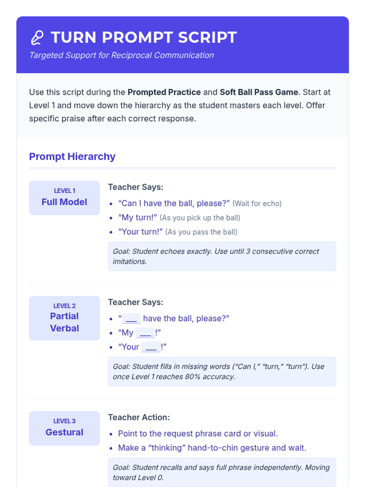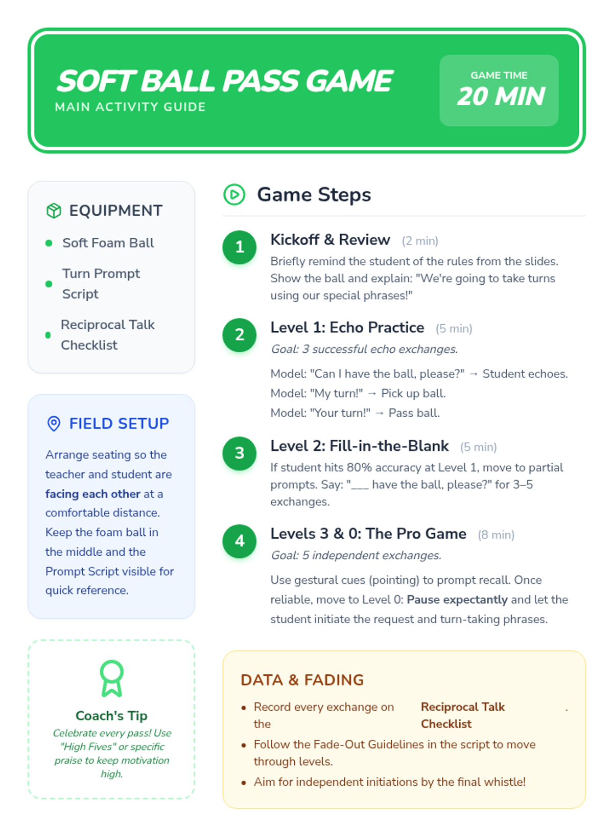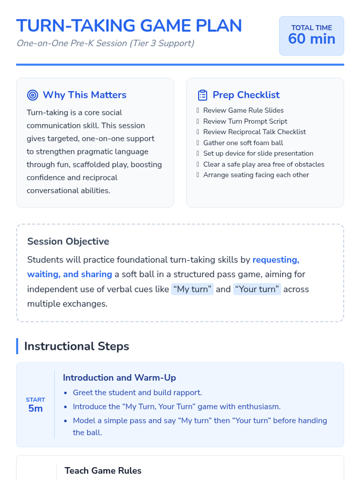 A specialized one-on-one session for Pre-K students to build foundational turn-taking skills through a structured ball-passing game, focusing on verbal cues and reciprocal communication.
