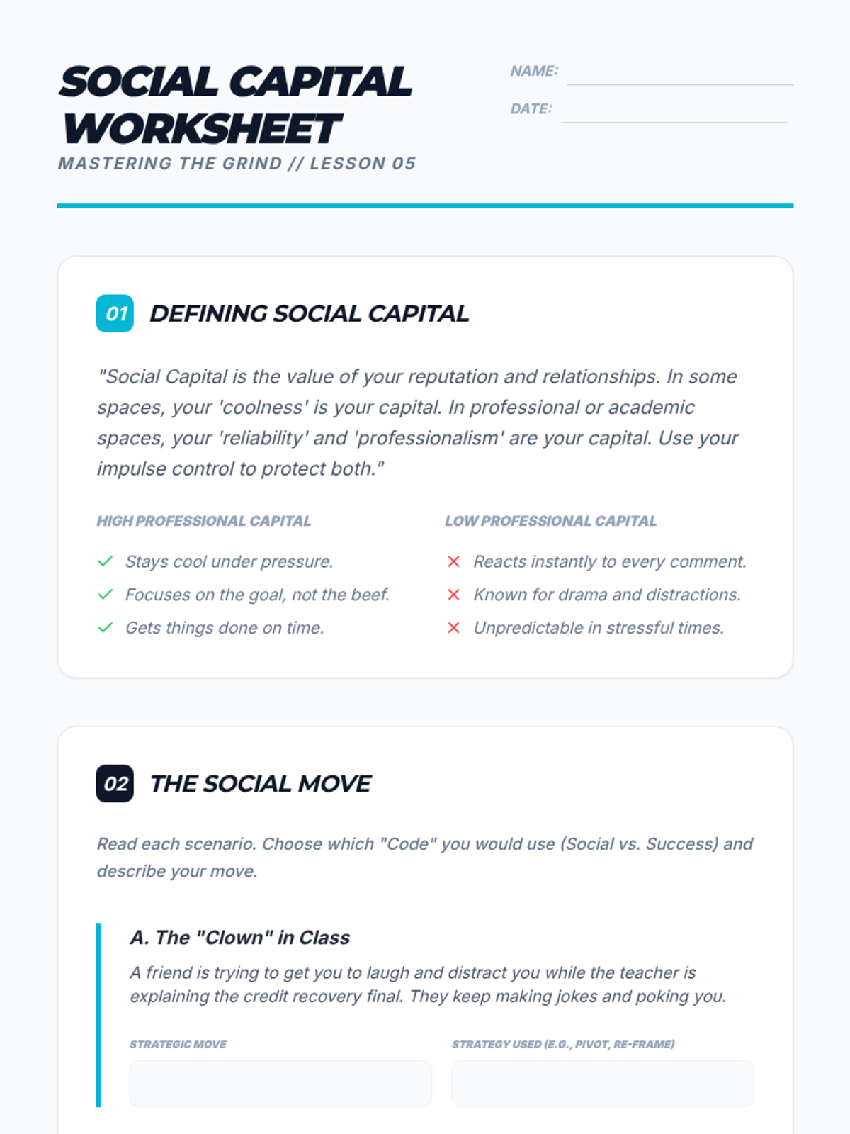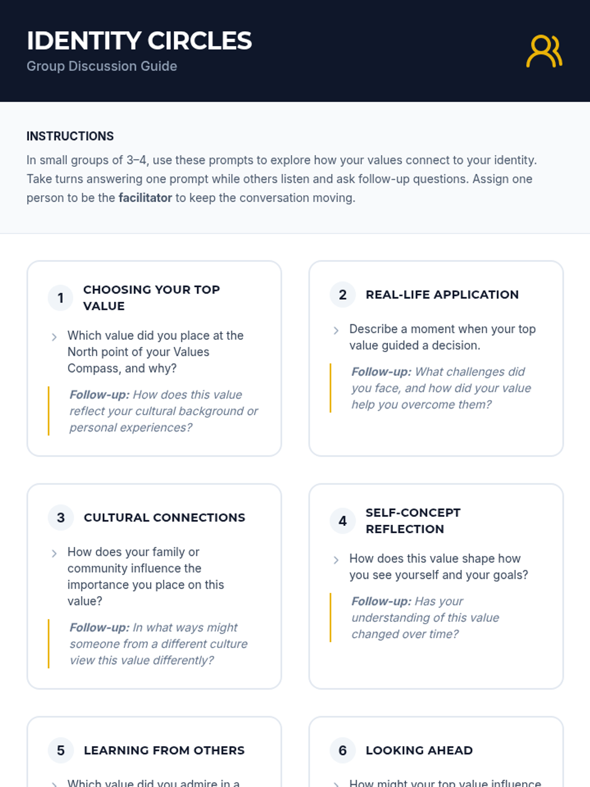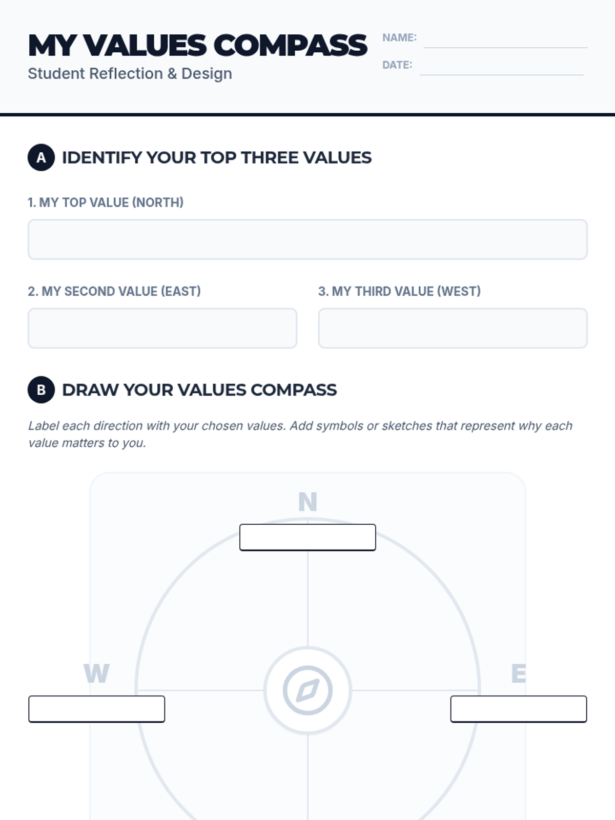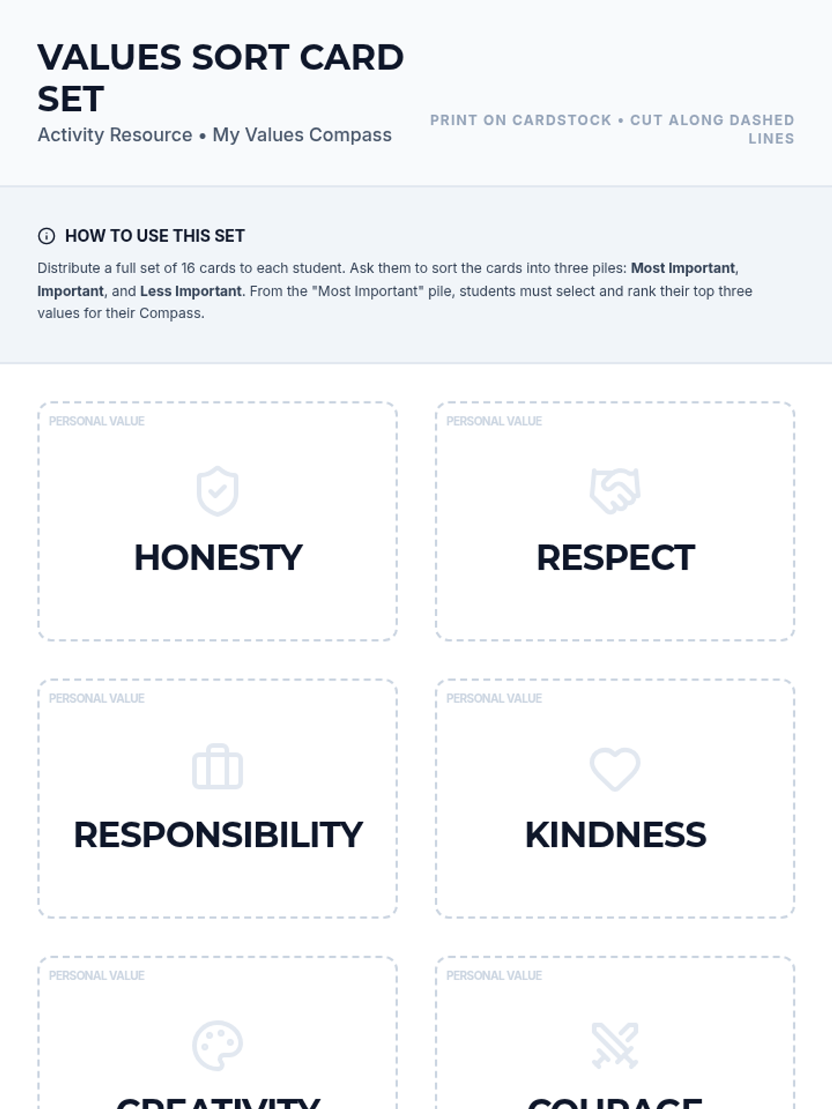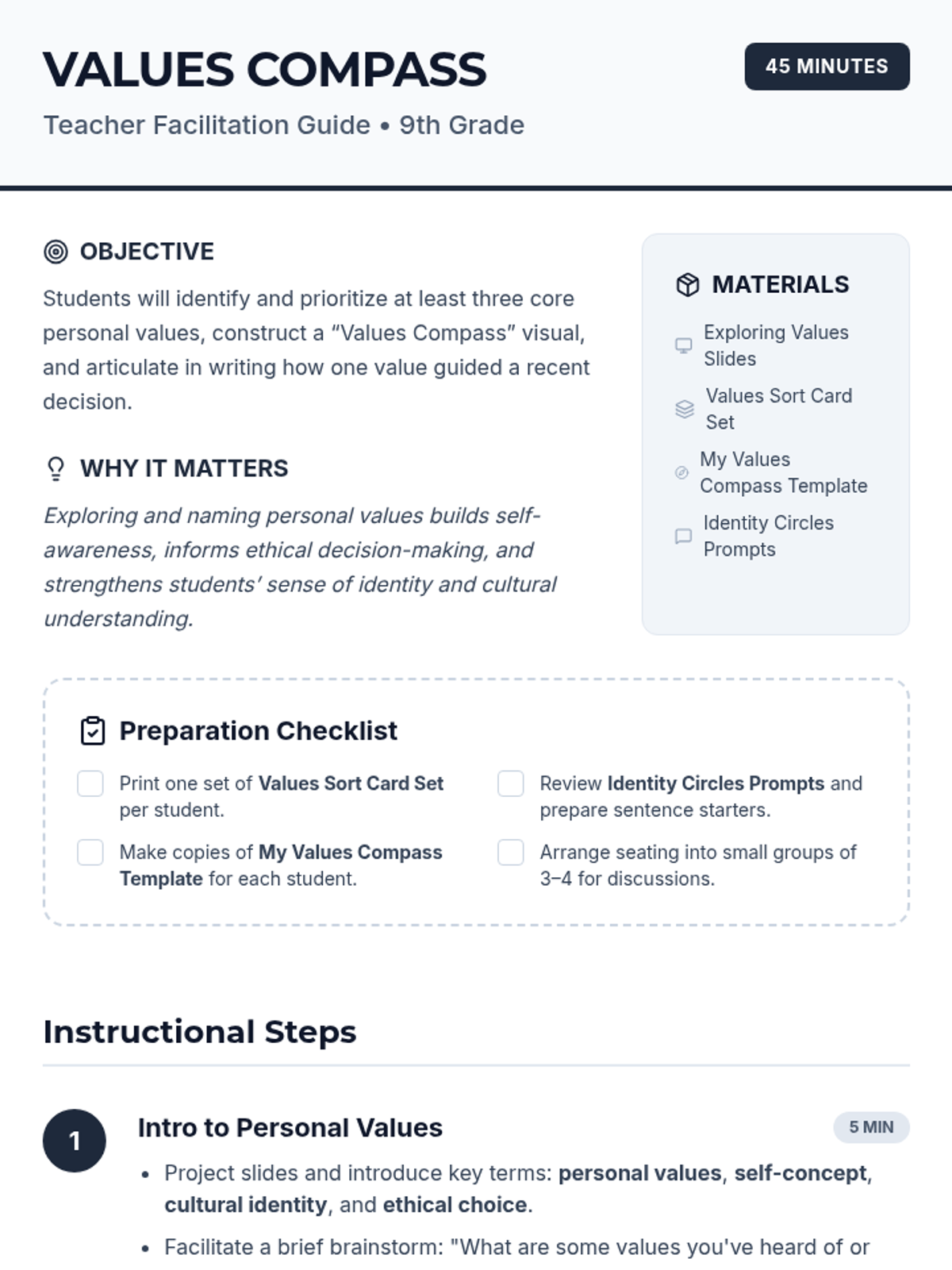 A 45-minute workshop for 9th graders to identify and prioritize core personal values using a card sort, visual compass creation, and reflective writing. Students explore how their values intersect with self-concept, cultural identity, and ethical decision-making.
