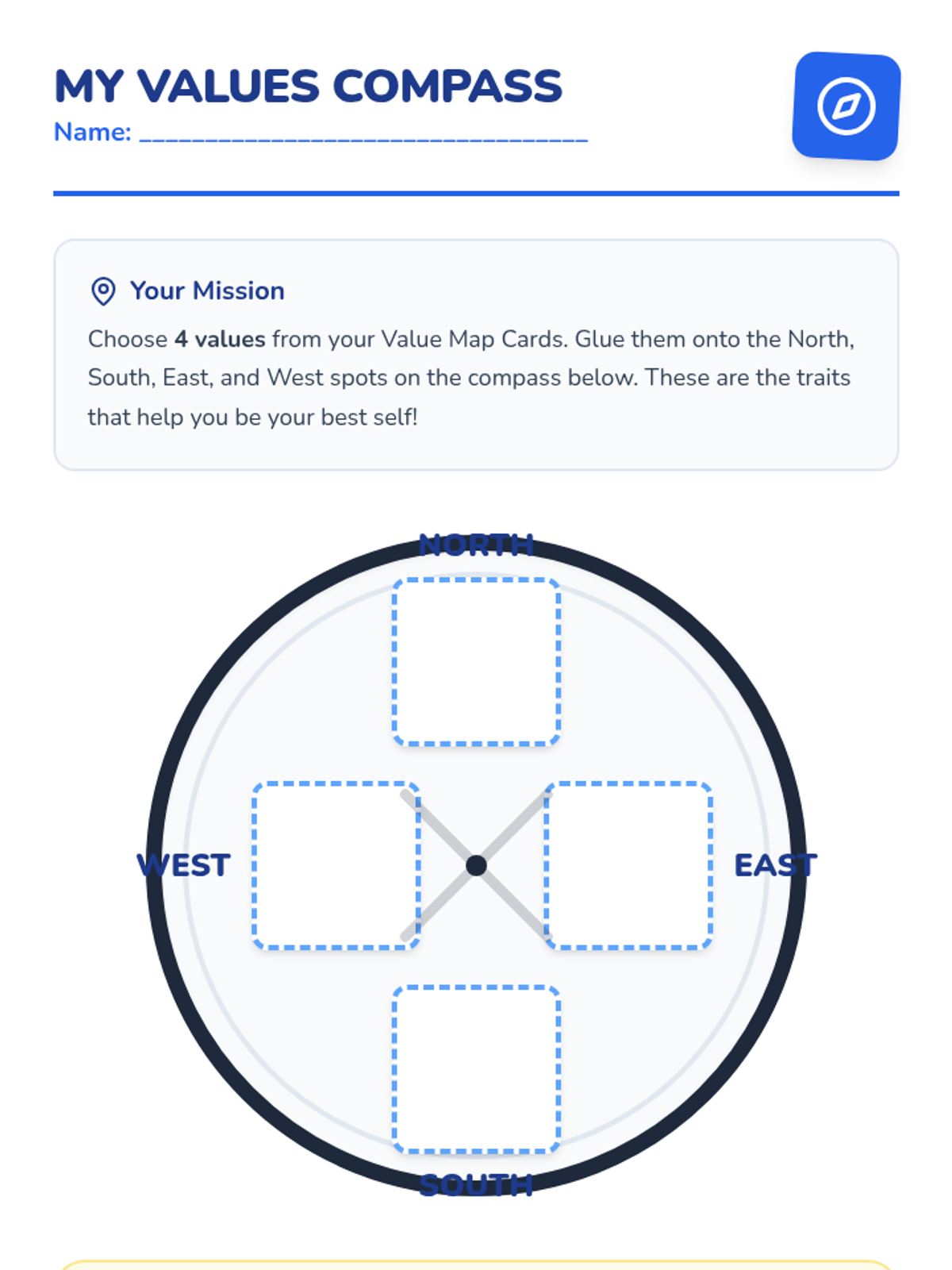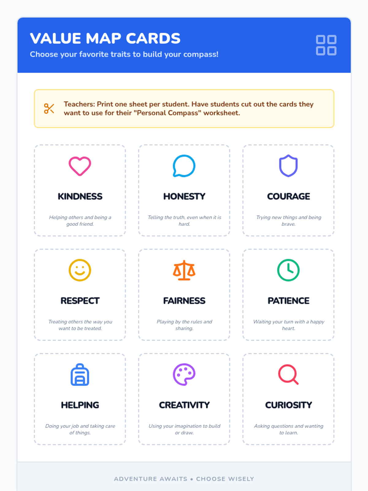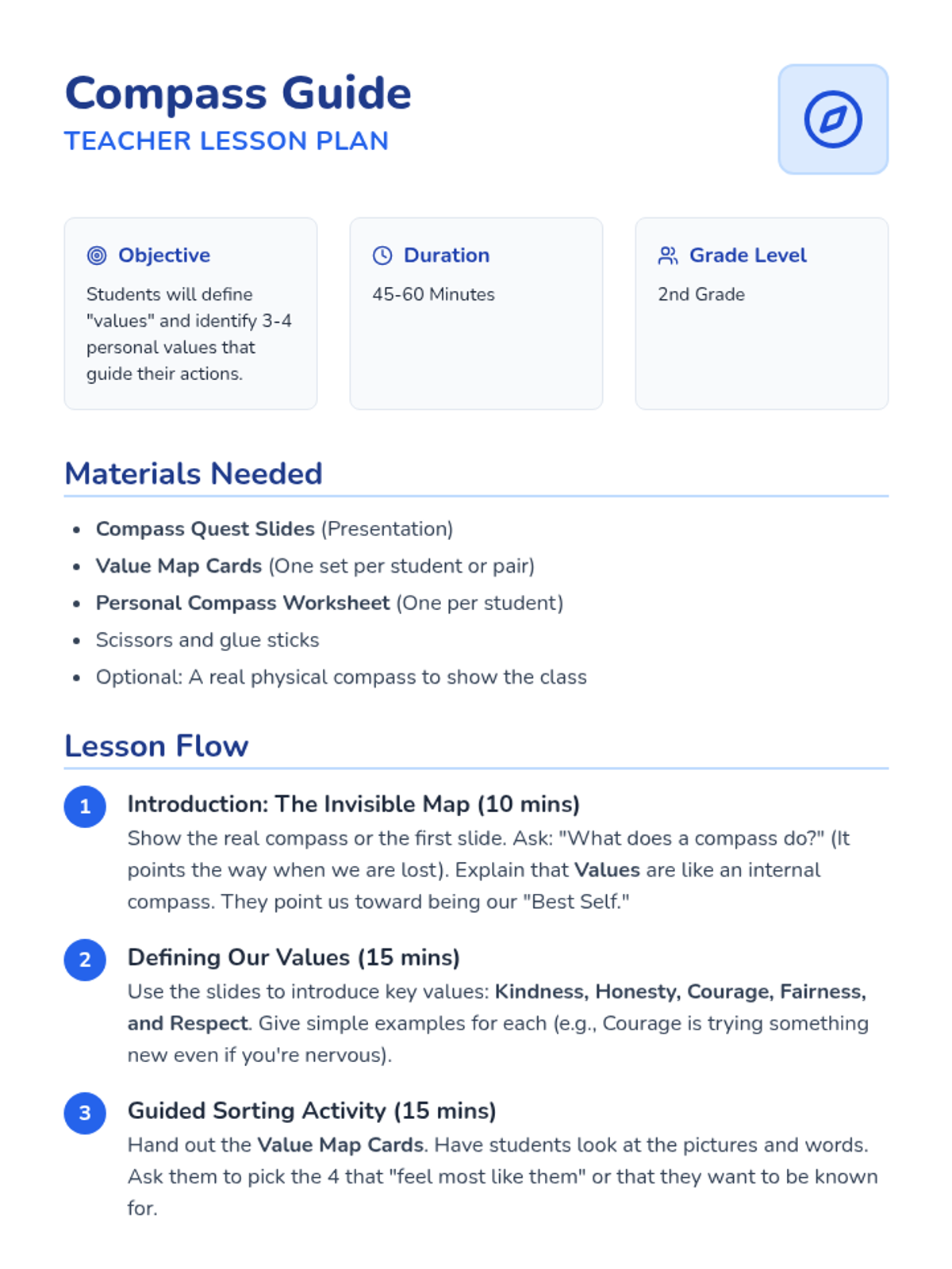 This lesson introduces 2nd graders to the concept of personal values using a compass metaphor. Students will identify positive traits like kindness and honesty, exploring how these values act as internal guides for making good choices in everyday situations.