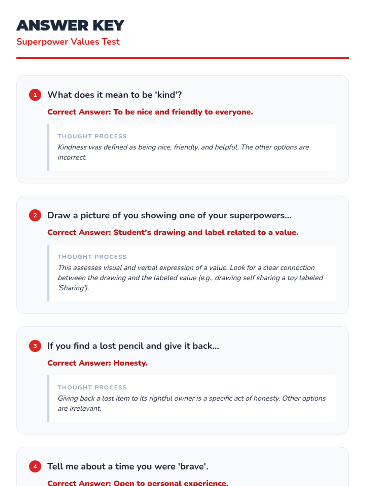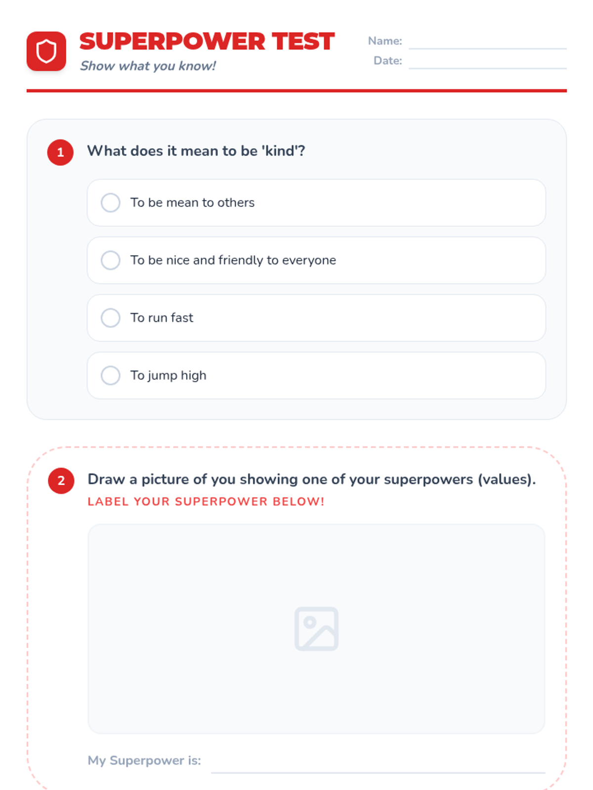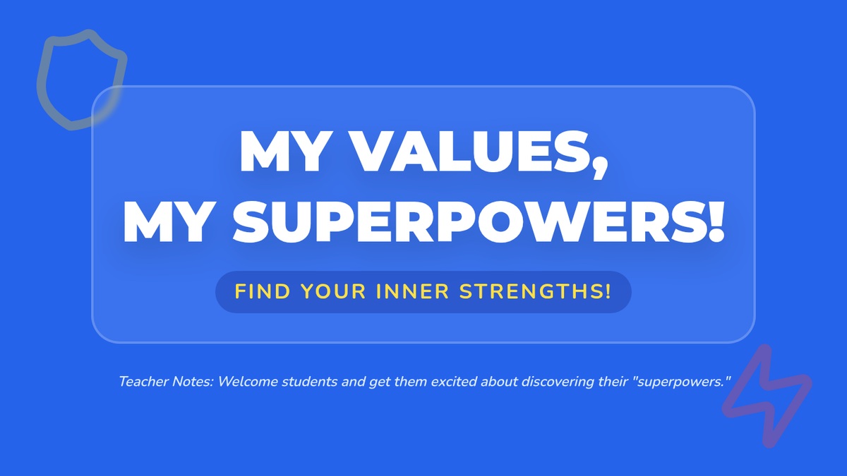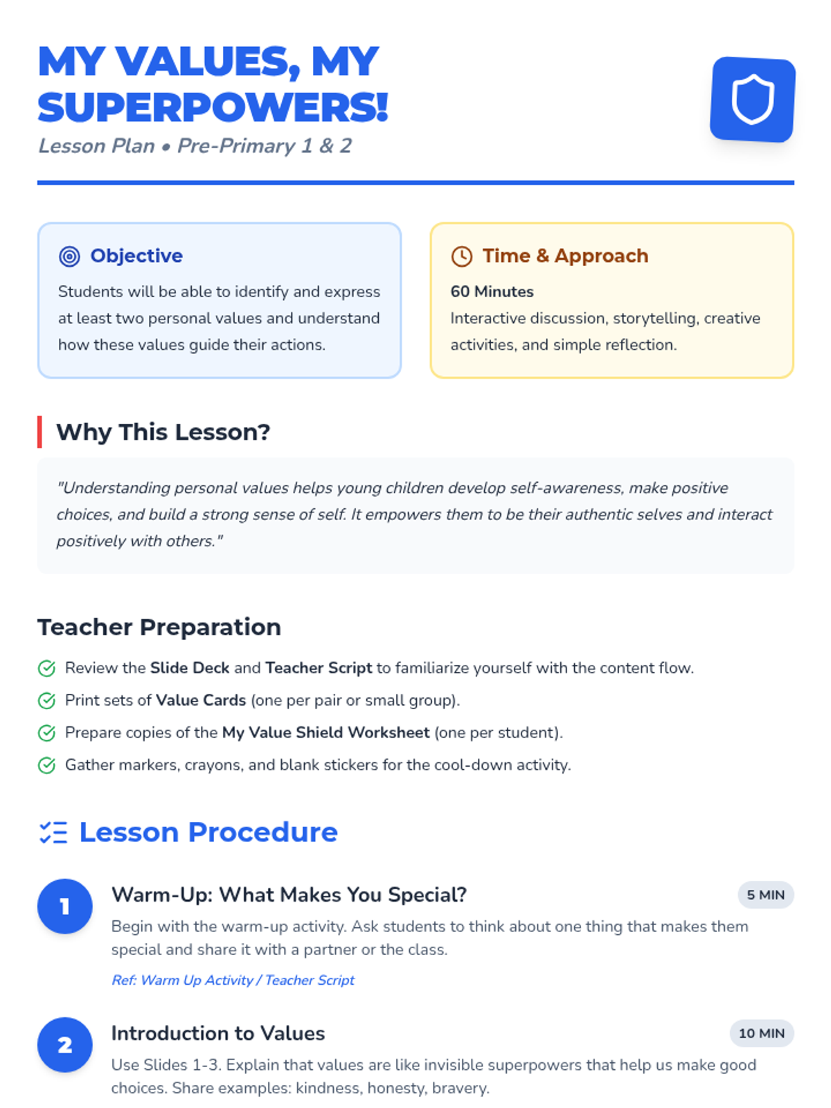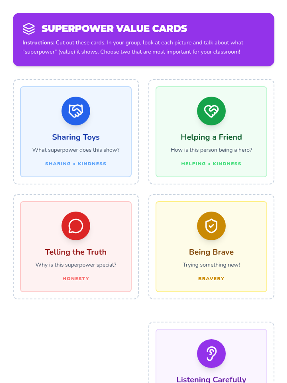 A high-energy, interactive lesson for Pre-Primary students to discover their personal values through a superhero lens. Students will learn that values like kindness and honesty are their inner superpowers.
