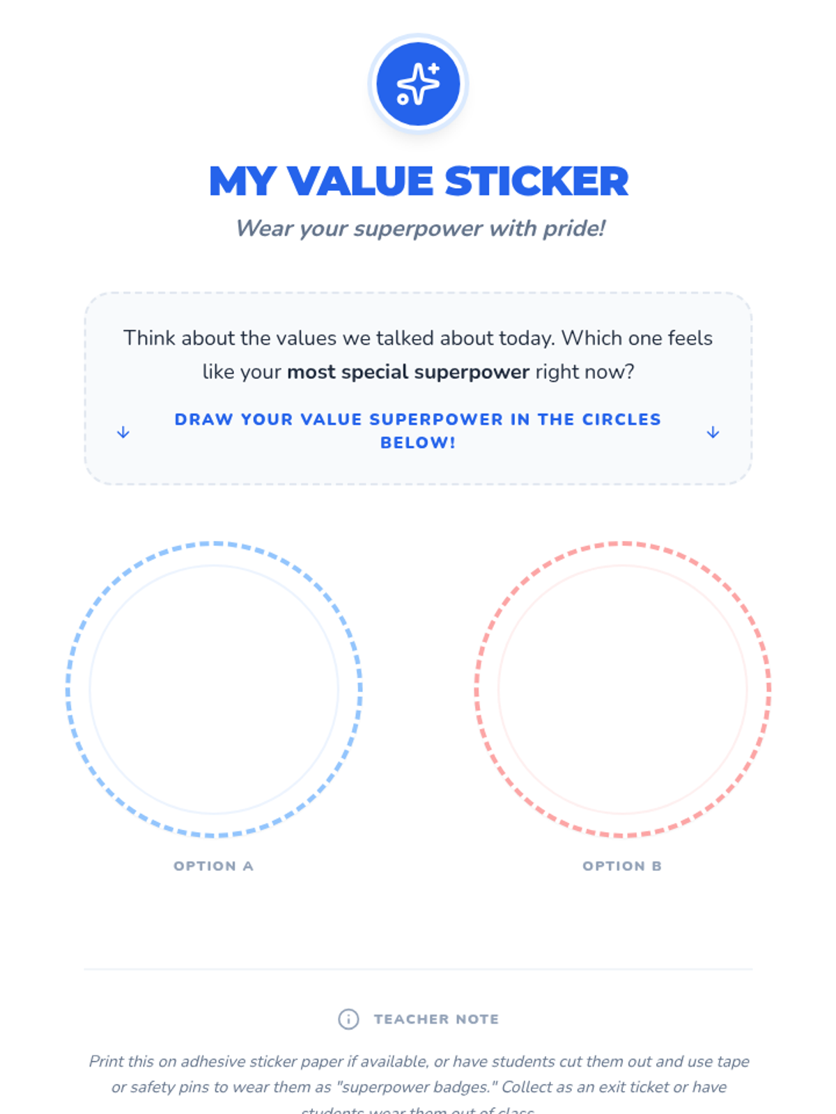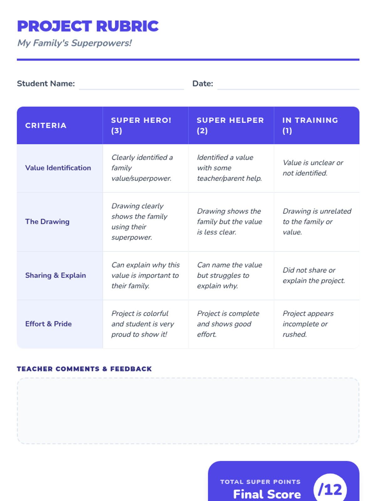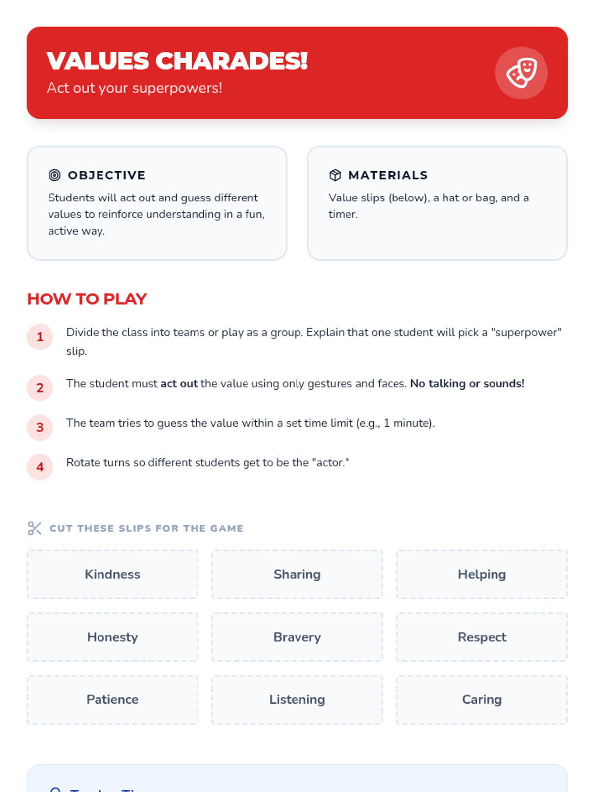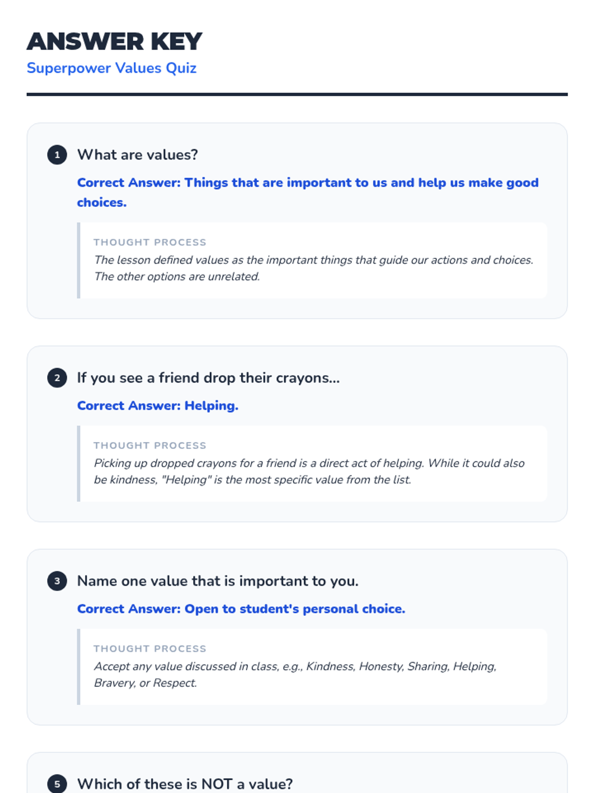 A high-energy, interactive lesson for Pre-Primary students to discover their personal values through a superhero lens. Students will learn that values like kindness and honesty are their inner superpowers.