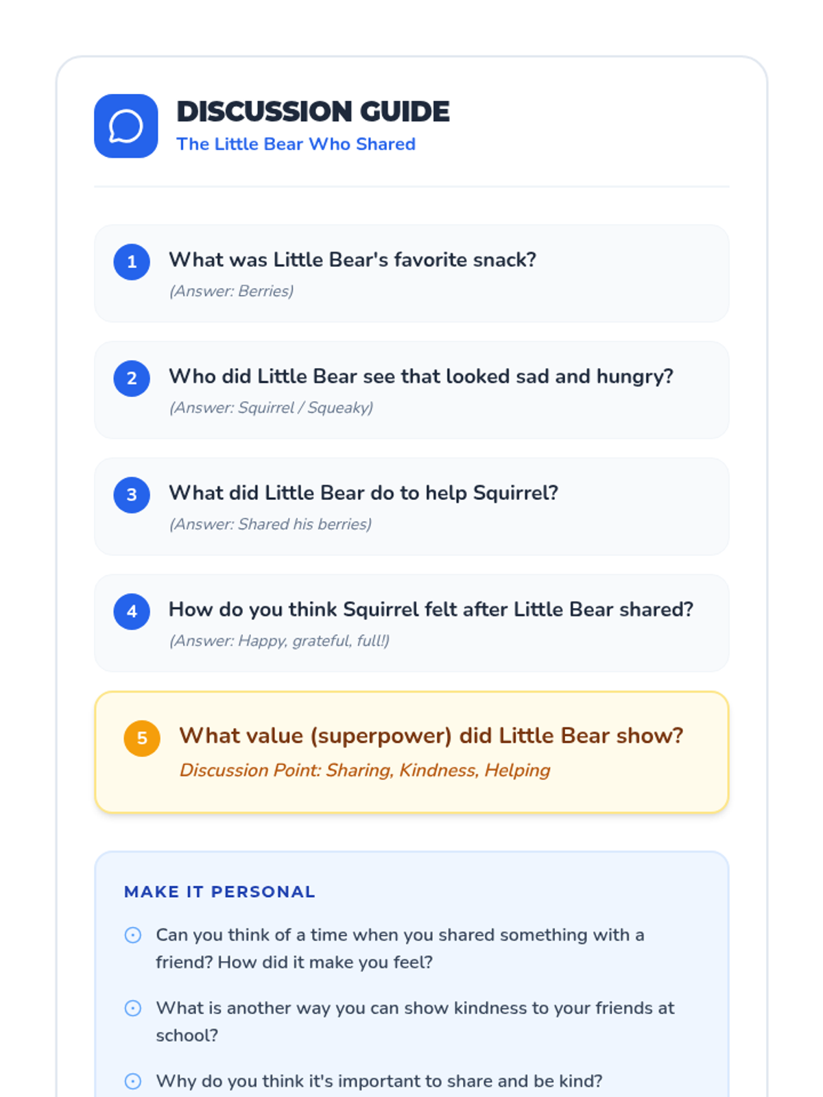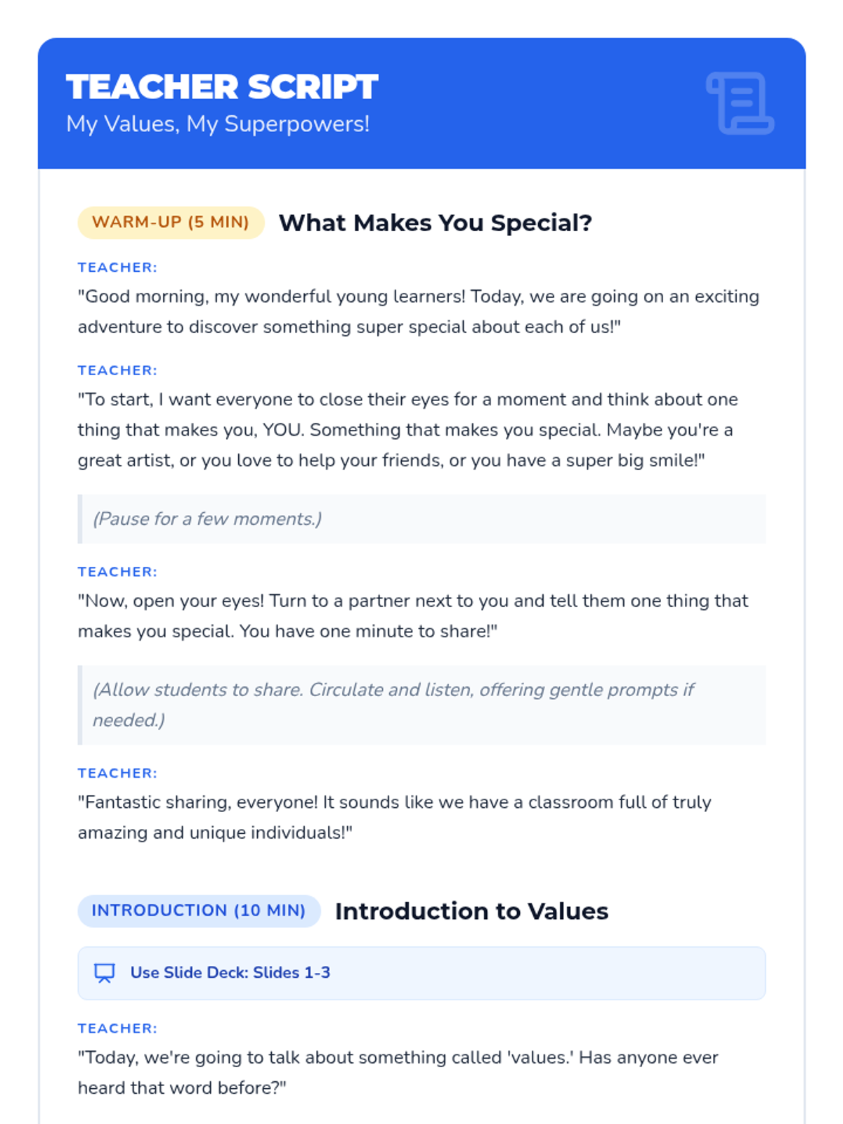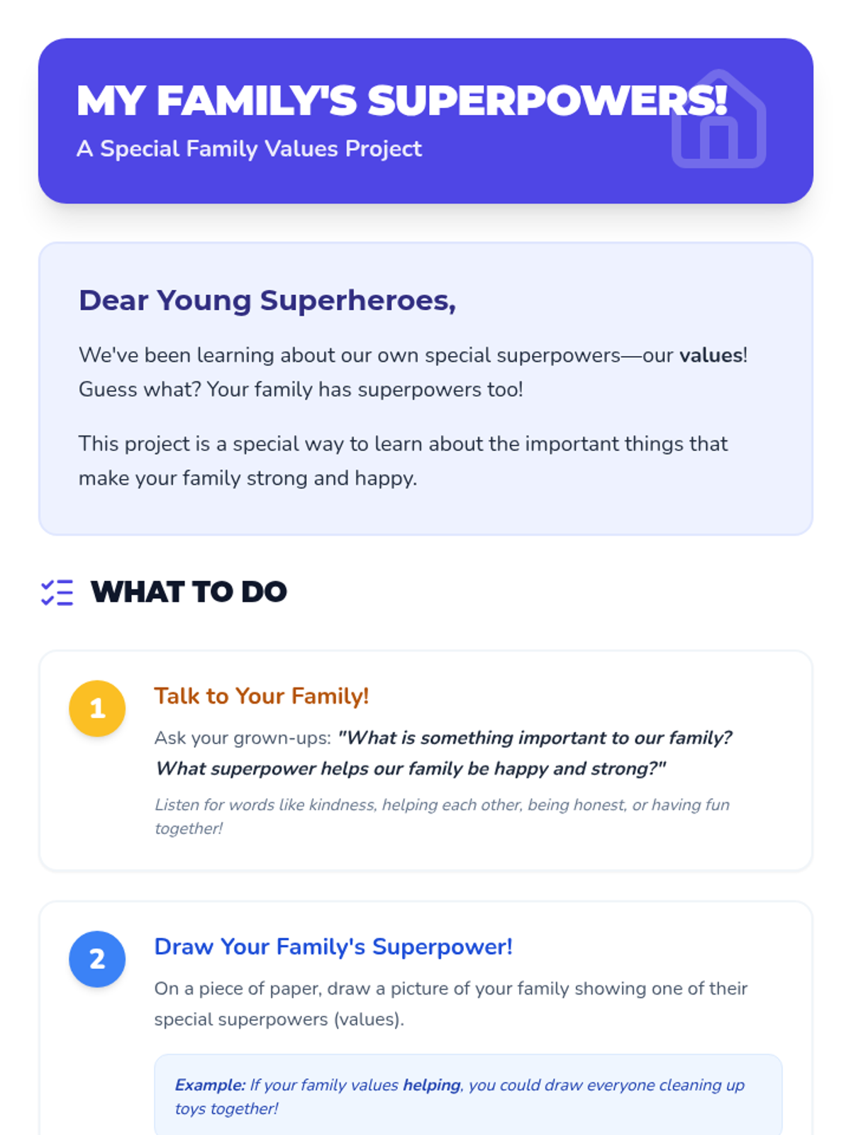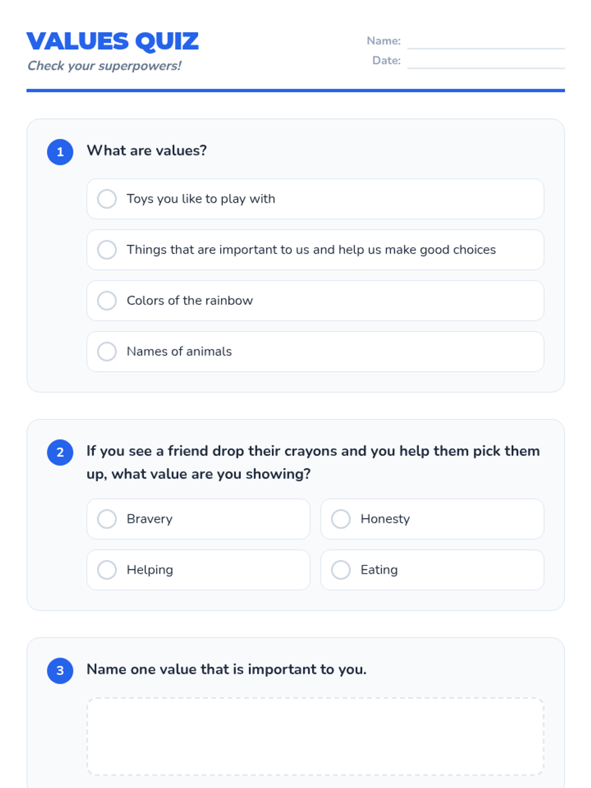 A high-energy, interactive lesson for Pre-Primary students to discover their personal values through a superhero lens. Students will learn that values like kindness and honesty are their inner superpowers.