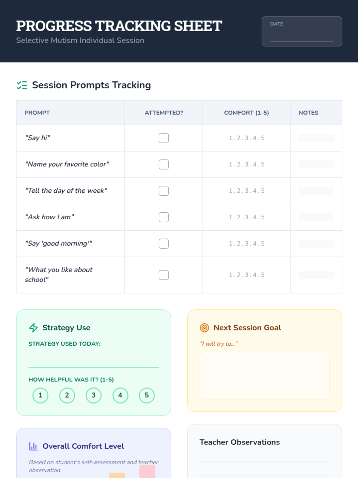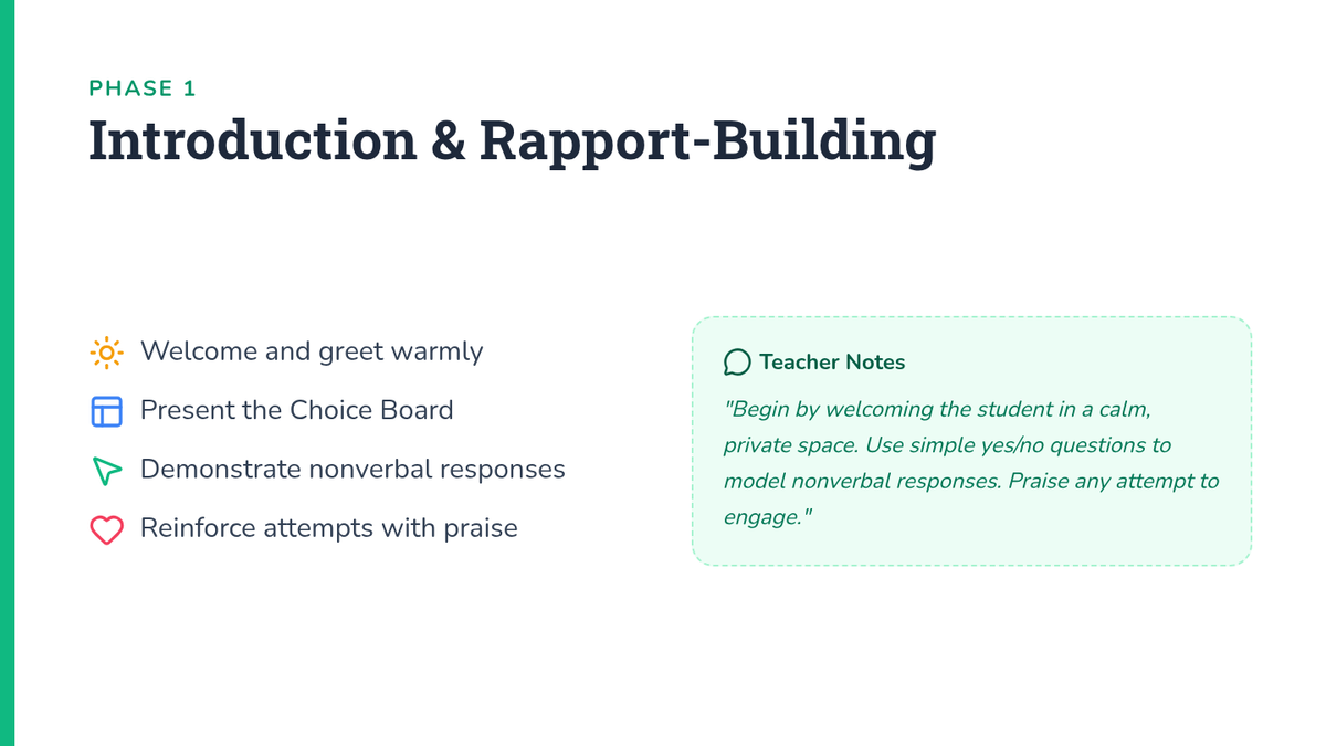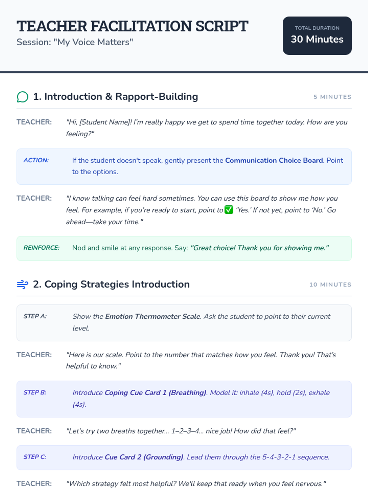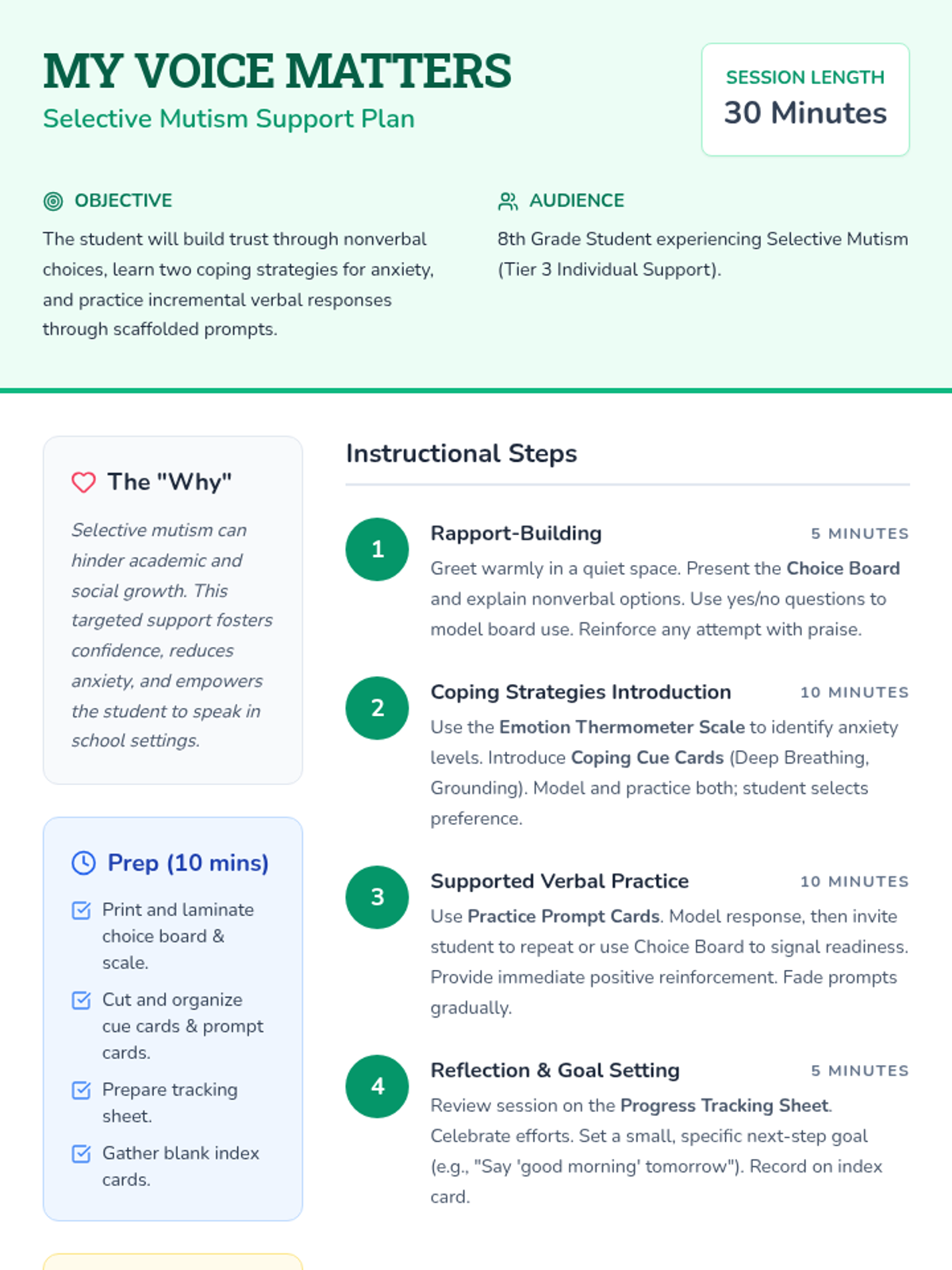 A 30-minute individual Tier 3 session for an 8th-grade student with selective mutism, focusing on rapport-building, anxiety management, and scaffolded verbal practice.