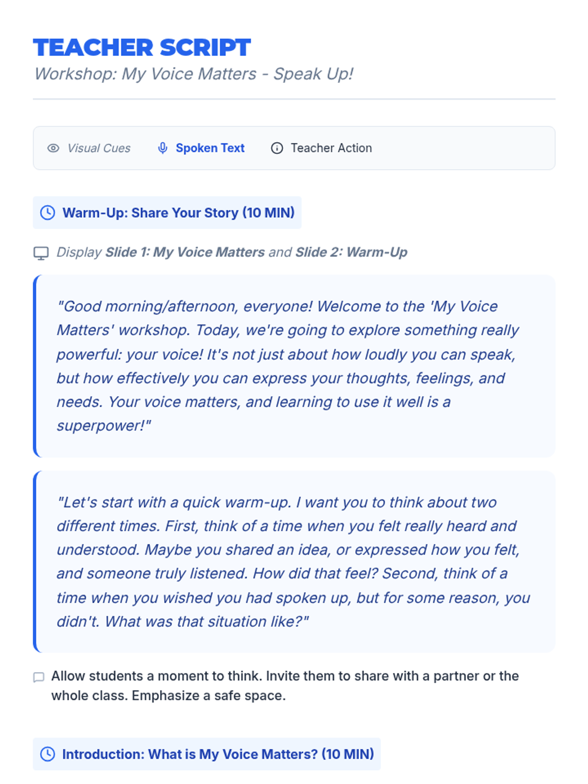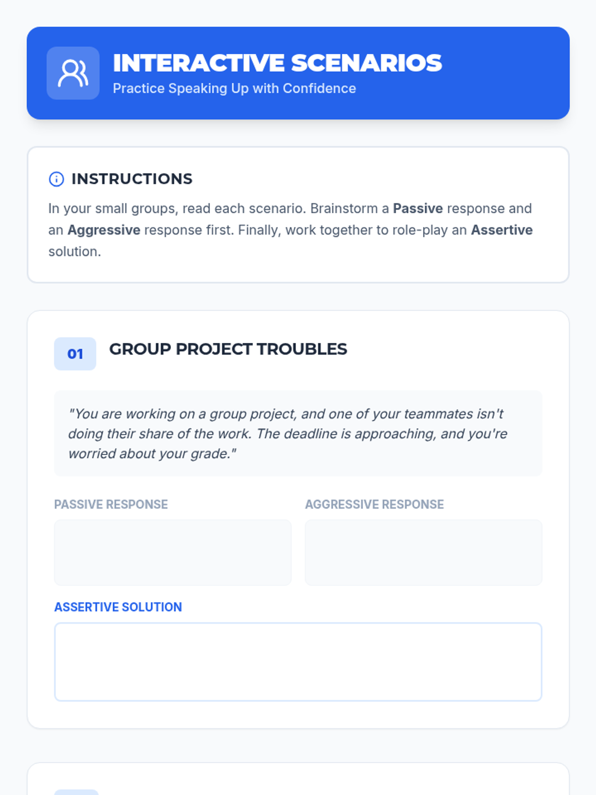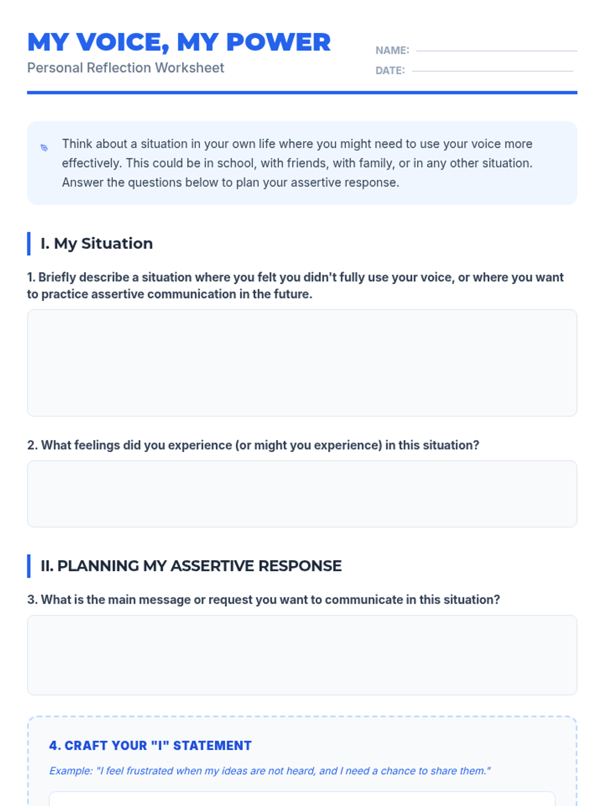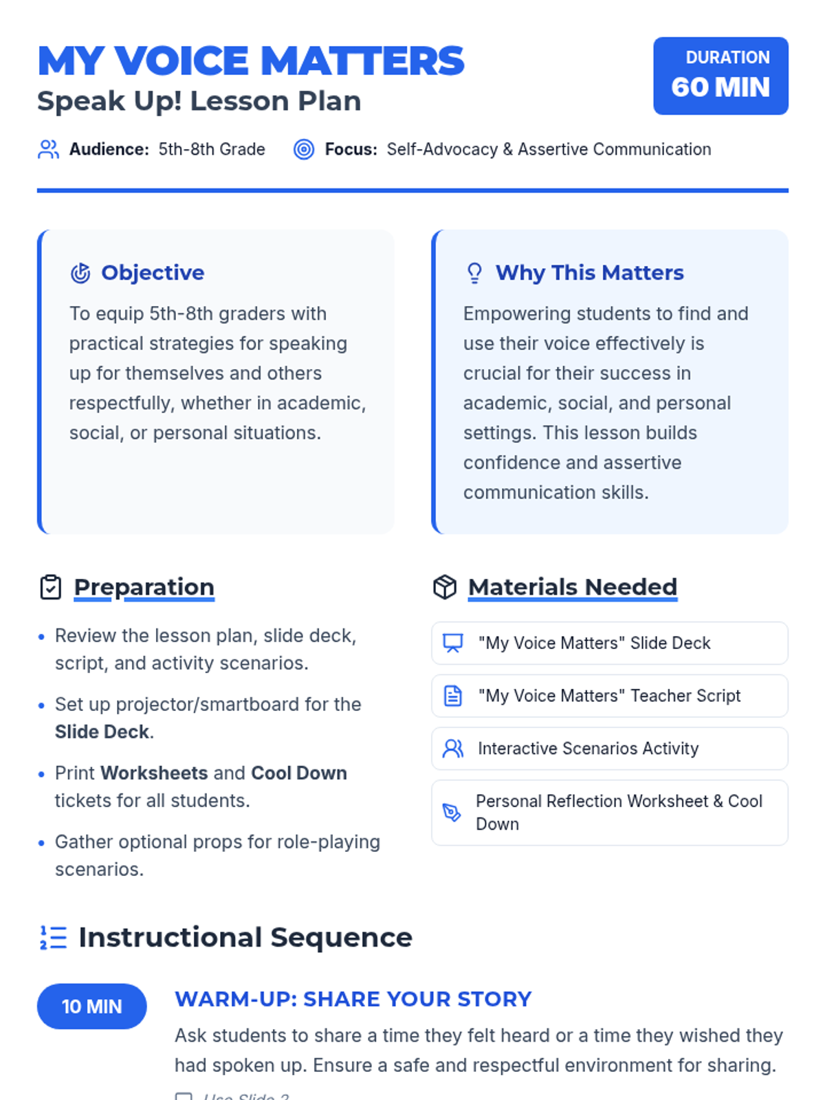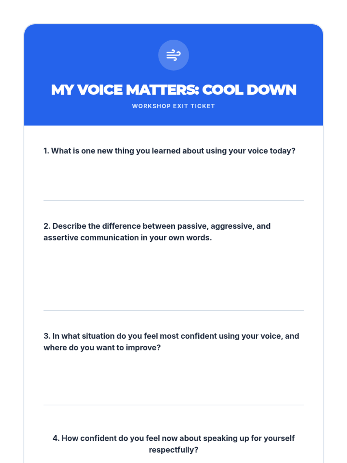 This workshop empowers 5th-8th graders to find and use their voice effectively, teaching them the importance of self-advocacy through interactive scenarios and assertive communication strategies.