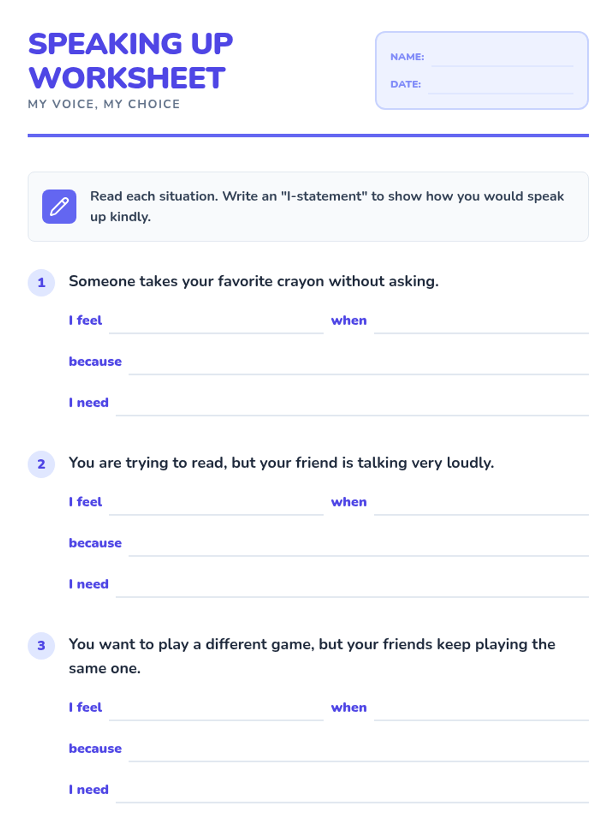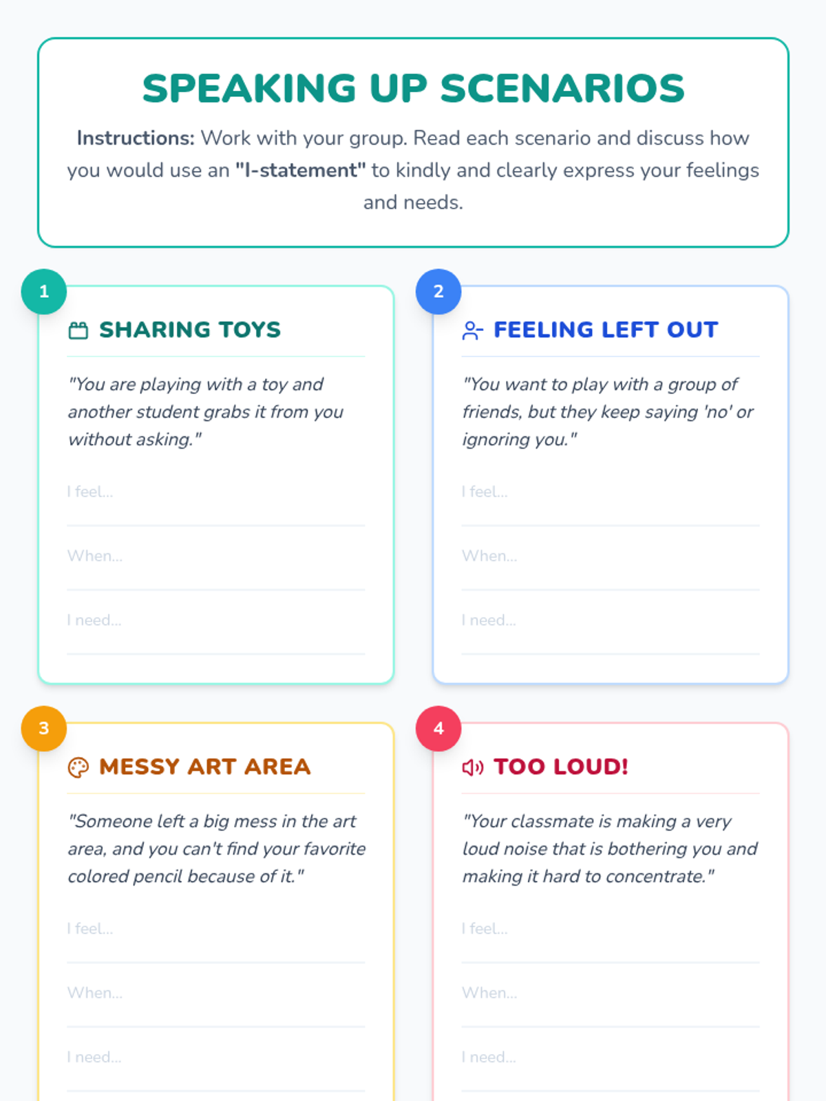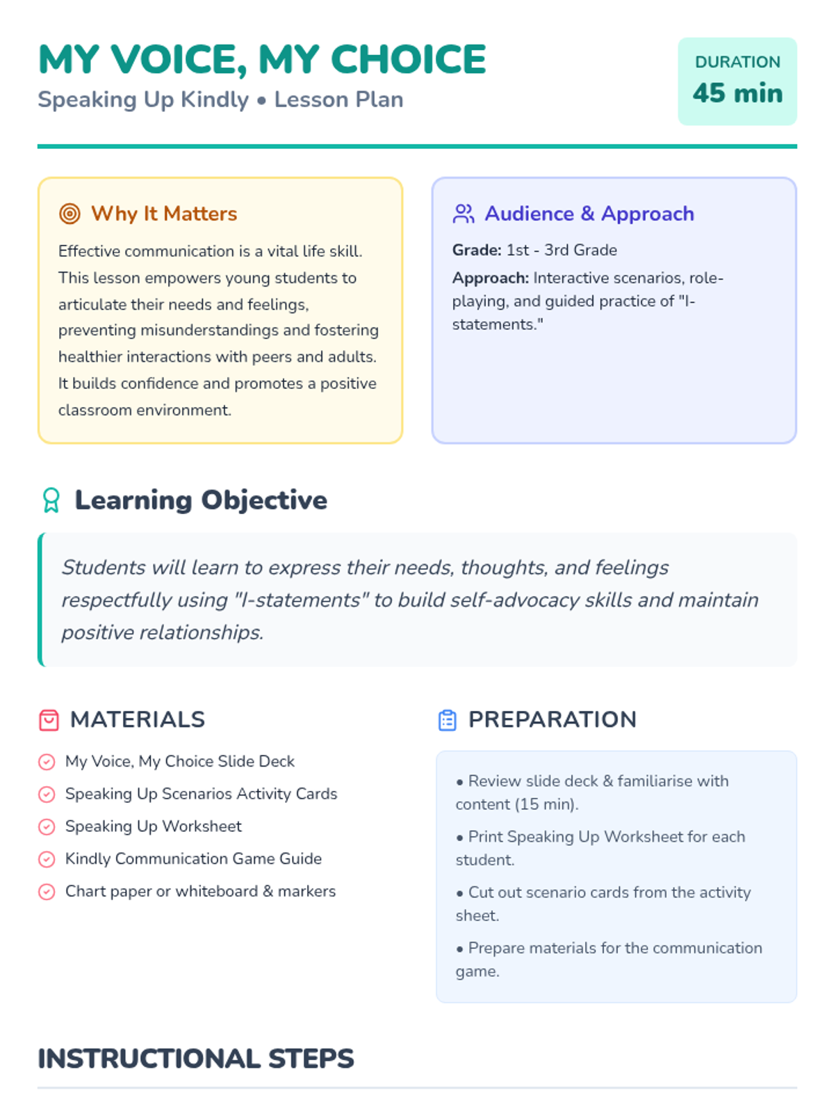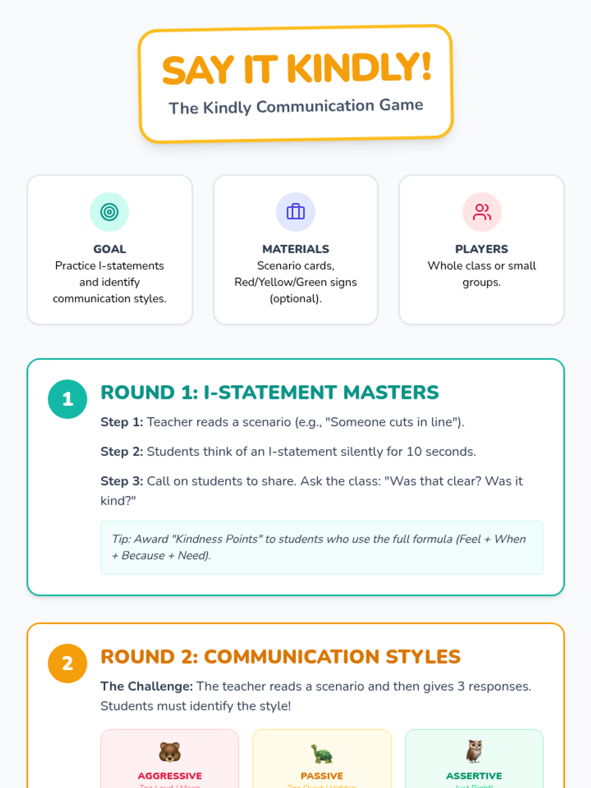 An empowering lesson for 1st-3rd grade students on assertive communication, 'I-statements', and expressing needs respectfully. Students will learn to distinguish between passive, aggressive, and assertive voices through interactive role-playing and games.