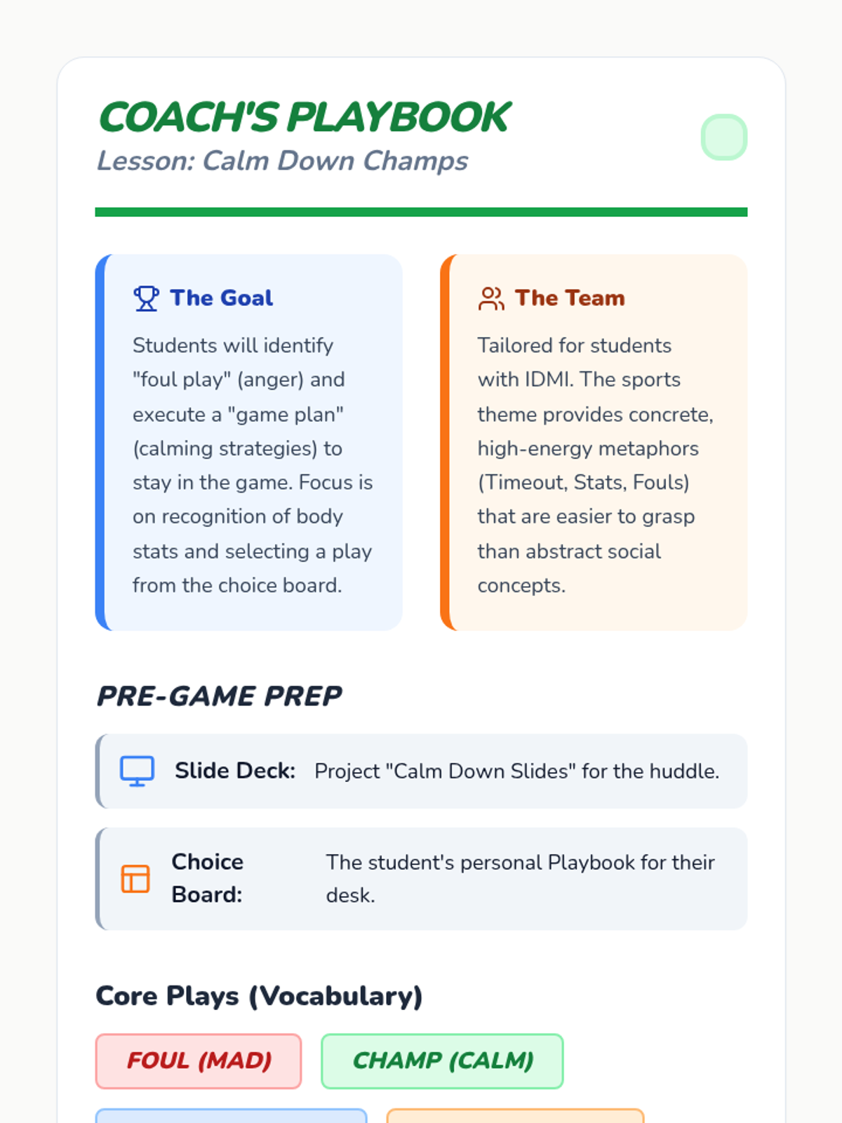 A social-emotional learning lesson focused on identifying anger and practicing conflict resolution through sports-themed scenarios and calming "game plans," specifically designed for 4th-grade students with moderate intellectual disabilities.