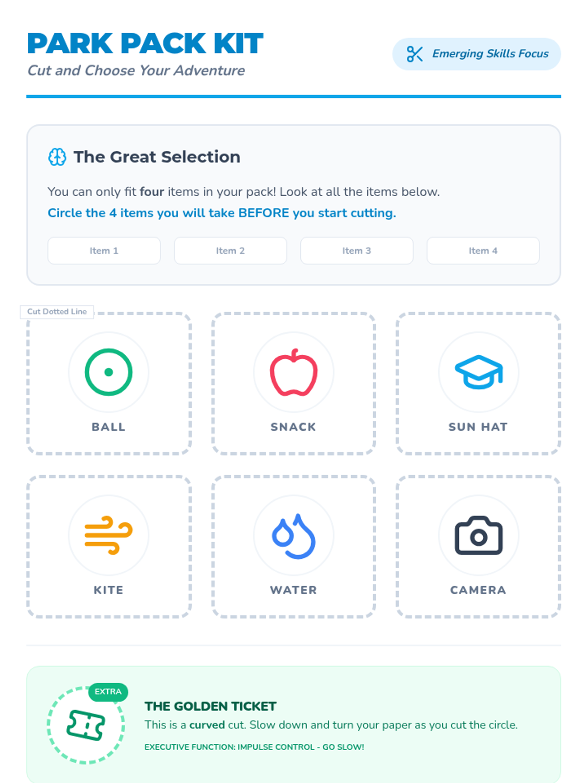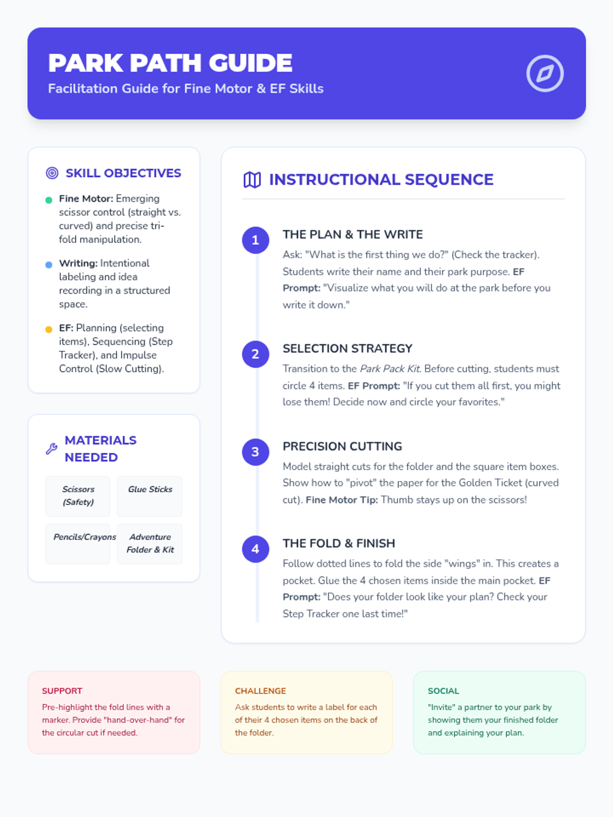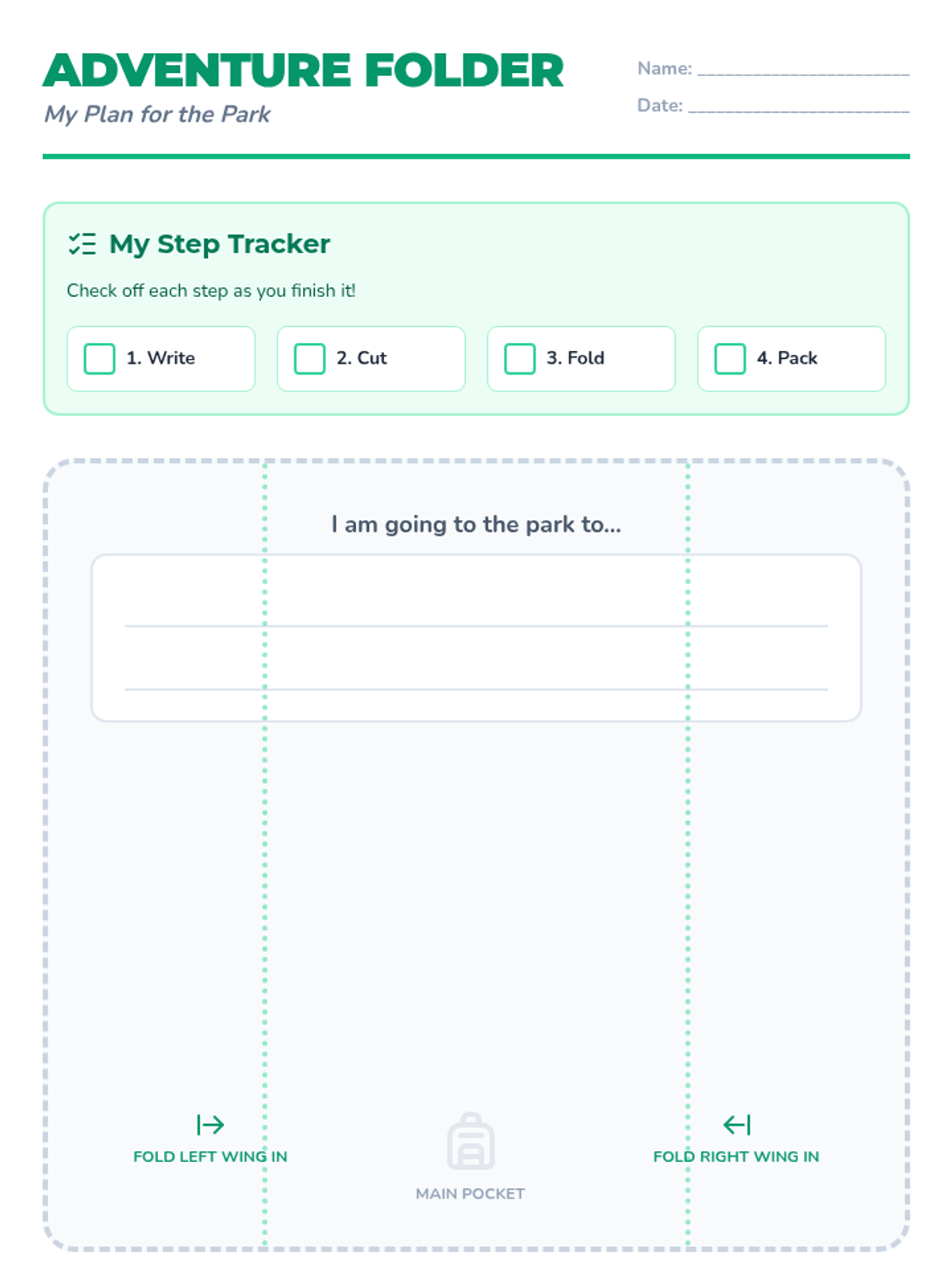A multi-step fine motor activity focused on planning and executing a trip to the park. Students practice folding, writing, and cutting while developing executive functioning skills like sequencing and task persistence.