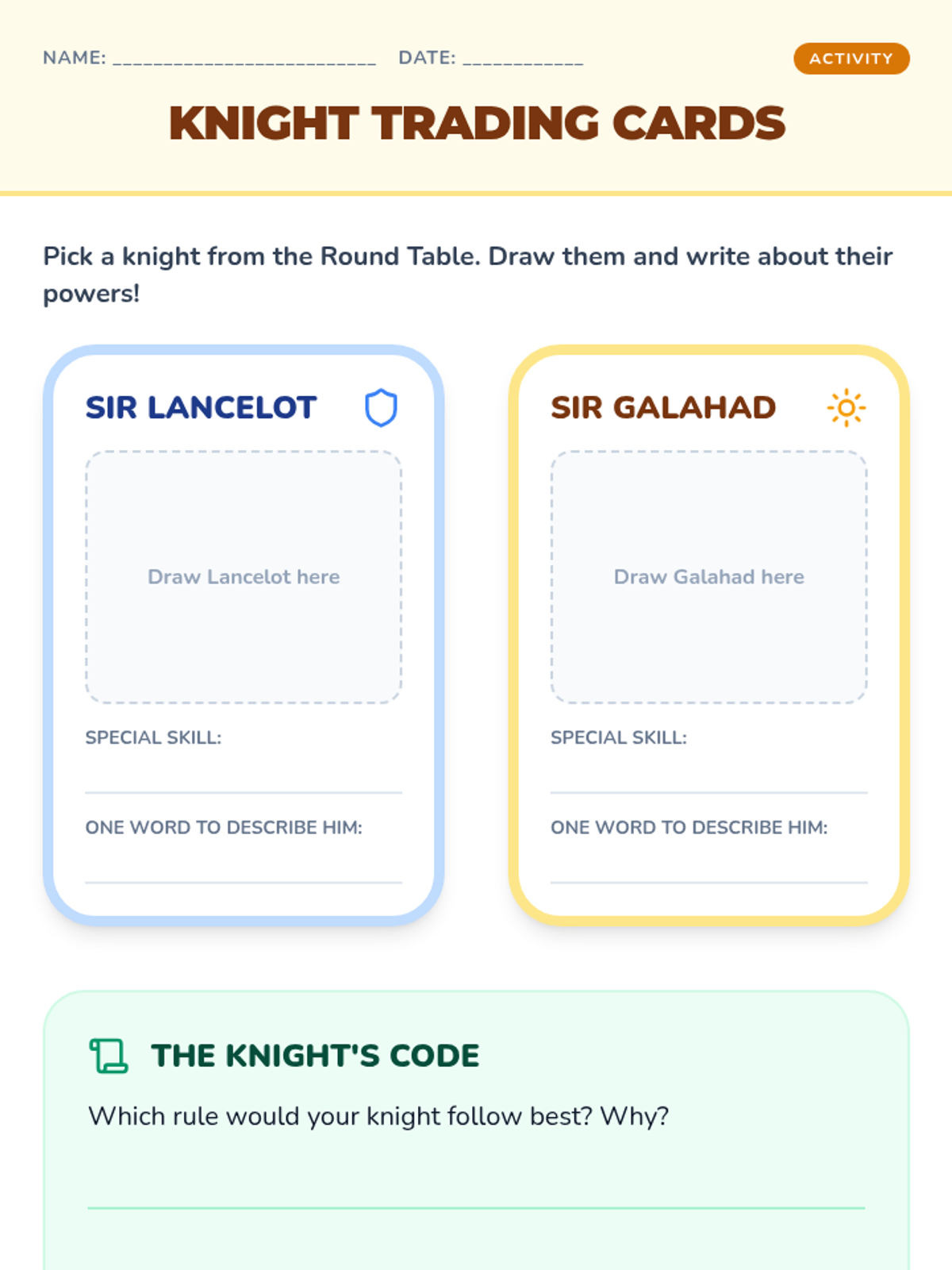 A lesson exploring the characters and values of King Arthur's knights, focusing on the concept of the Round Table and chivalry through character analysis.