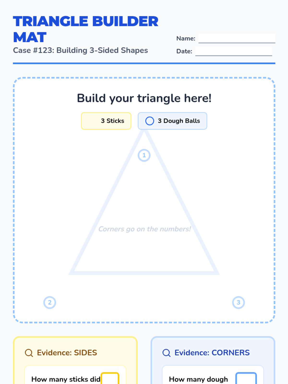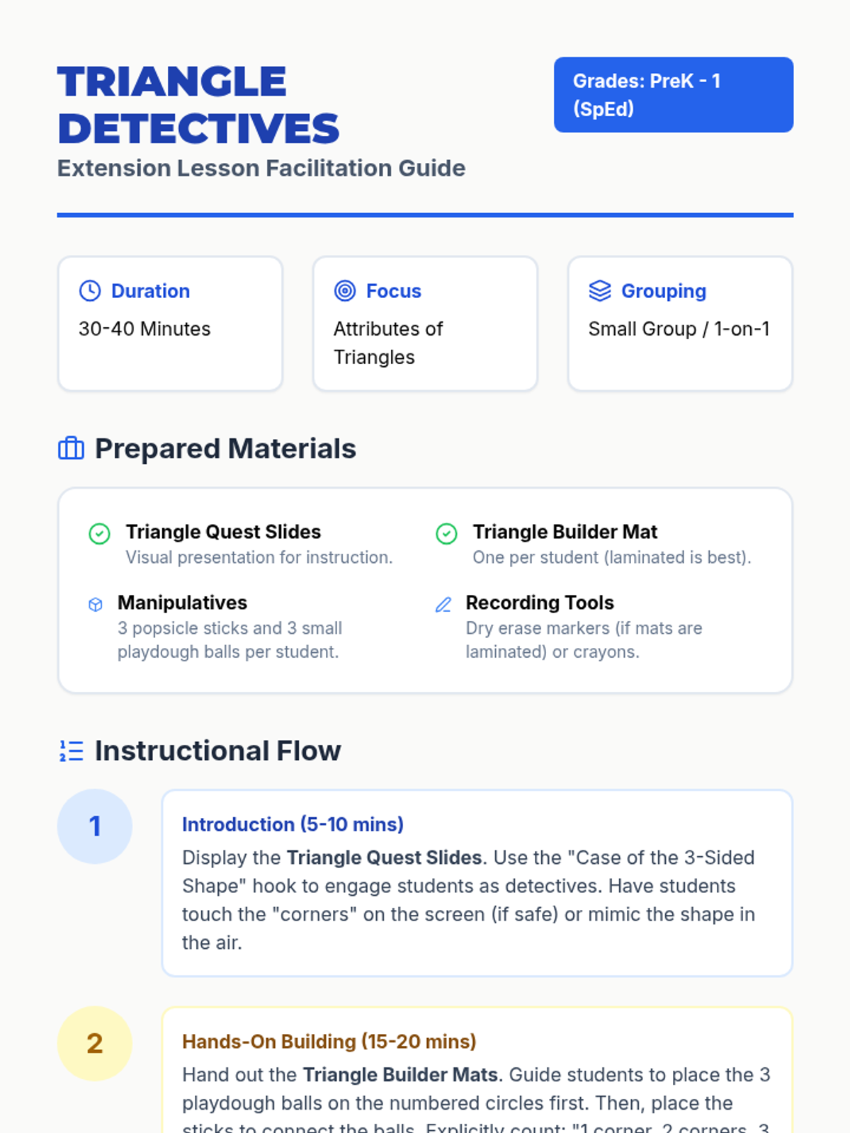 An extension lesson for PreK-1 Special Education students focusing on identifying, building, and counting the attributes of 2-D triangles using manipulatives.