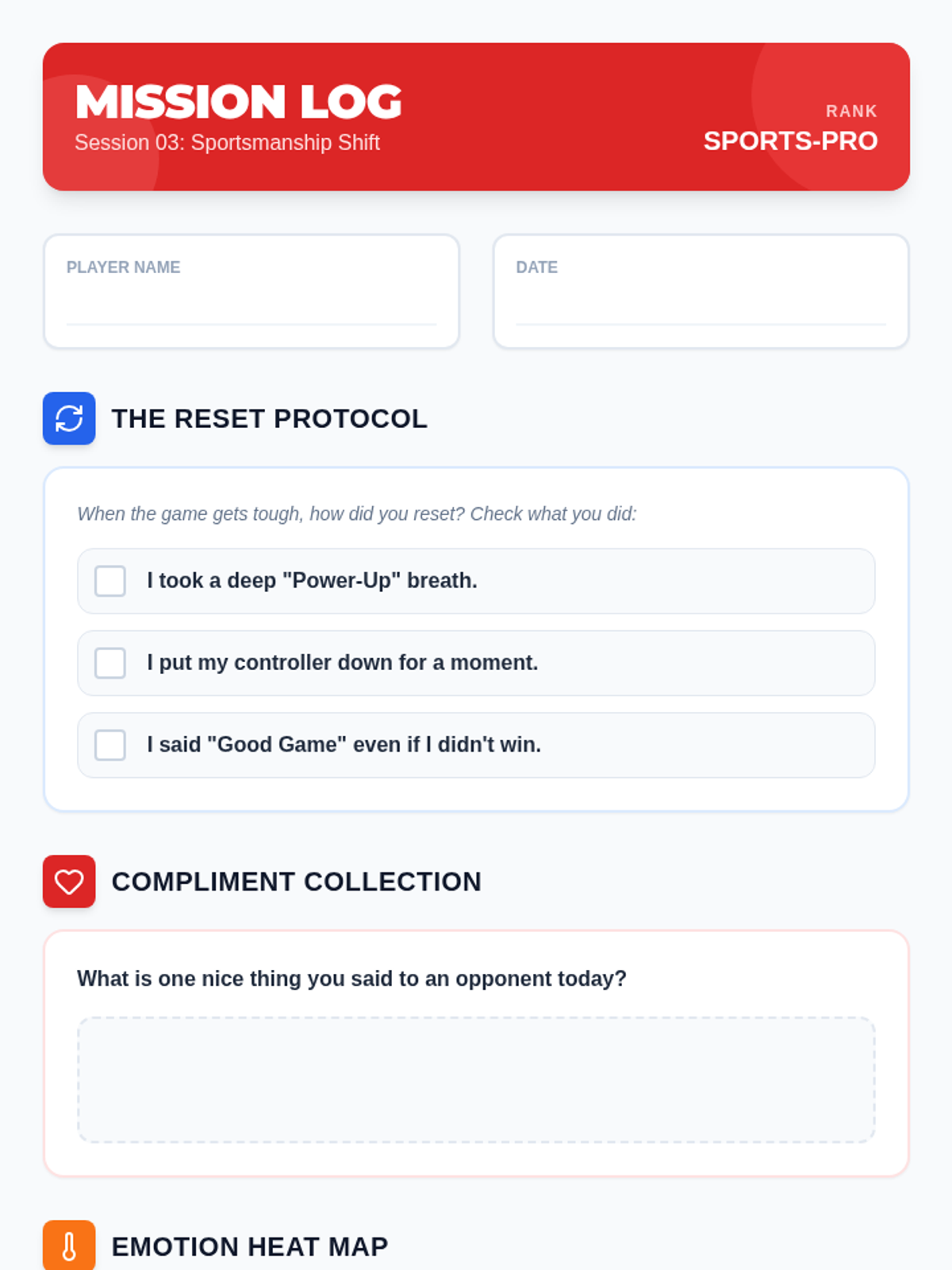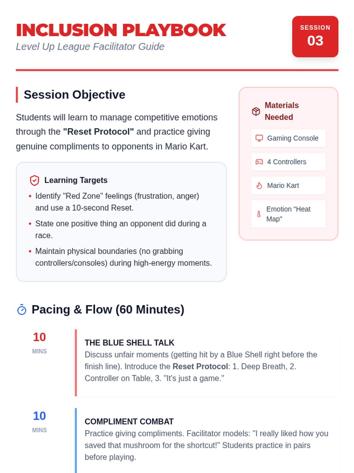 Focuses on managing emotions during competitive play in Mario Kart. Students practice 'Resetting' after a loss and giving genuine compliments to opponents.