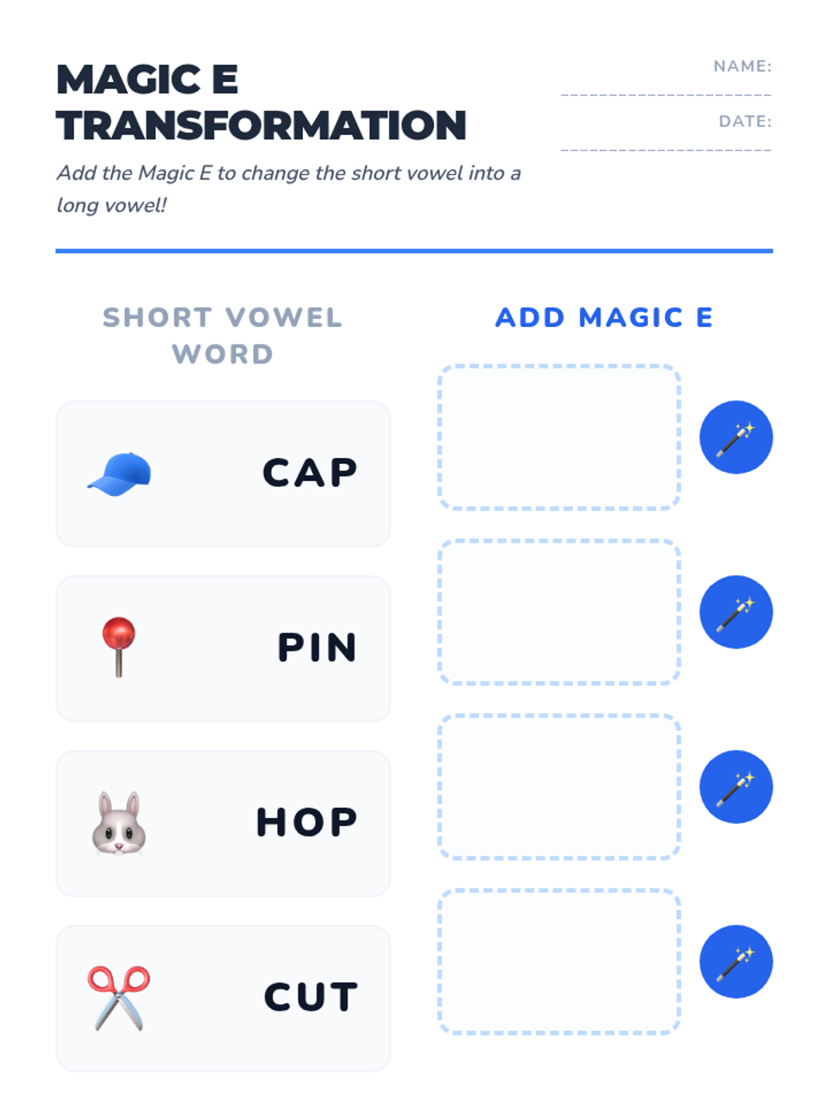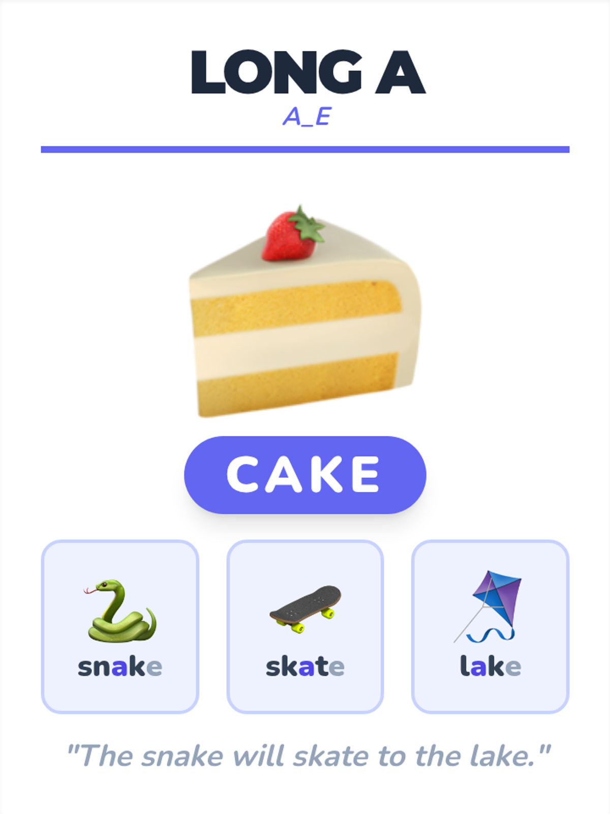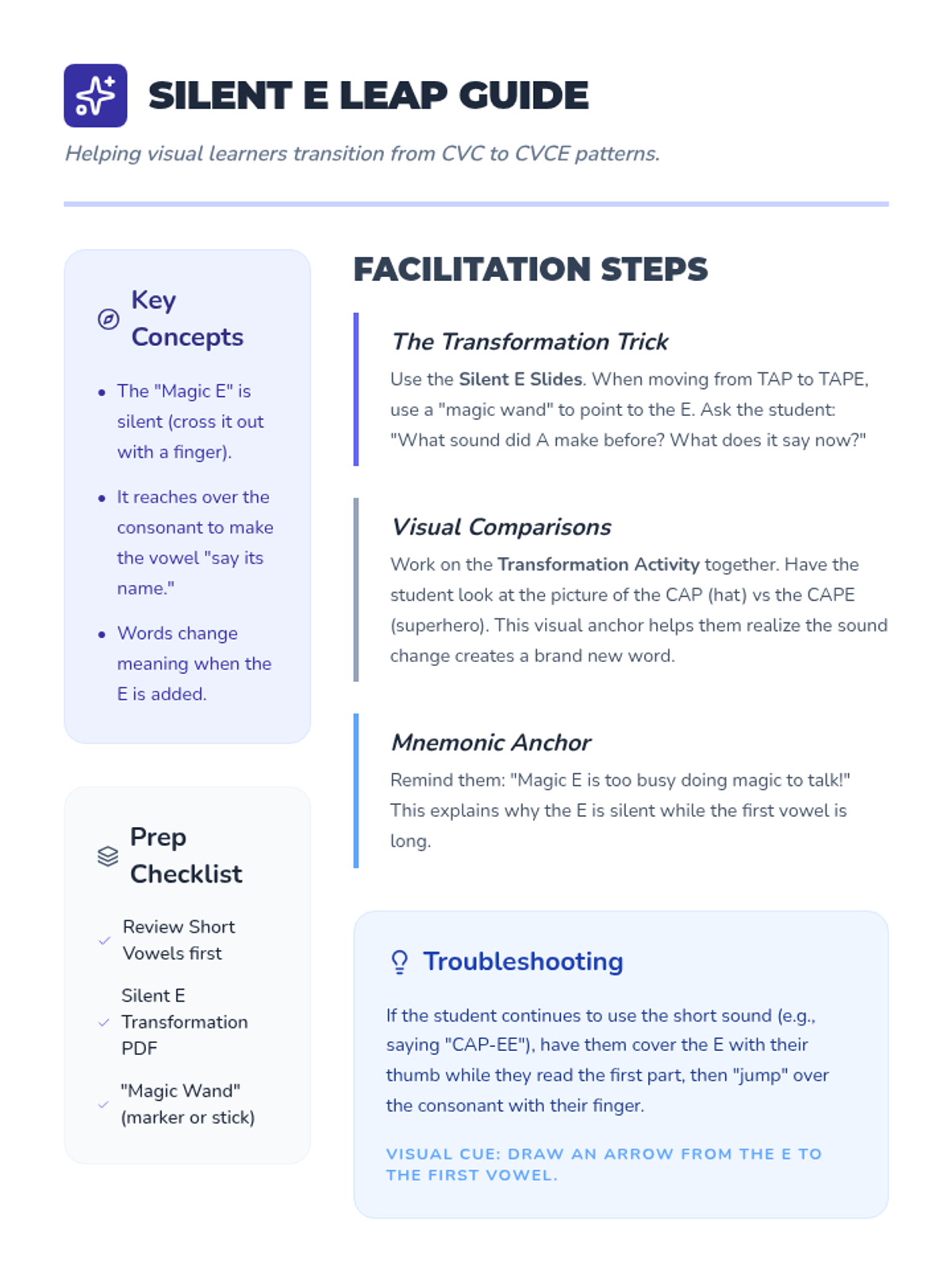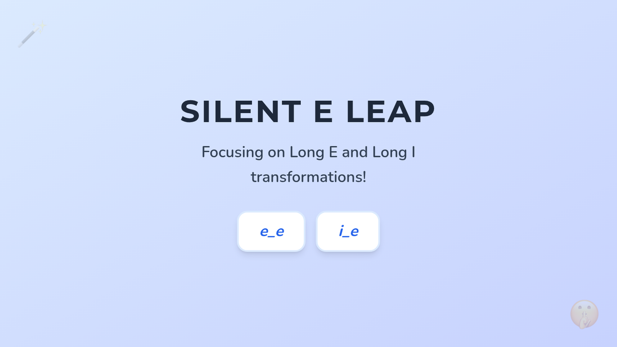 Introduces the silent E pattern (CVCE) and how it "makes the vowel say its name," featuring visual transformations and word-building practice.