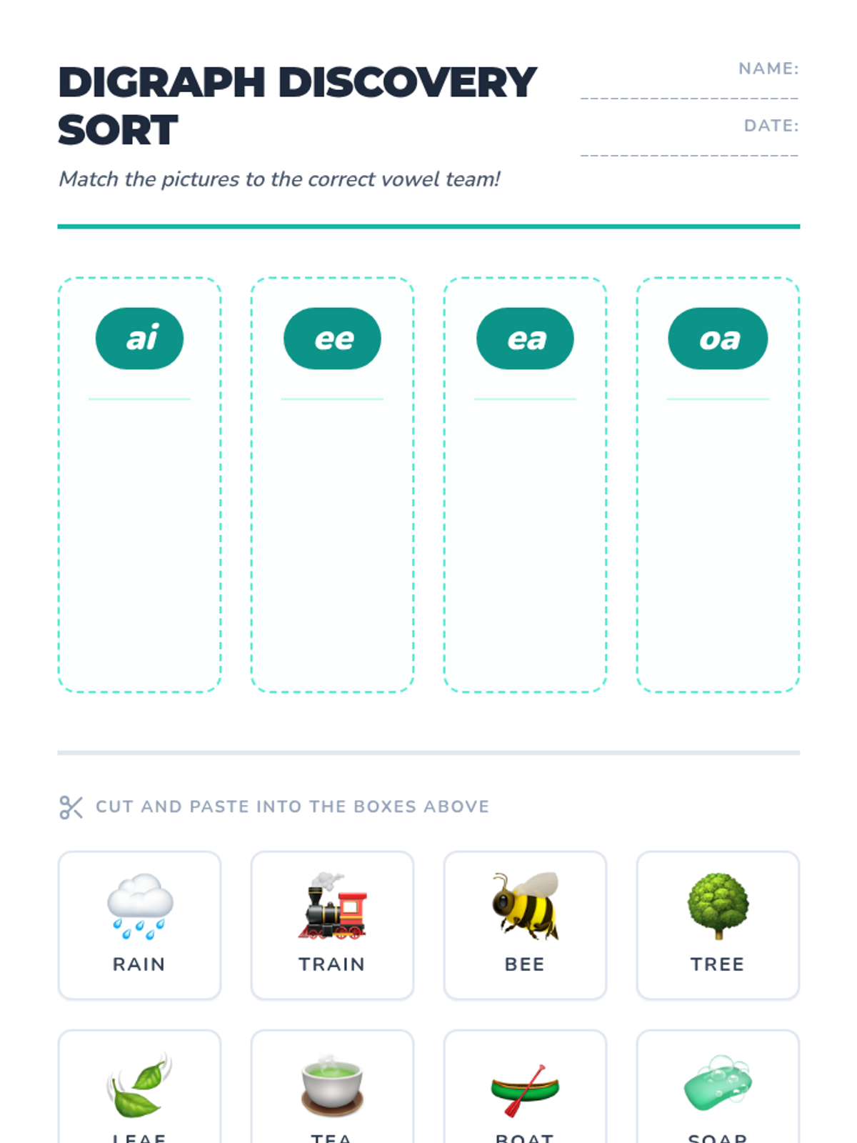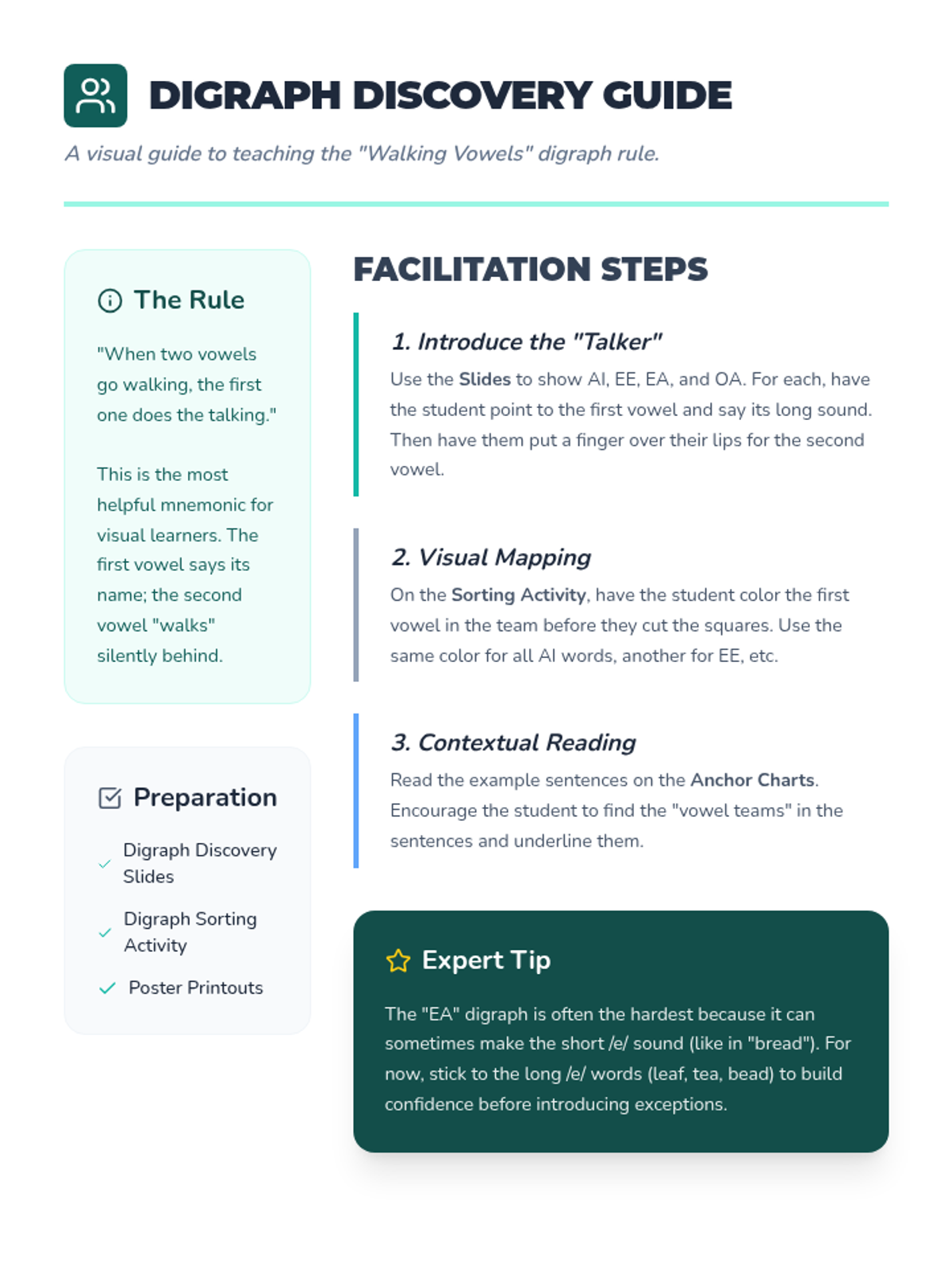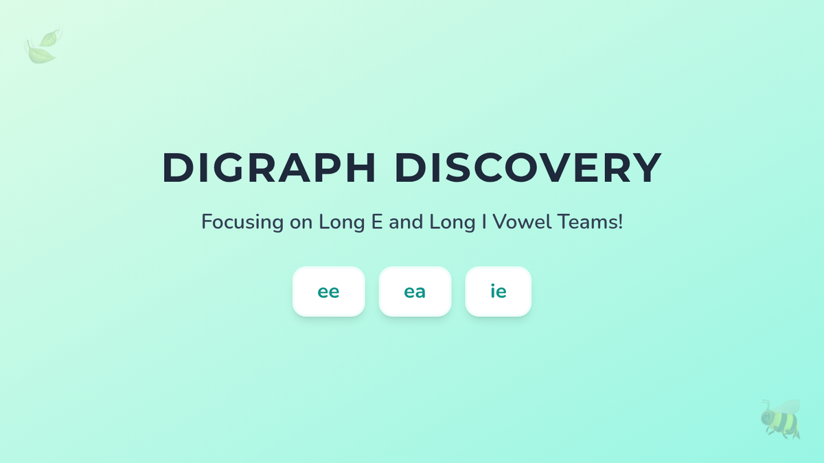 Focuses on common vowel digraphs (AI, EE, EA, OA) where two vowels work together to make one long vowel sound.