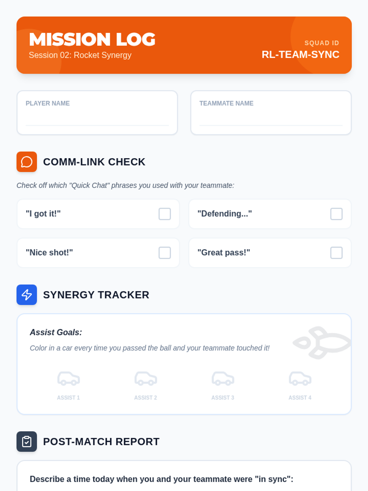 Focuses on cooperative play and basic communication during Rocket League. Students learn to use quick-chat or verbal cues to coordinate with teammates.