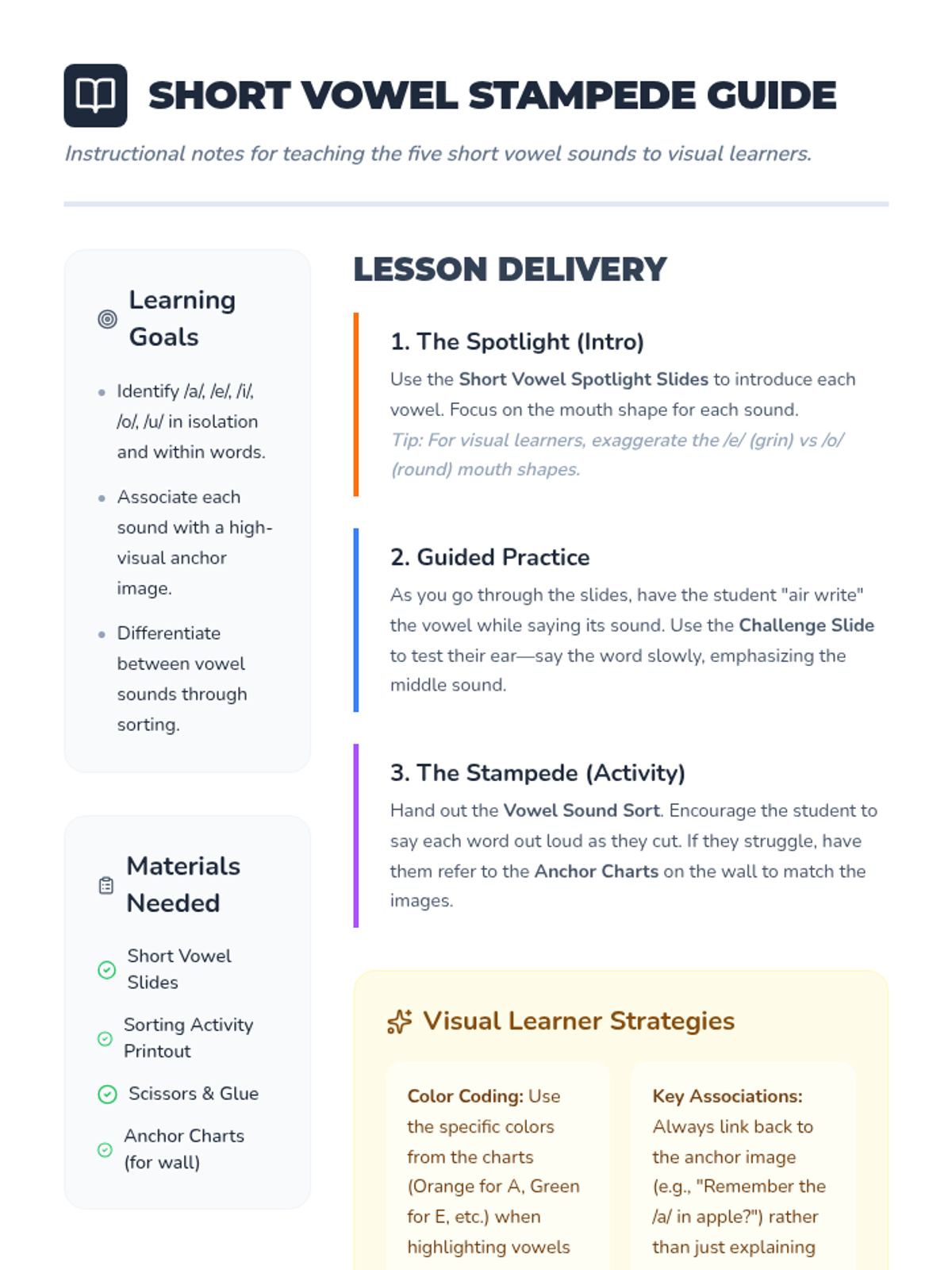 Focuses on the identification and differentiation of short vowel sounds (A, E, I, O, U) using visual anchors and word-image associations.