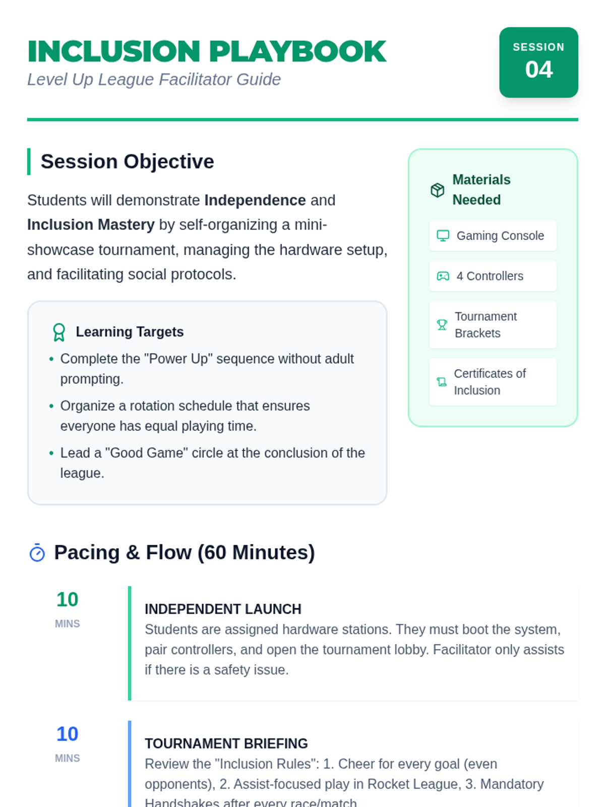 The final session where students organize a mini-tournament, demonstrating both hardware mastery and inclusion skills learned throughout the program.