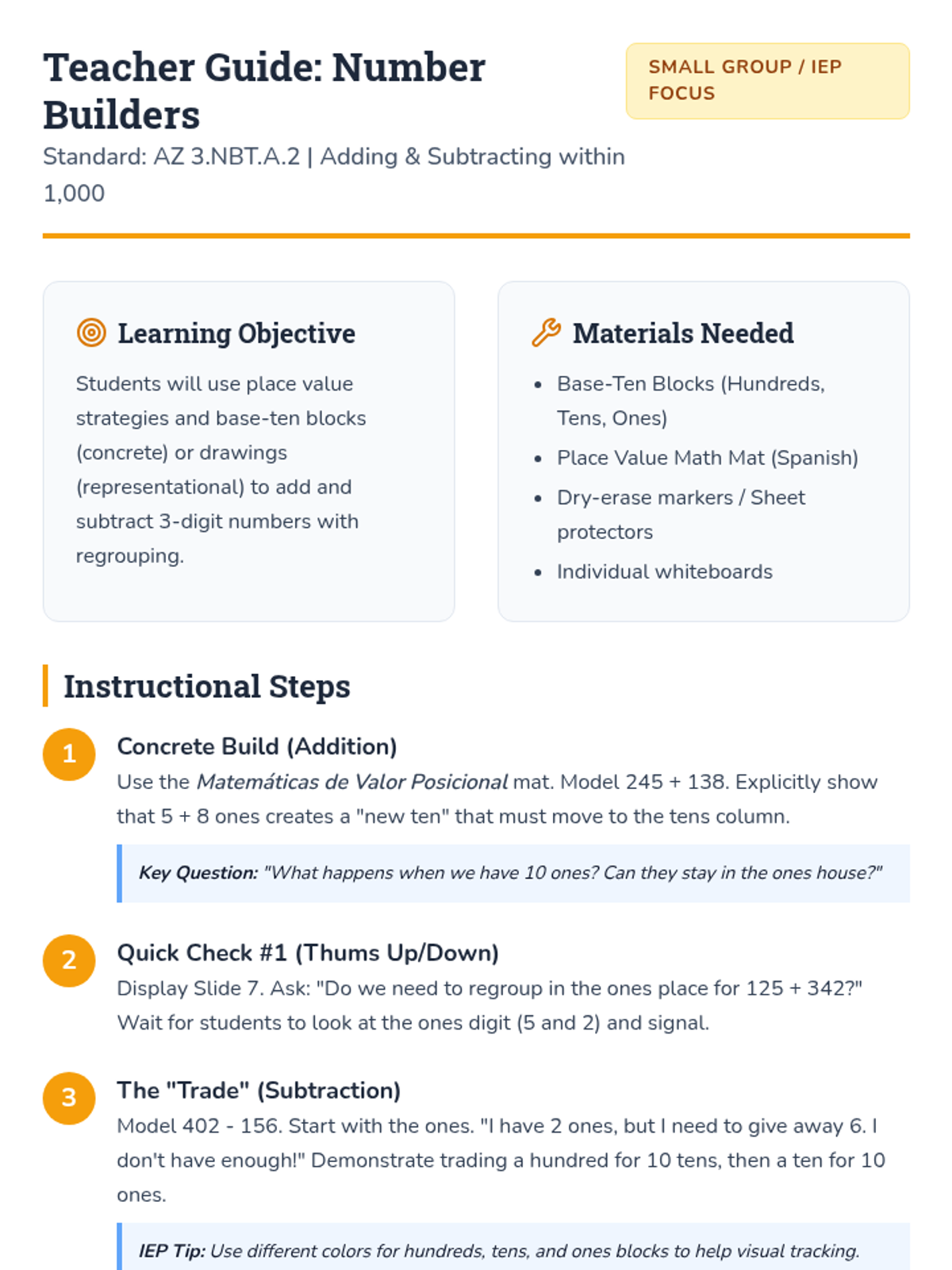 A small-group lesson for 3rd grade students with IEPs focusing on addition and subtraction within 1,000 using place value strategies, manipulatives, and visual models. Student materials are provided in Spanish to support bilingual learners.