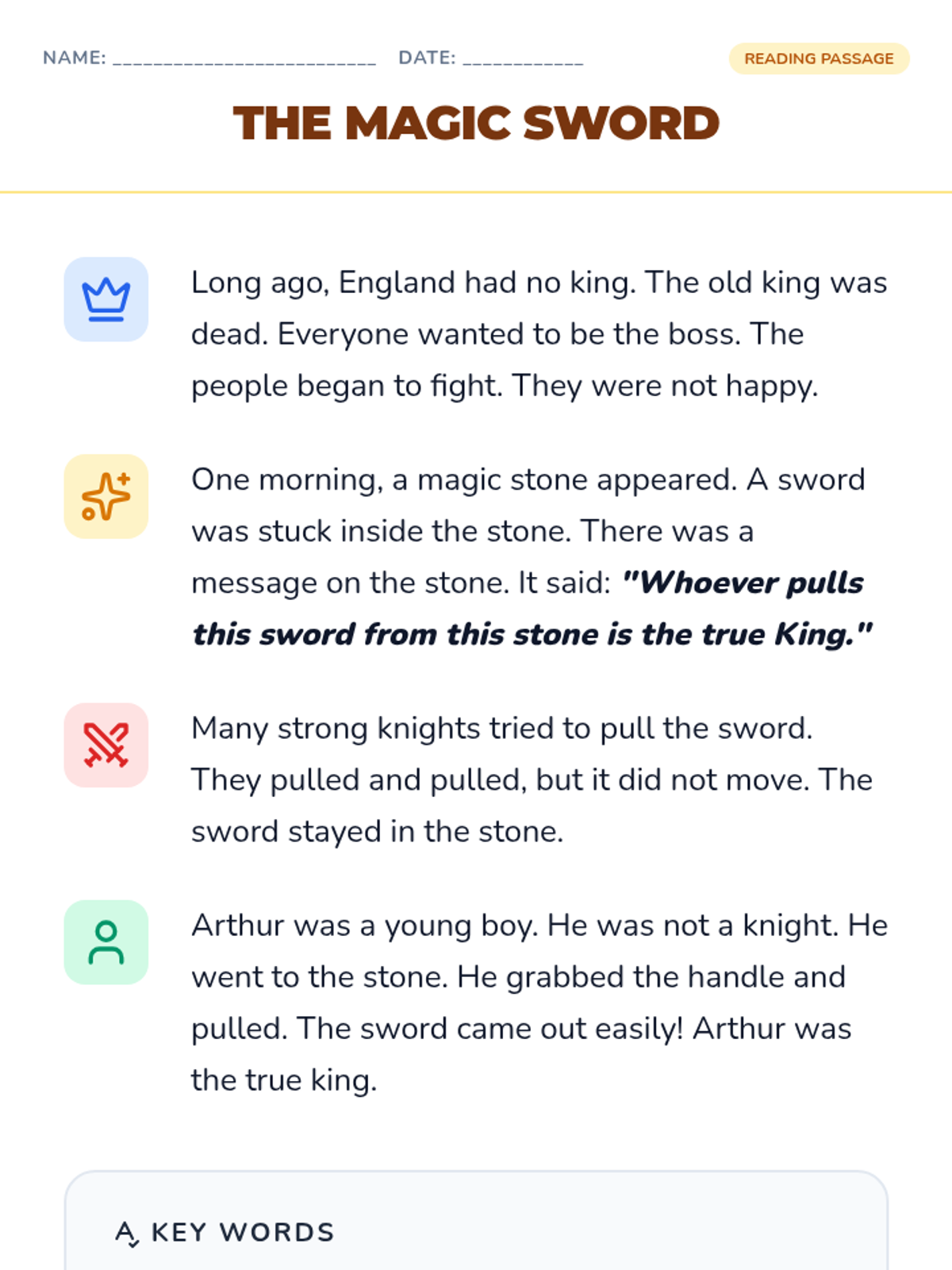 An introduction to the legend of King Arthur and the Sword in the Stone, focusing on story elements and key vocabulary through simplified text.