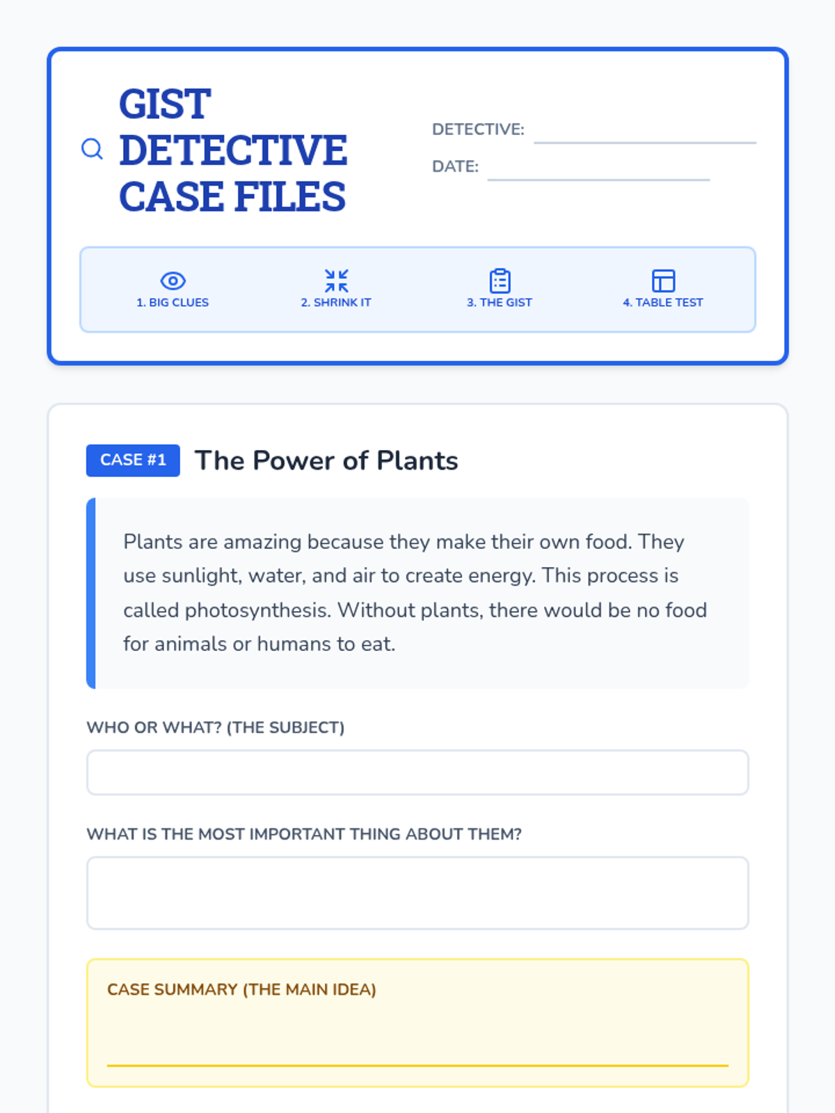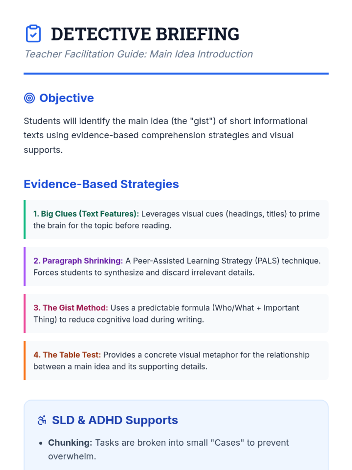 An introductory lesson on identifying the main idea in informational texts using evidence-based strategies. Designed with visual supports and chunked information to support students with SLD and ADHD.