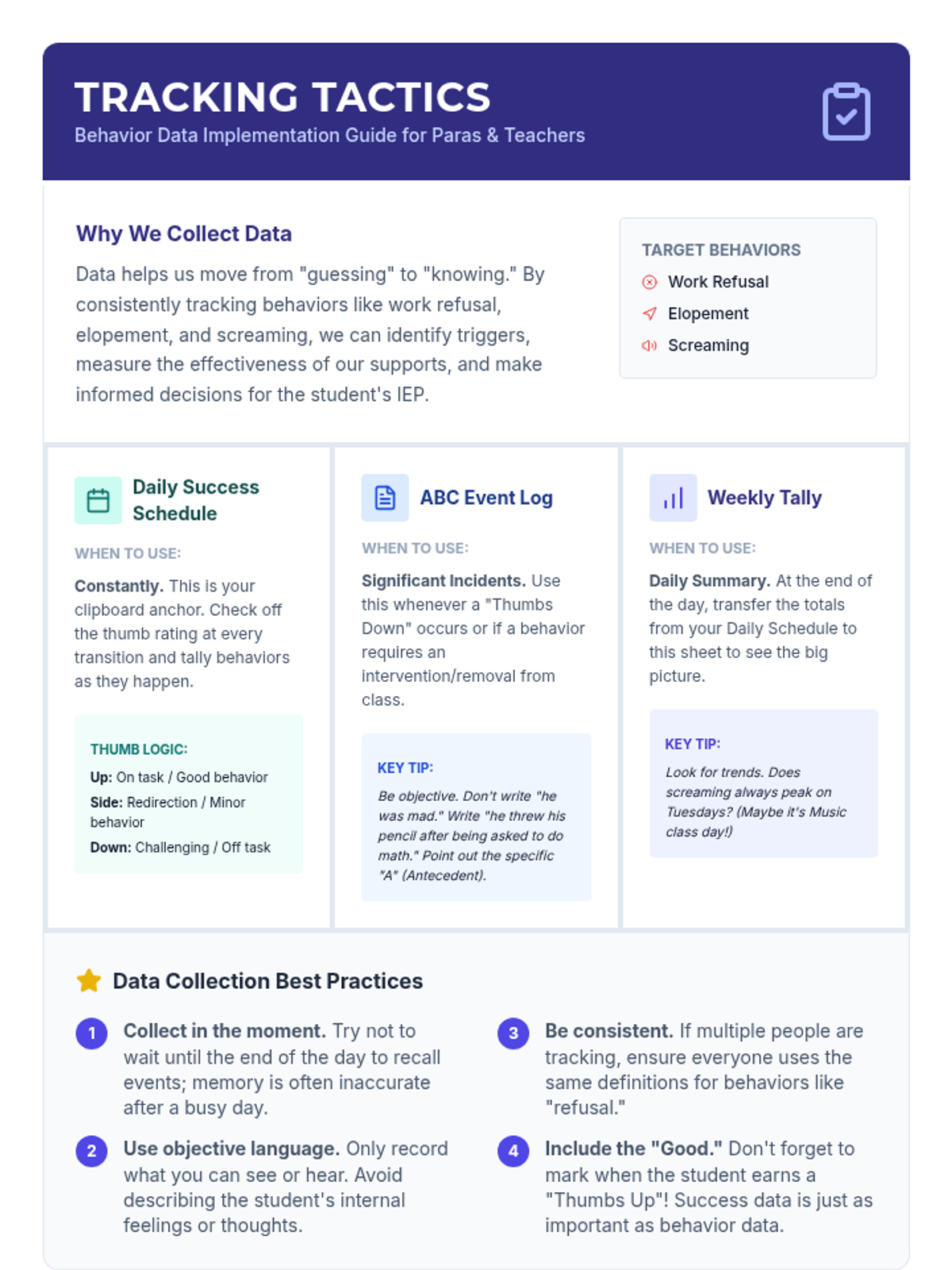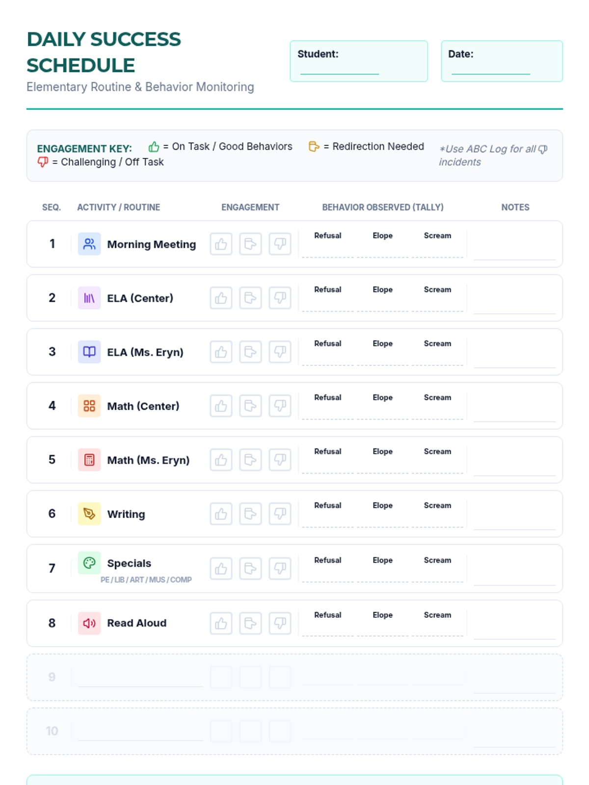 A comprehensive system for tracking and managing behavioral challenges in students with autism, featuring ABC logs, visual schedules, and frequency trackers.
