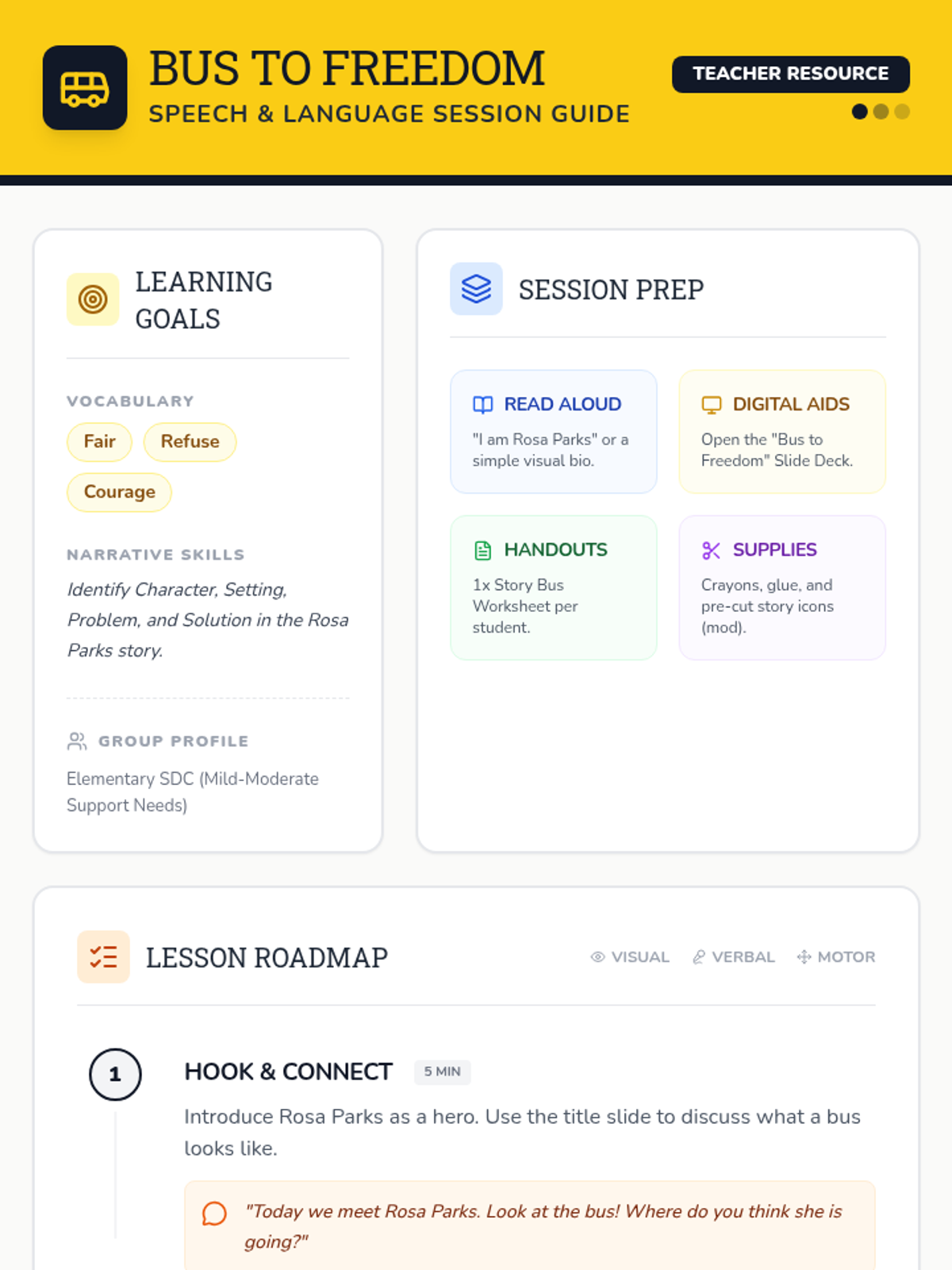 A speech therapy lesson focused on the life of Rosa Parks, designed for elementary mild-moderate SDC students to improve vocabulary and story comprehension through visual organizers and sentence frames.