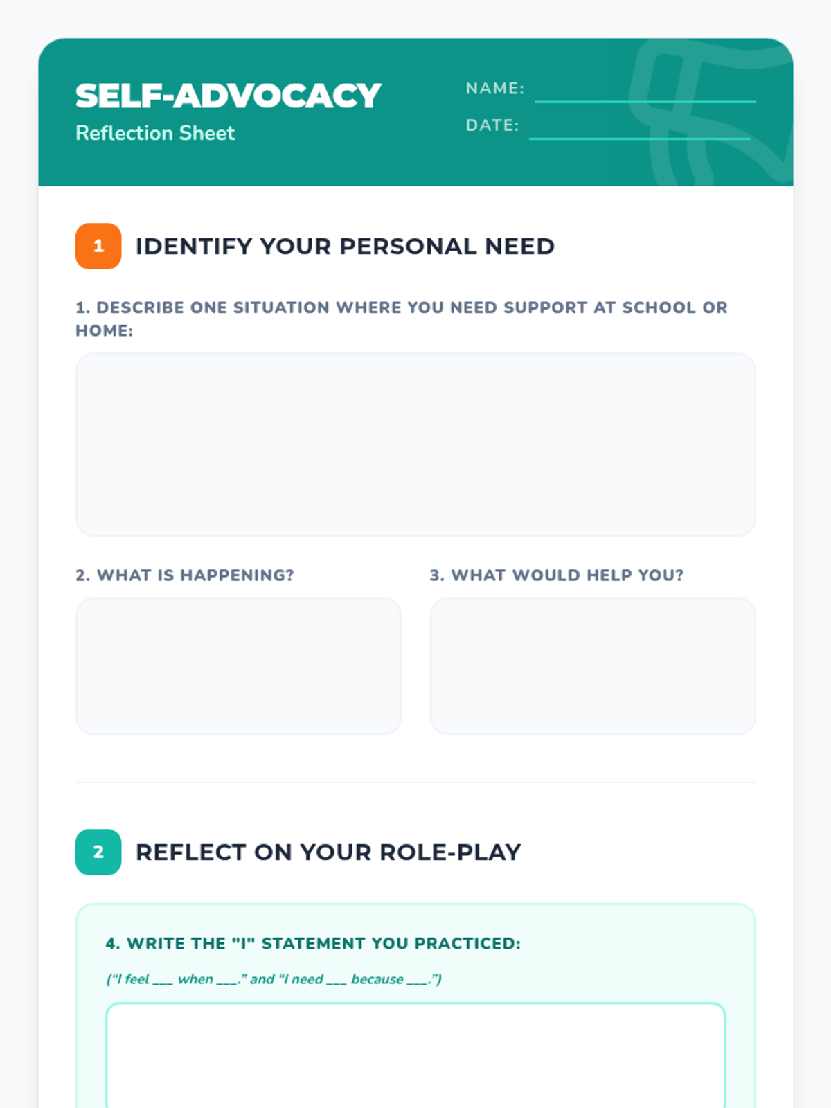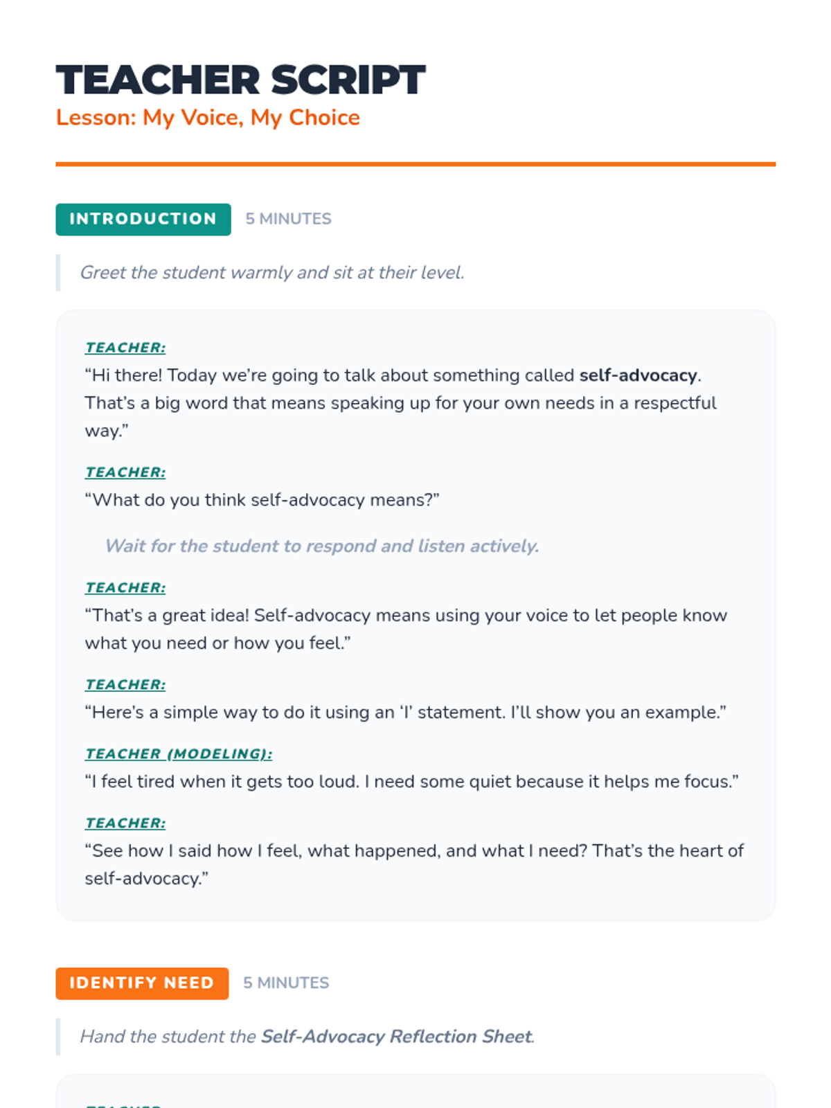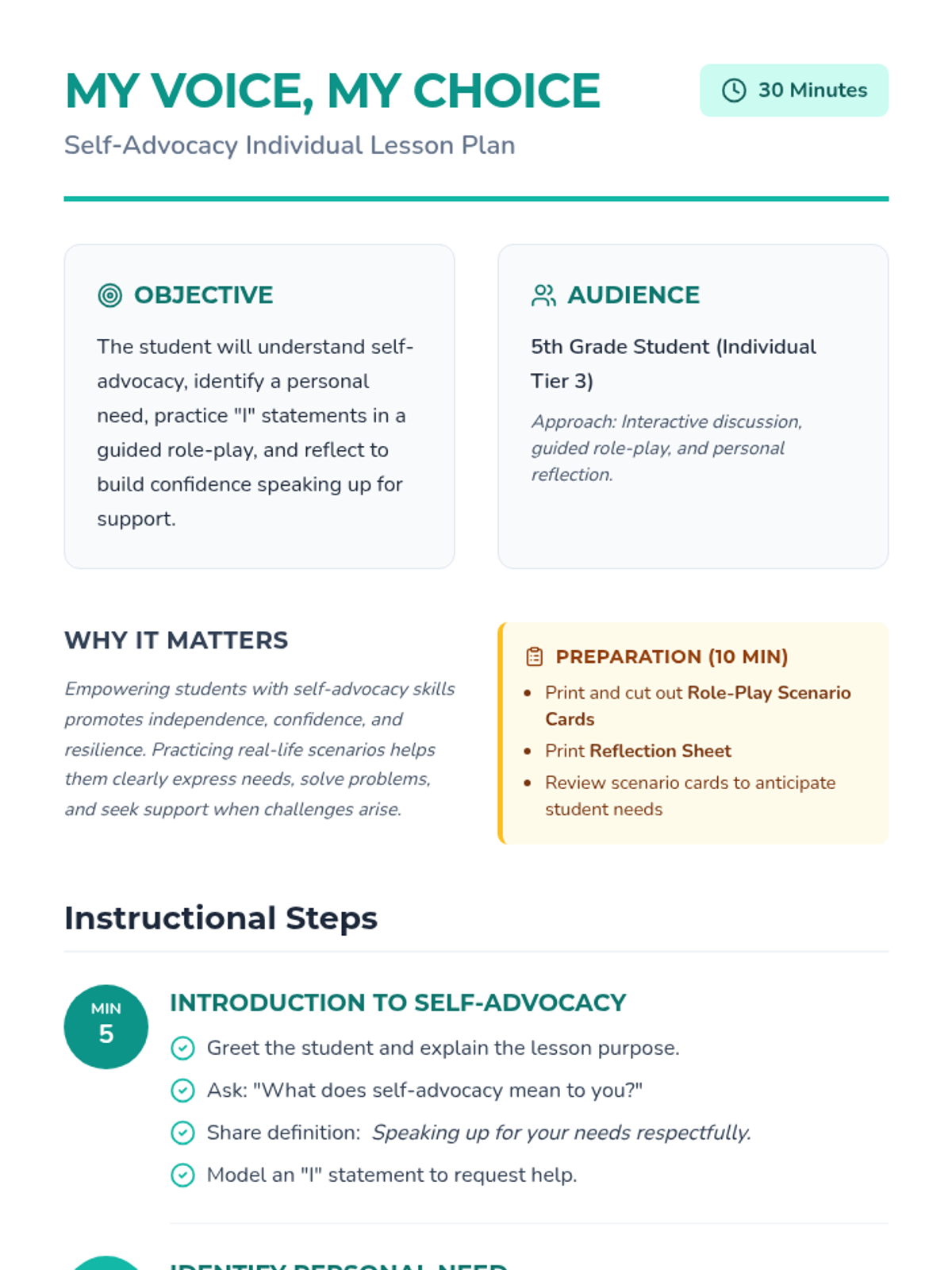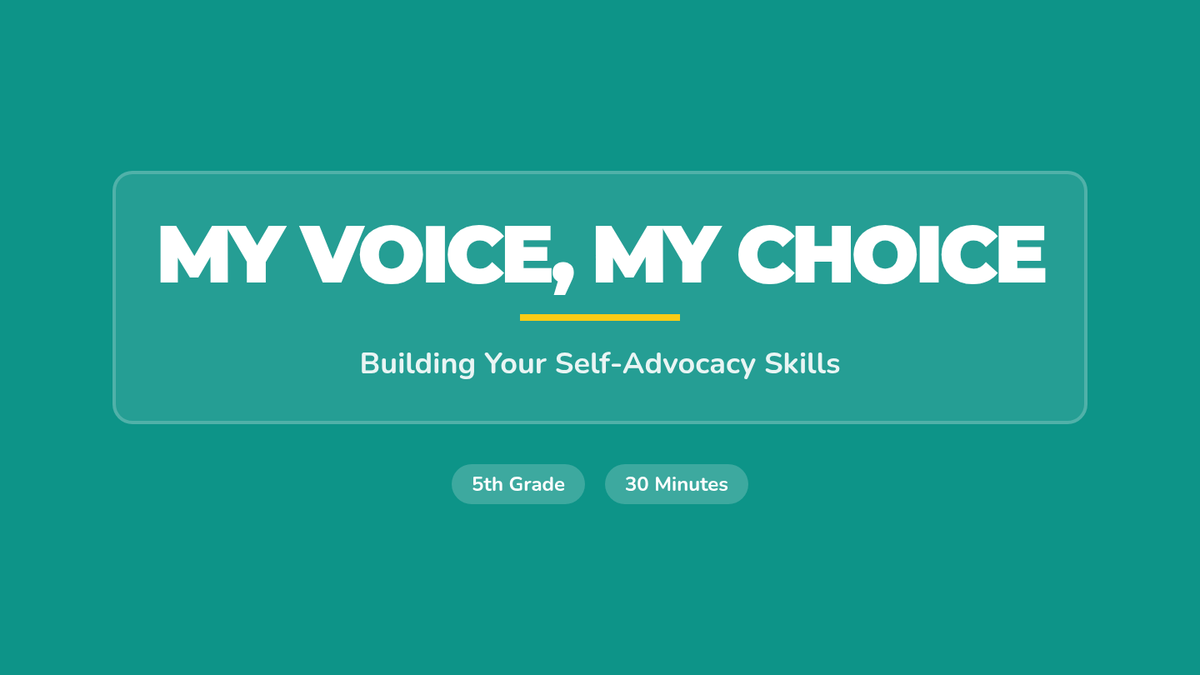 A 30-minute individual lesson for 5th graders to learn self-advocacy skills, including identifying needs and using 'I' statements to speak up respectfully.