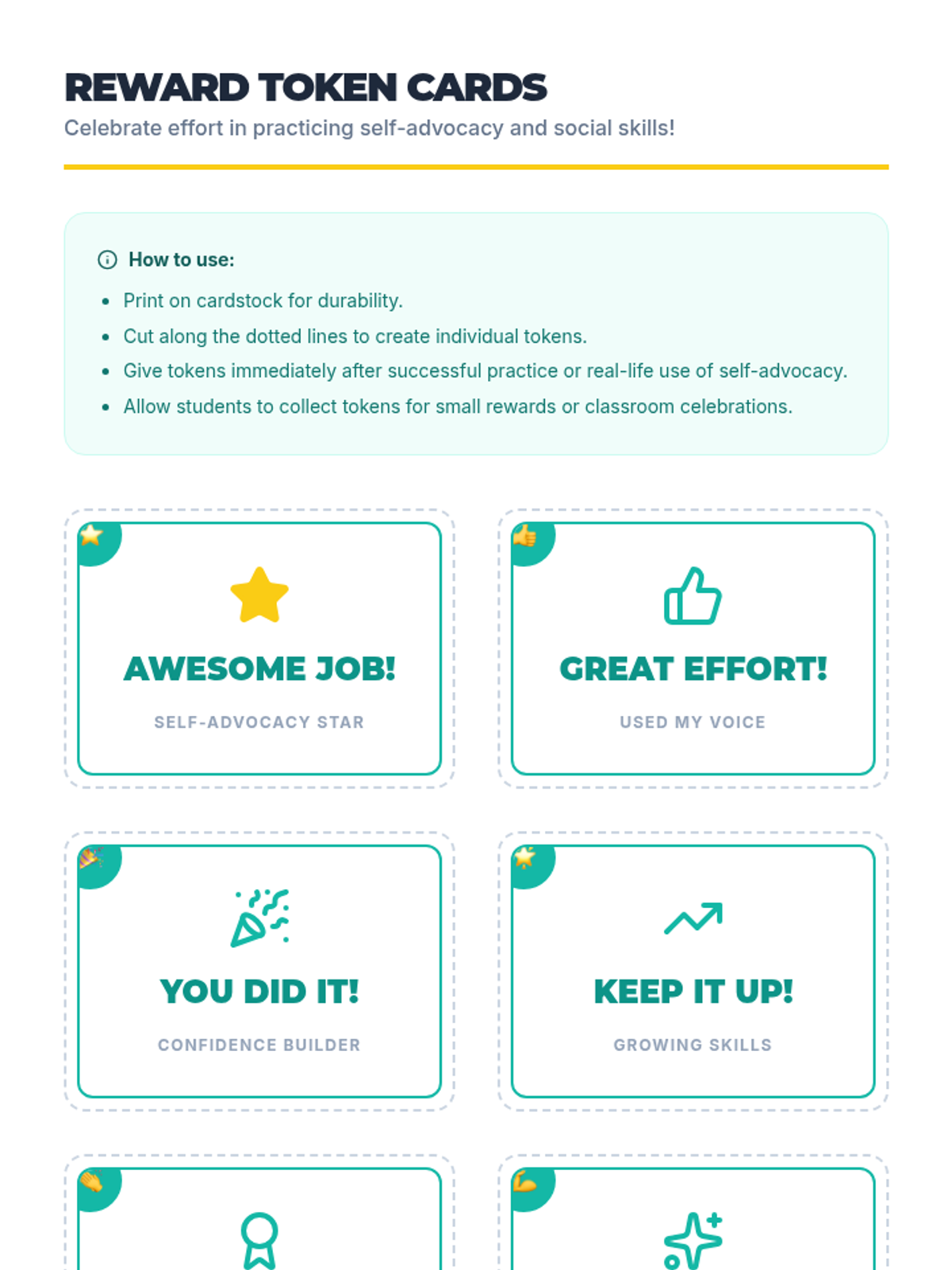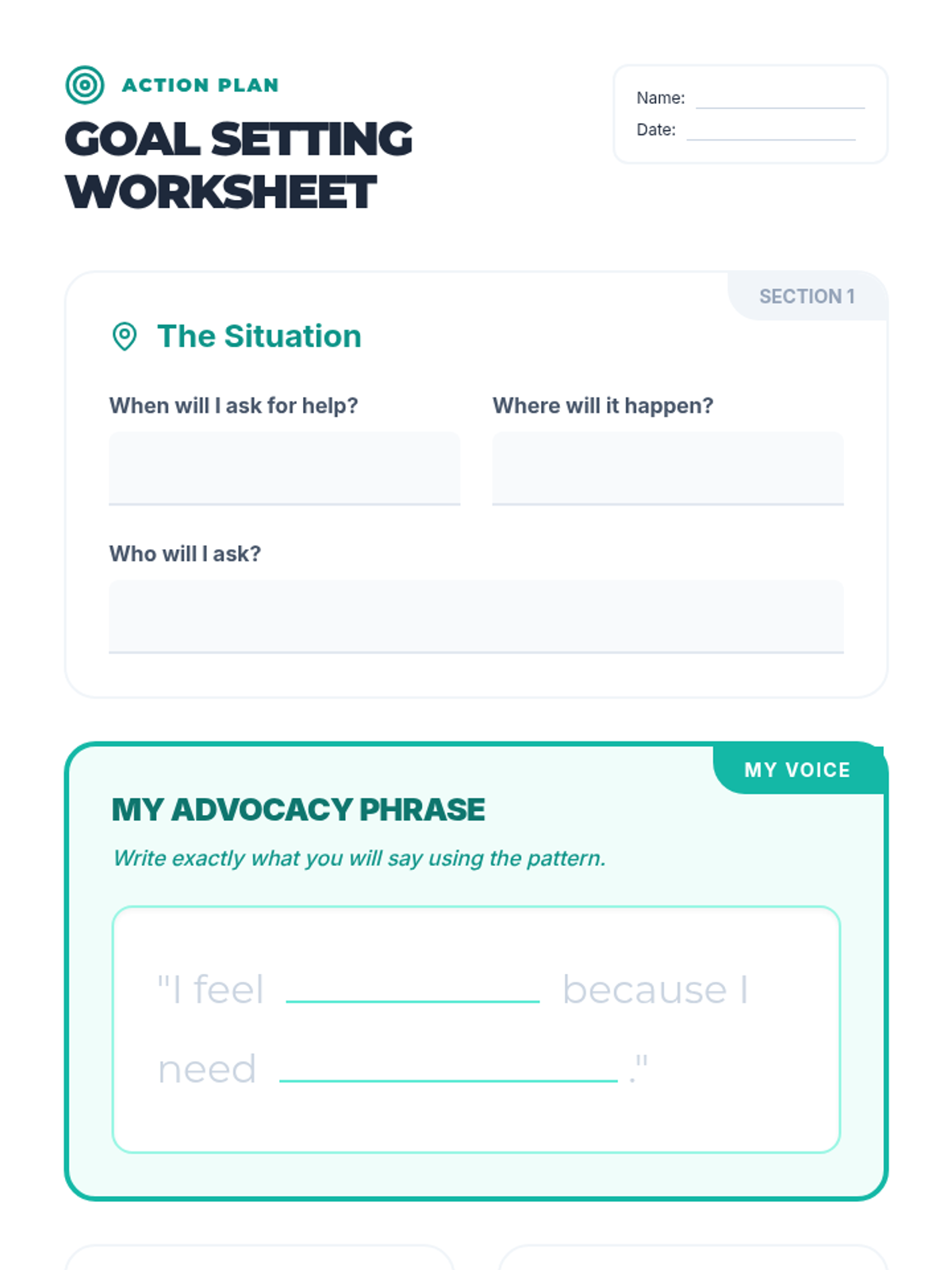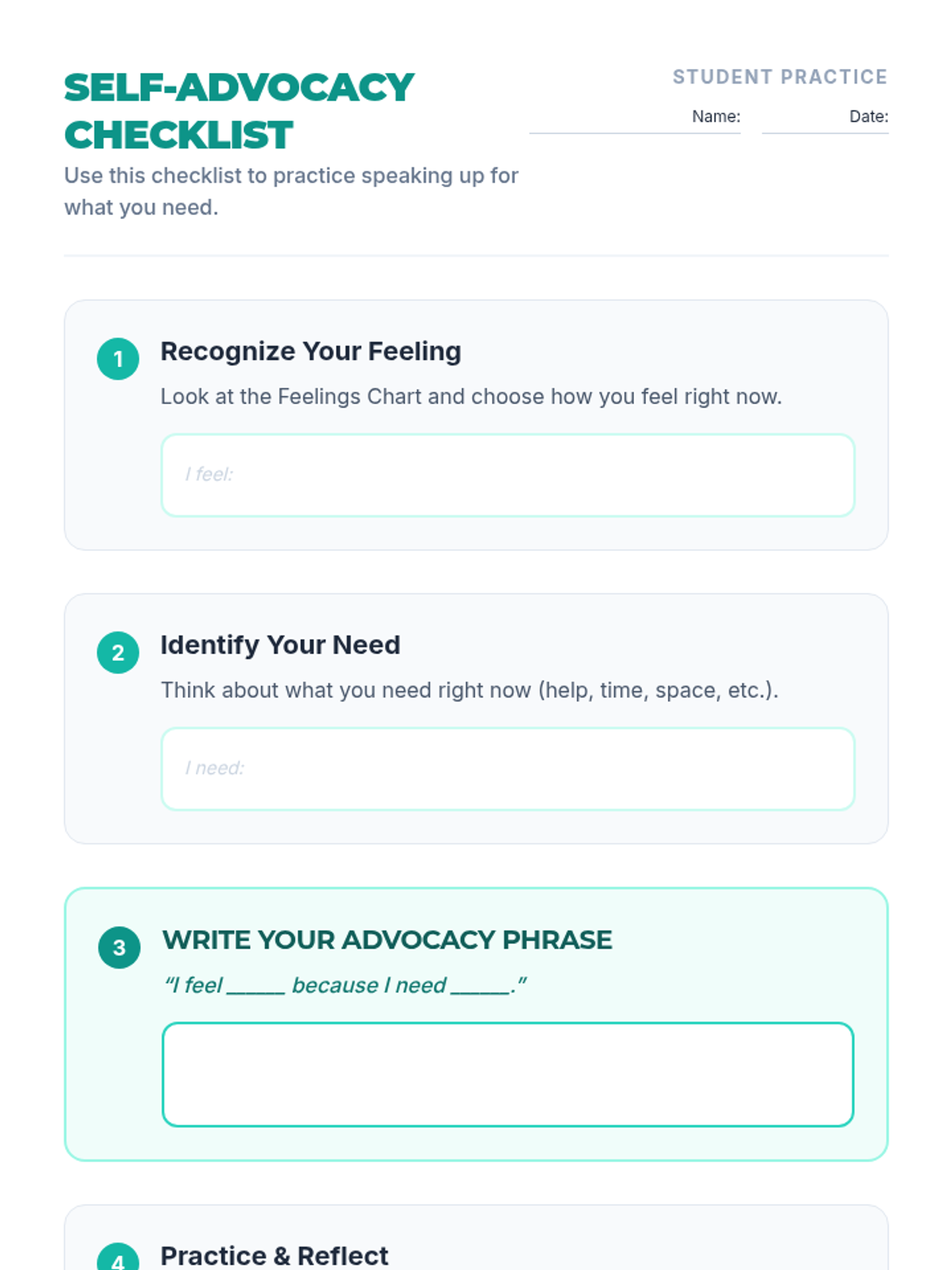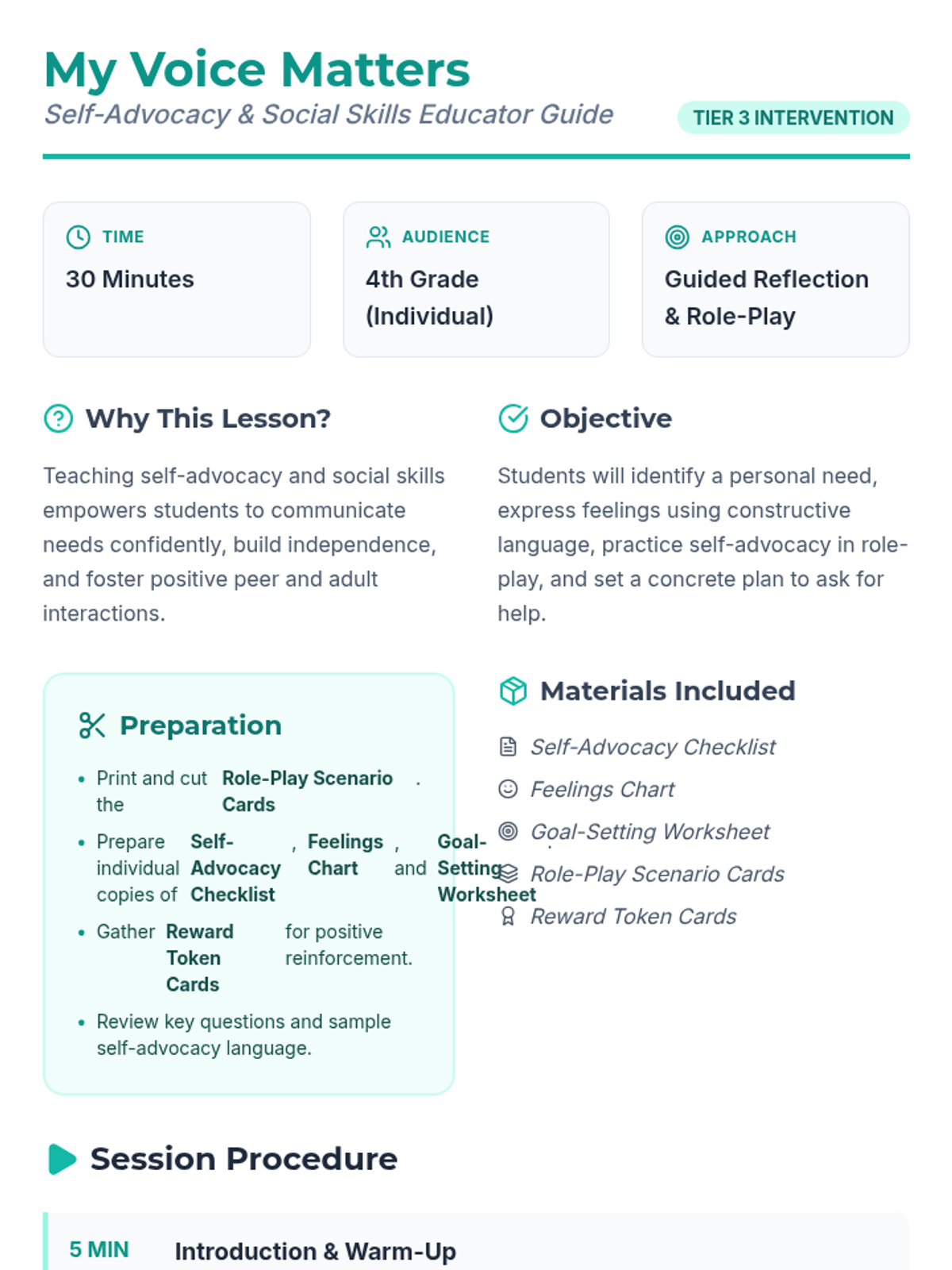 An empowering 30-minute individualized session for 4th graders to learn how to identify needs, express feelings, and set self-advocacy goals through role-play and structured planning.