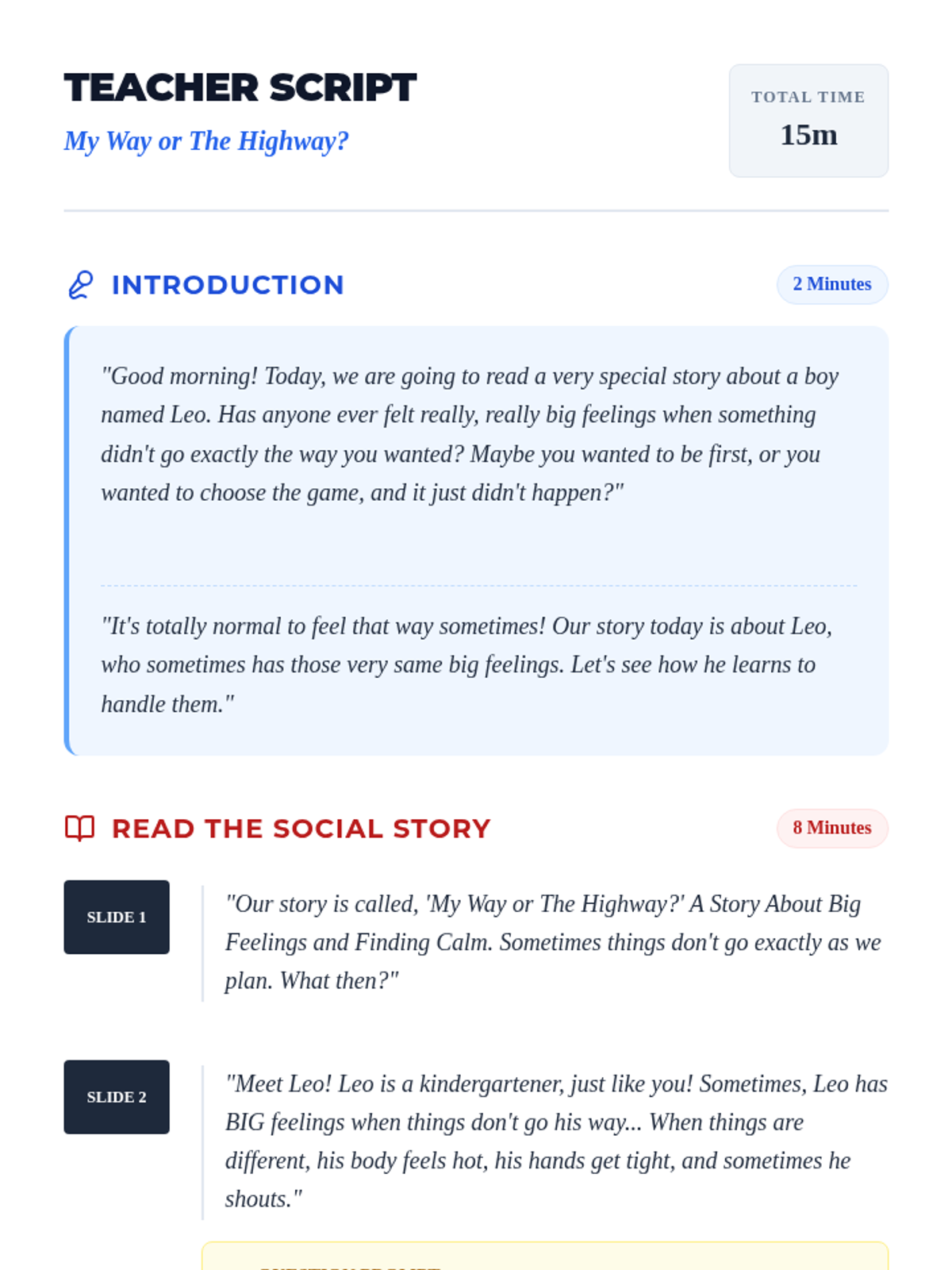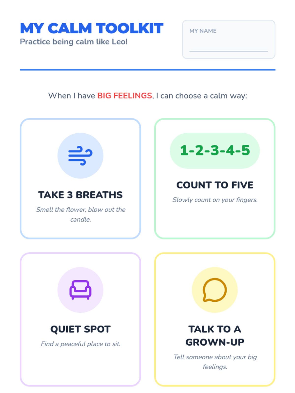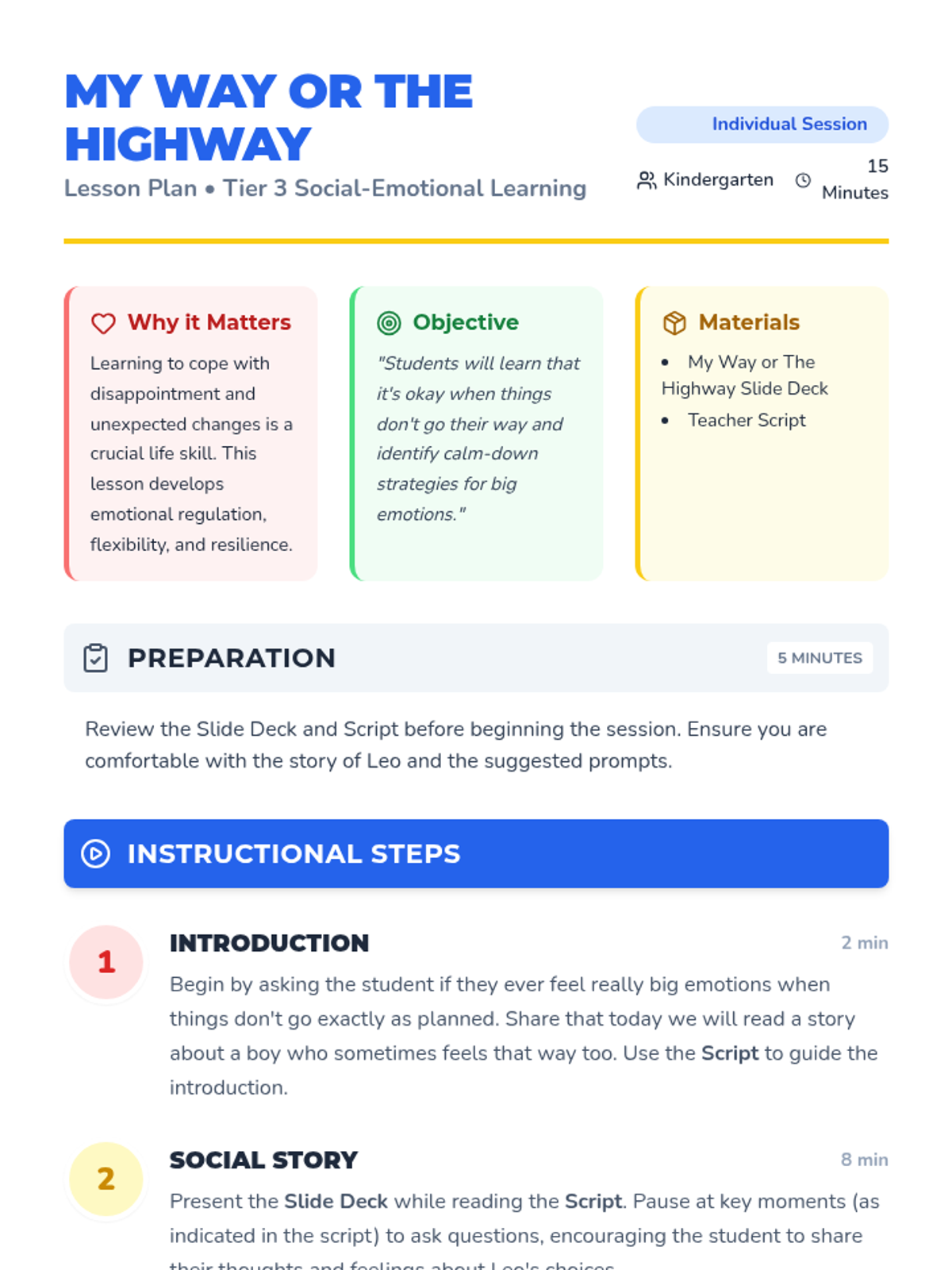 A Tier 3 social-emotional learning lesson for kindergarteners focused on managing big emotions and developing flexibility when things don't go their way. Students follow the story of Leo to learn calm-down strategies like deep breathing and counting.