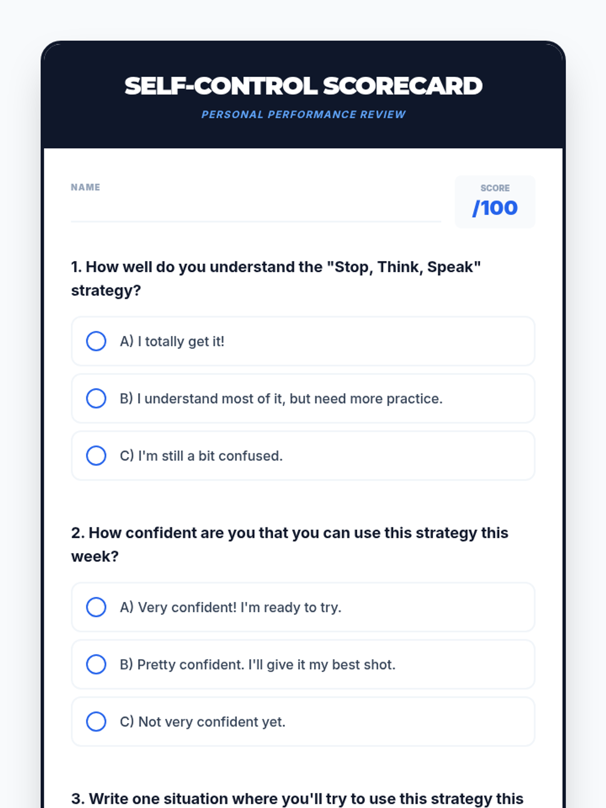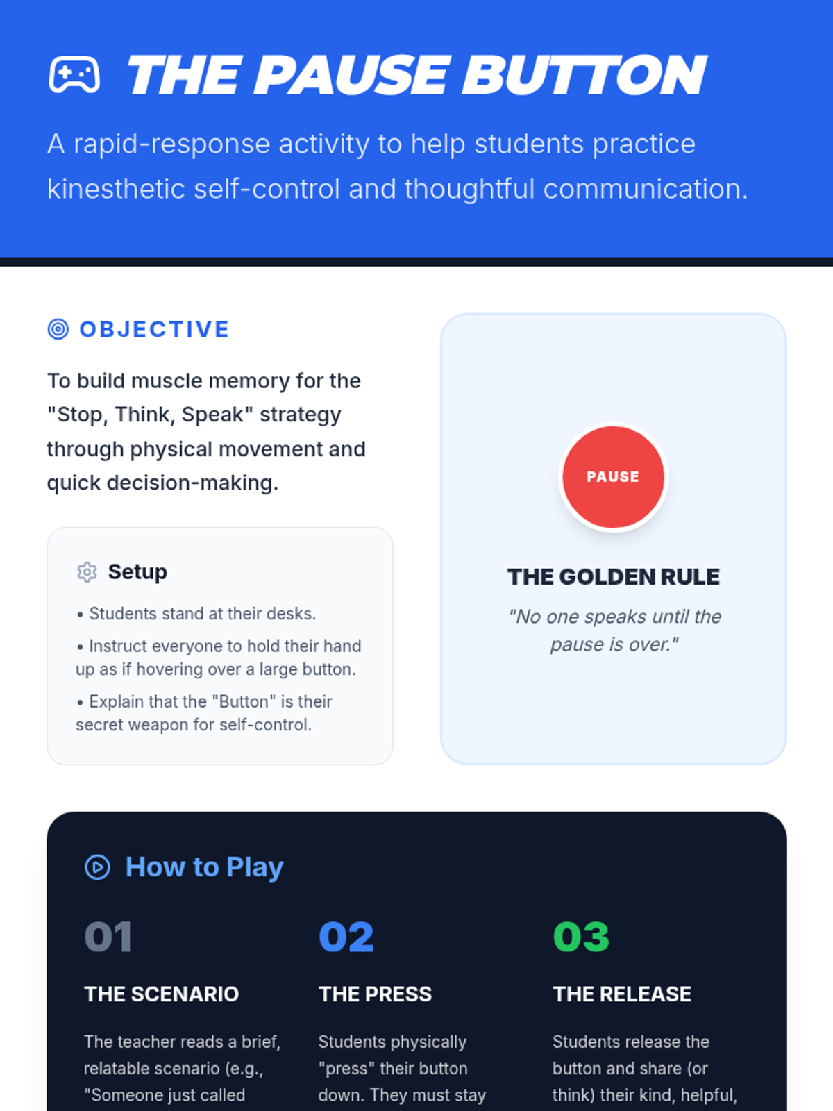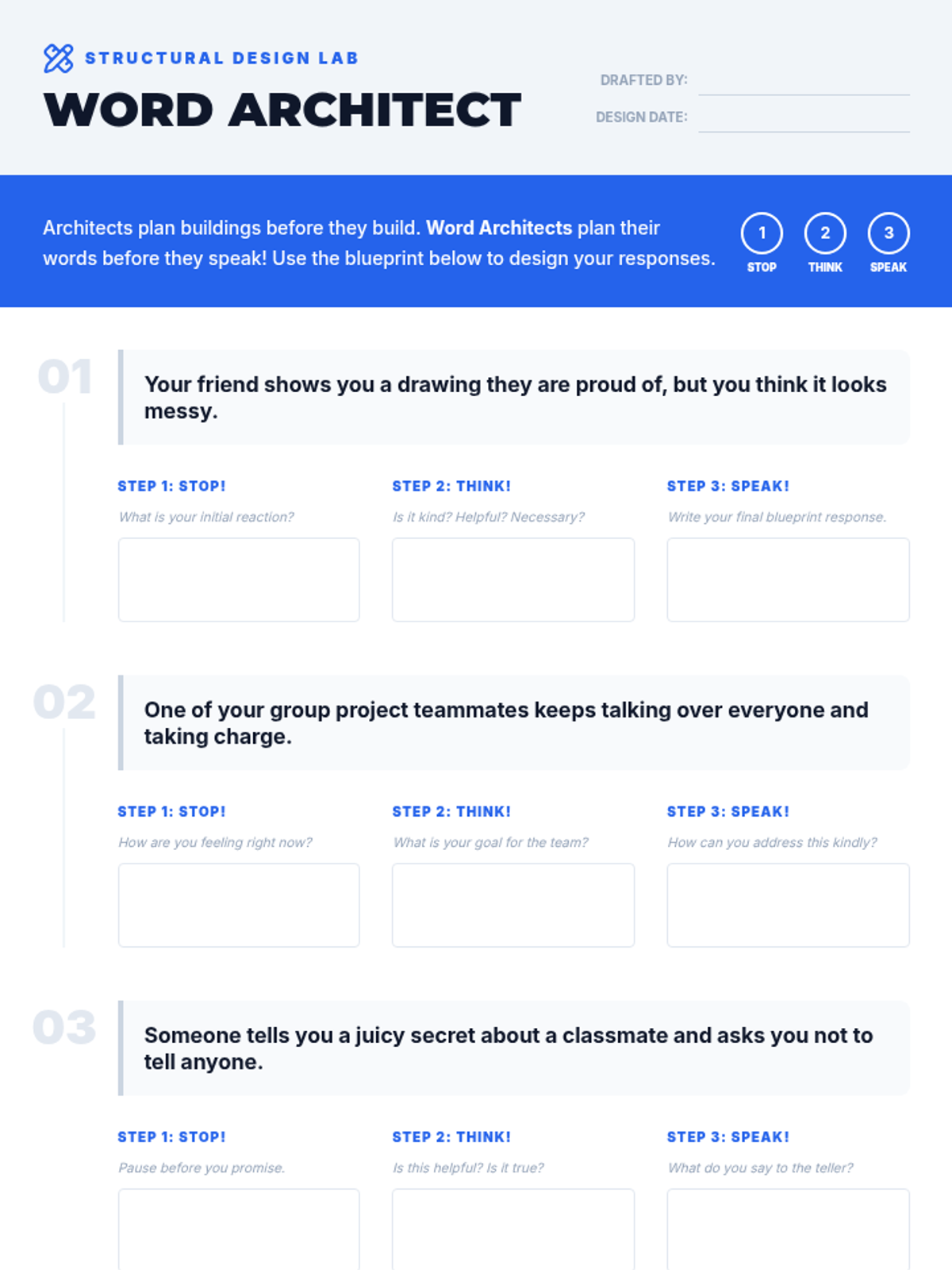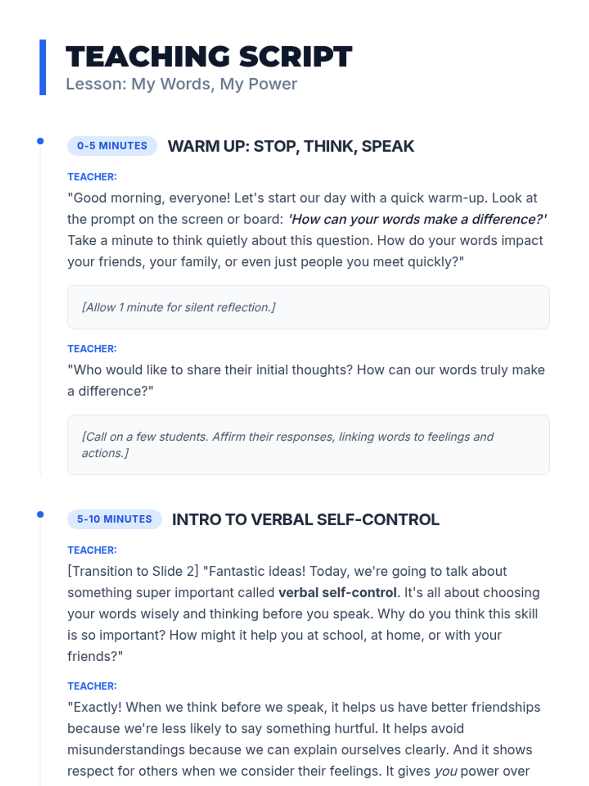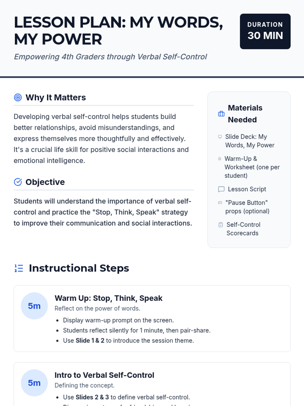 A 30-minute SEL lesson for 4th graders on verbal self-control using the 'Stop, Think, Speak' strategy. Students explore how words have power and practice pausing before reacting in social situations.