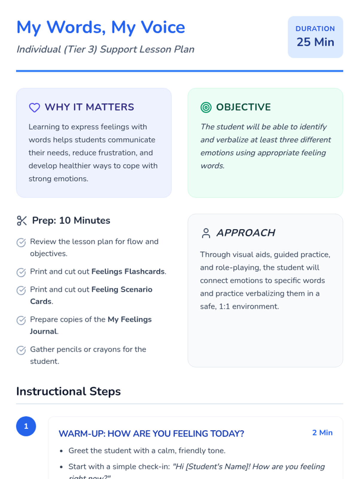 This Tier 3 individual support lesson helps 2nd-grade students identify and verbalize their emotions. Through visual aids, role-play, and journaling, students build the communication skills needed to reduce frustration and advocate for their needs.