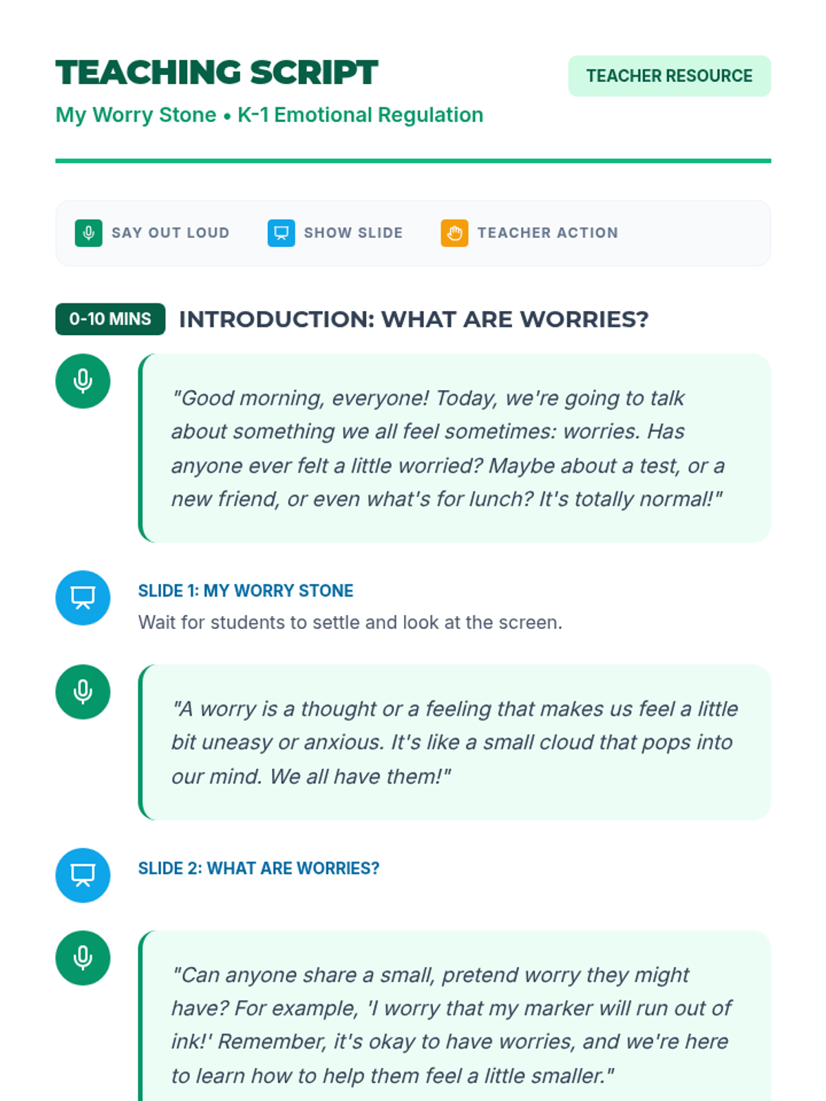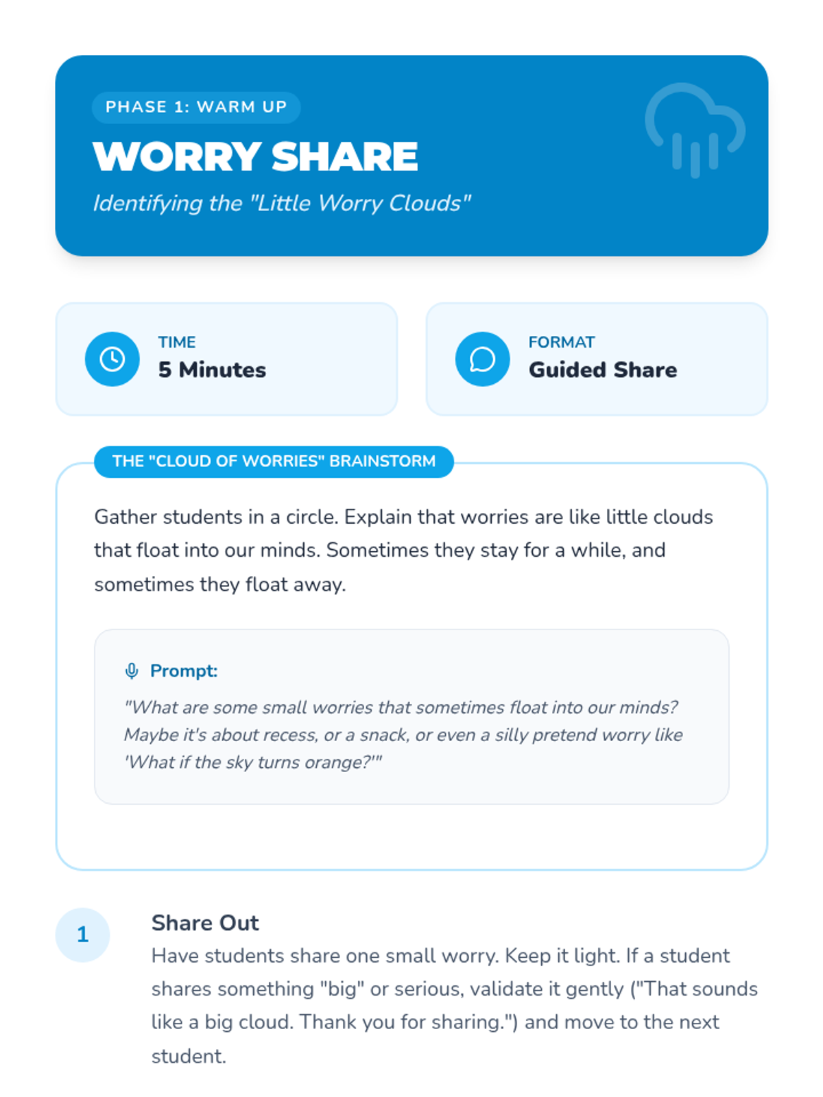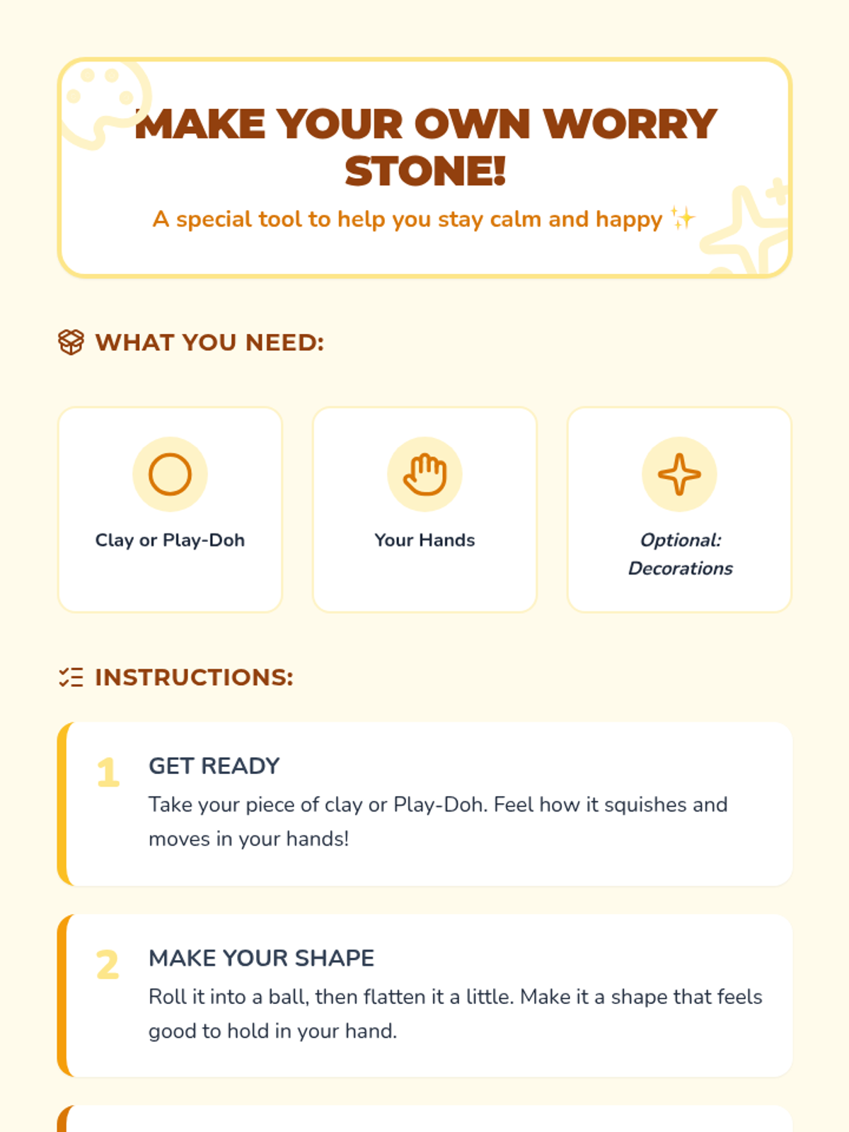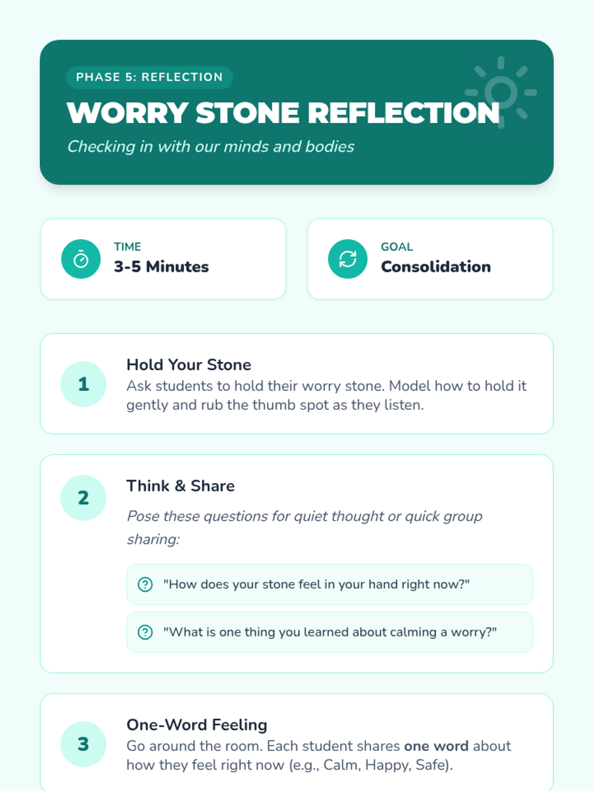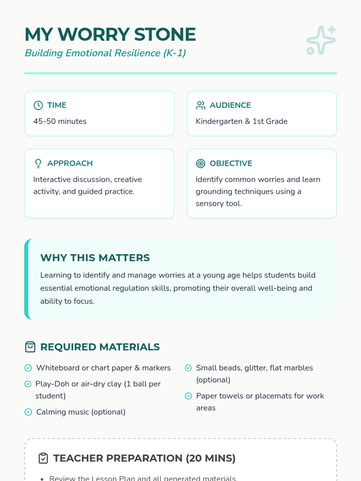 A gentle introduction to emotional regulation for K-1 students, teaching them to identify worries and use a handmade sensory 'worry stone' as a grounding tool.