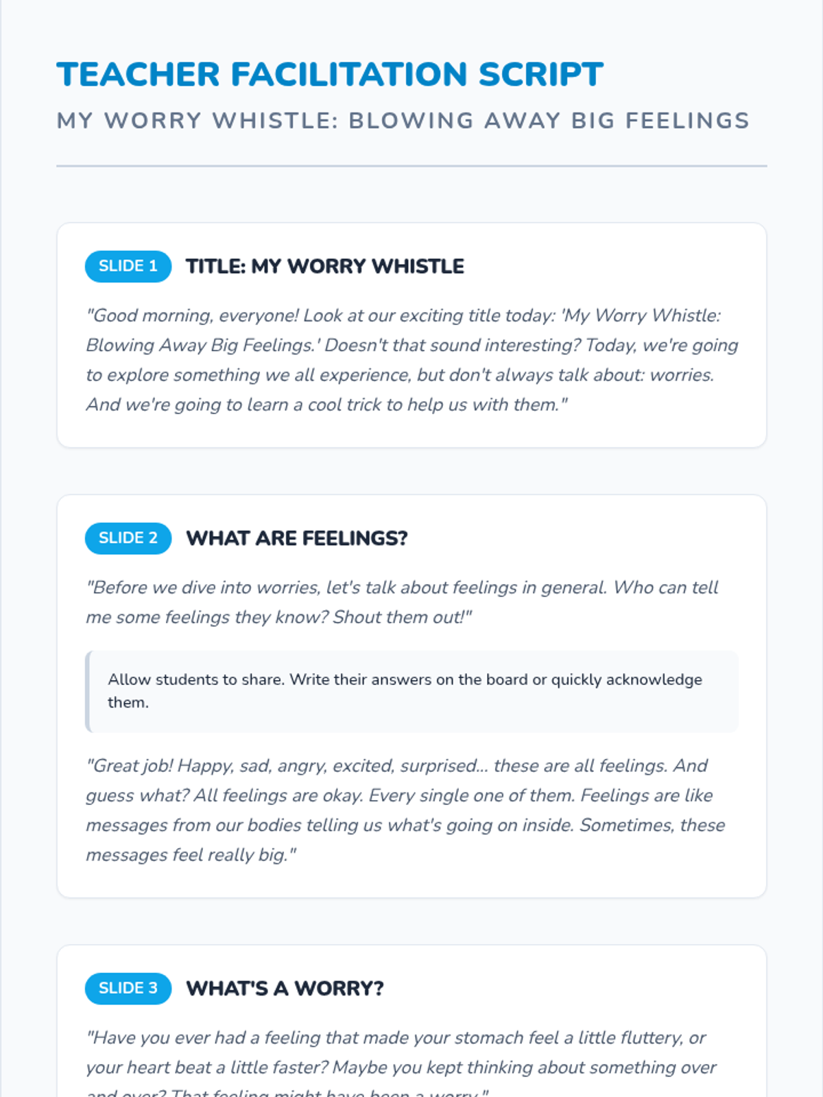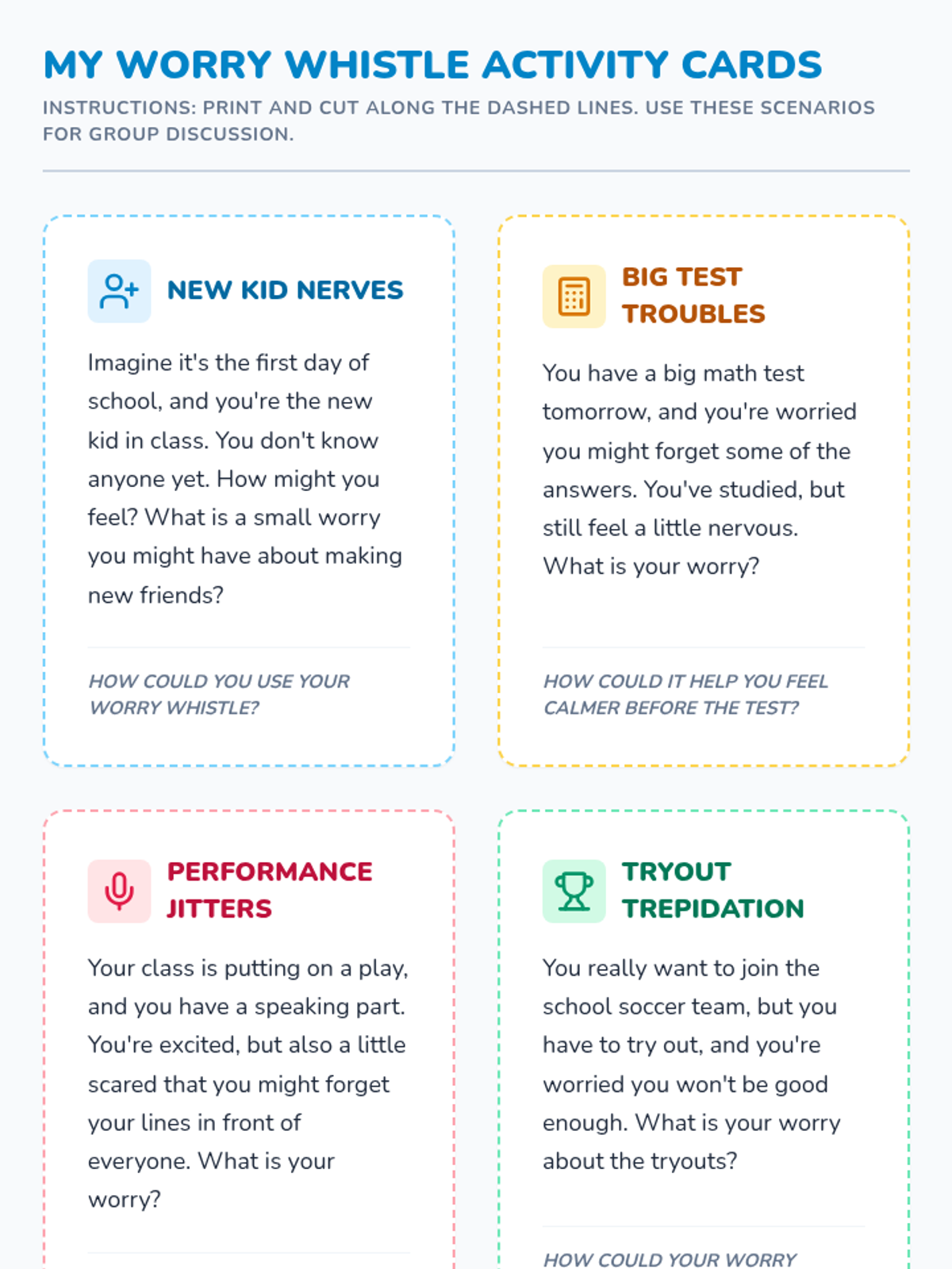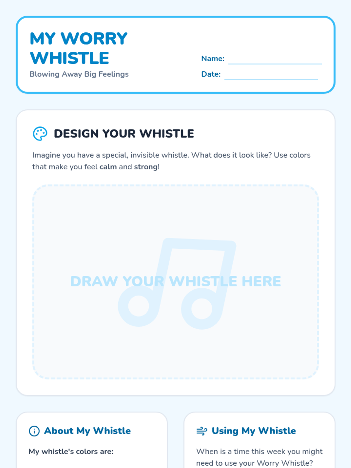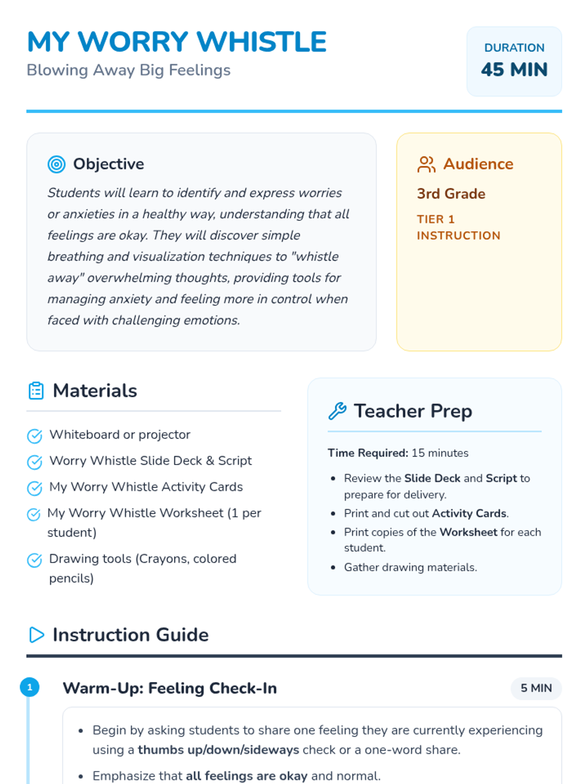 A 45-minute lesson for 3rd graders to help them identify and express worries using a 'worry whistle' breathing and visualization technique. Students will learn that all feelings are okay and practice managing anxiety through creative expression and mindfulness.